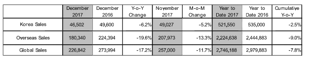 Celosvetový predaj dosiahol 2 746 188 automobilov, ktorými si nový majitelia obohatili svoju garáž. Ako to ale býva, s dobrými správami chodia ruka v ruke aj tie horšie. Napriek všetkému počet predaných modelov predstavuje pokles o 7,8% v porovnaní s rokom 2016. Predaj v Kórei ubudol o 2,5% (521 550 kusov) a zámorský predaj klesol celkovo o 9 % (2 224 638 kusov).