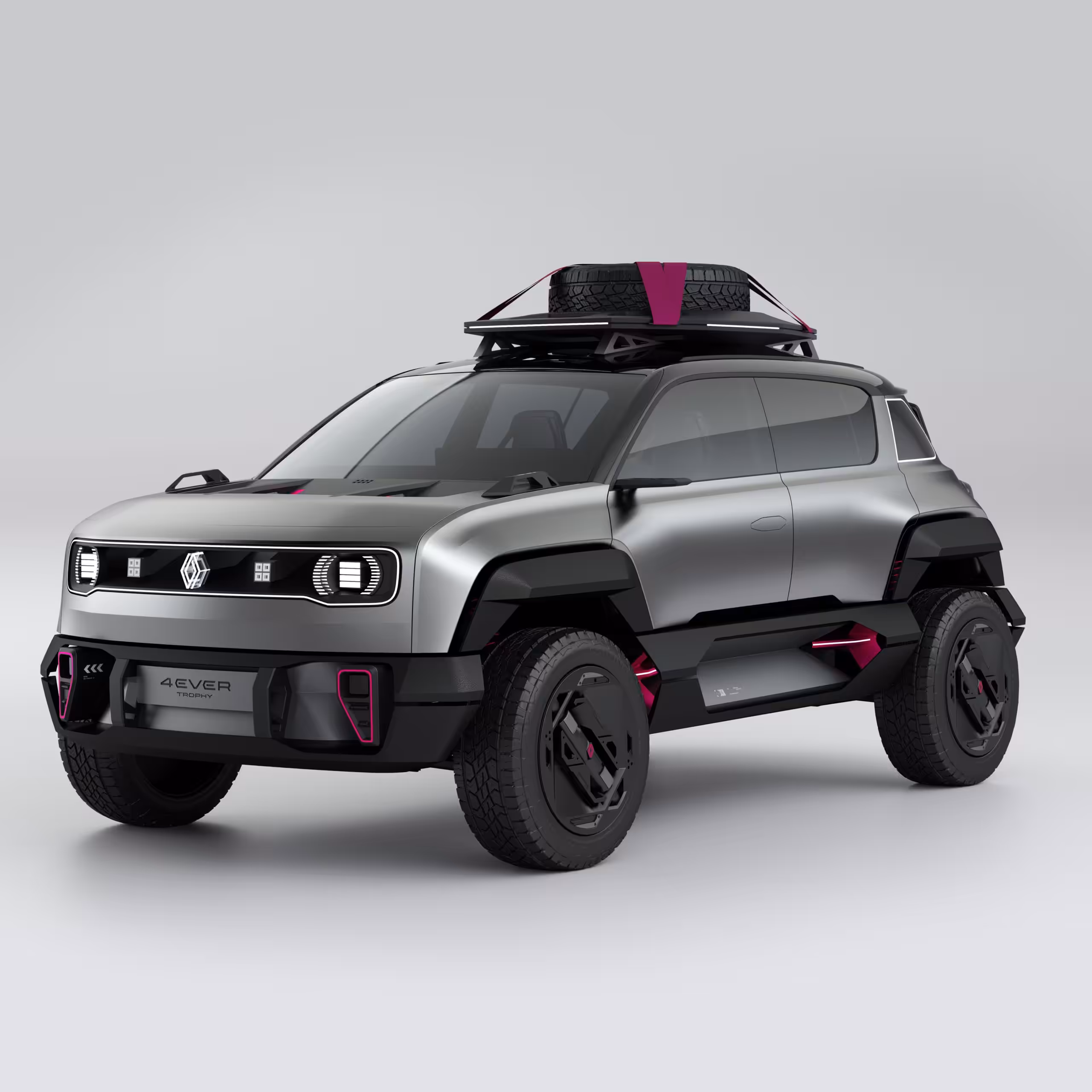 Renault 4EVER Trophy s dĺžkou 4160 mm, šírkou 1950 mm a výškou 1900 mm má moderne prepracovanú masku chladiča. Pôvodná široká horizontálna mriežka chladiča Renaultu bola vylepšená o okrúhle Matrix LED svetlá. Strieborná karoséria s výrazným oplastovaním a fialovými prvkami na streche, pružinách odpruženia a emblémoch kolies má dobrodružný nádych. Kapota má otvory vzduchu, ktoré výrazne zlepšujú účinnosť chladiča umiestneného v strede.