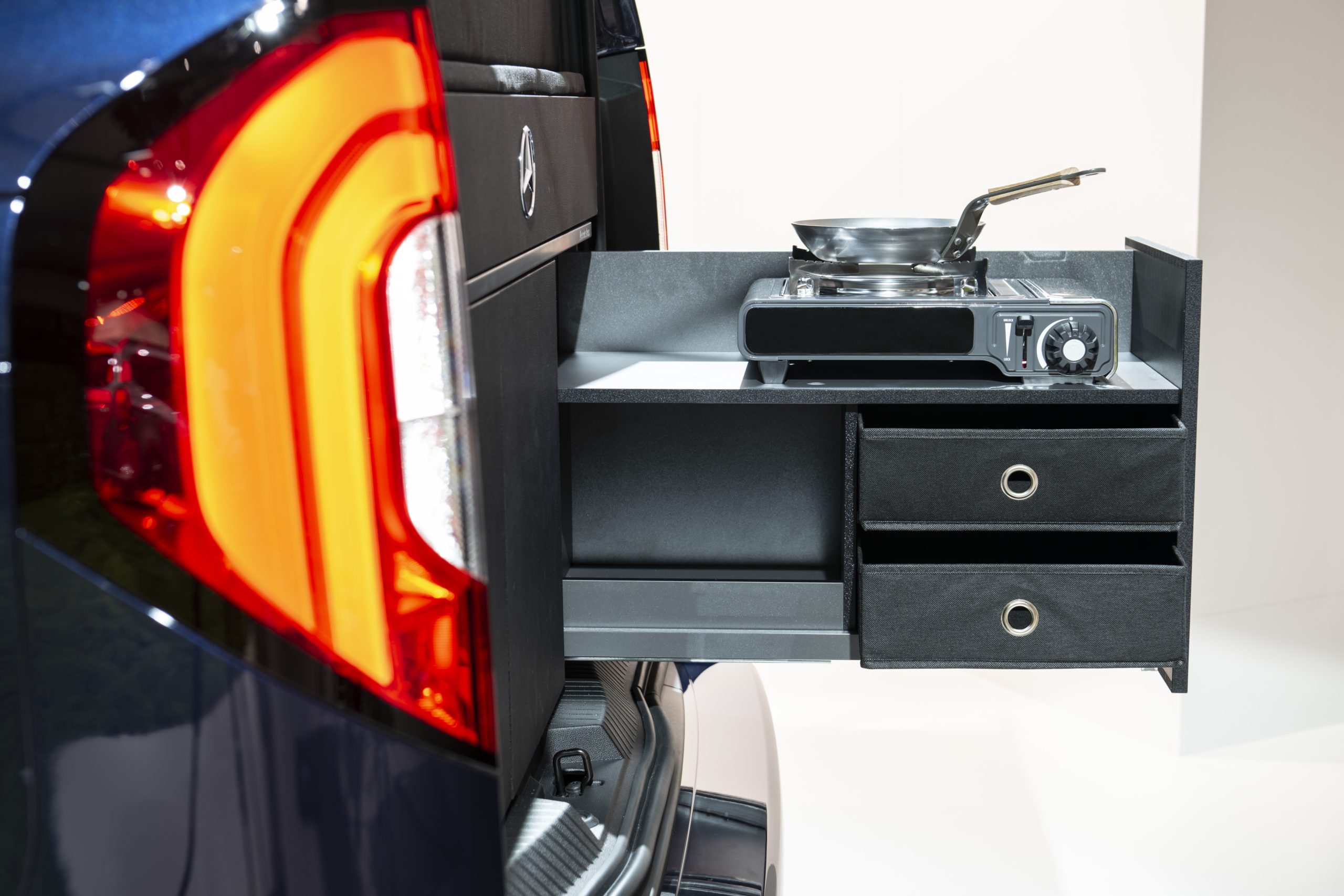 Priamo v druhom rade sedadiel za sedadlom vodiča sa nachádza prvok so zapusteným umývadlom a 16-litrovou kompresorovou chladiacou skrinkou. Vstavaný zásuvkový systém ponúka dostatočný úložný priestor pre kempingové príslušenstvo. K dispozícii je tiež indukčná varná doska a zásuvka, ktorú je možné vytiahnuť pomocou flexibilného odnímateľného plynového sporáka, takže existujú dve možnosti varenia. Na pravej strane vozidla je výklopný stôl, ktorý je elektricky výškovo nastaviteľný. Okrem toho sú tu zabudované ďalšie odkladacie priestory.