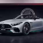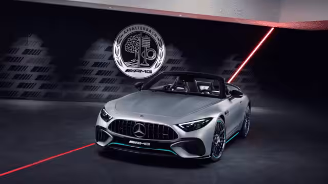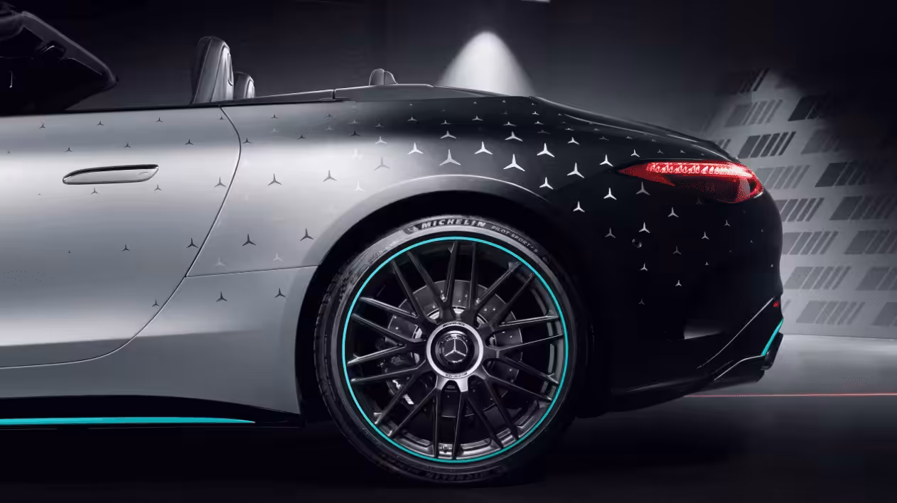 Fanúšikovia Formuly 1 okamžite spoznajú vzhľad, ktorý zdobí tento model SL 63 Motorsport Collection. Strieborná metalíza prechádzajúca do čiernej a vzor hviezd je podobný vzhľadu monopostu s označením W12 zo sezóny 2021. Nesmie chýbať ani odtieň jasne zelenej od sponzora tímu Mercedes-AMG F1, ktorým je spoločnosť Petronas. 21-palcové 10-lúčové kované disky AMG vyhotovili v matnej čiernej farbe. Kým nové SL môžete mať s tmavočervenou plátennou strechou, verzia Motorsport Collection využíva na streche čiernu tkaninu.