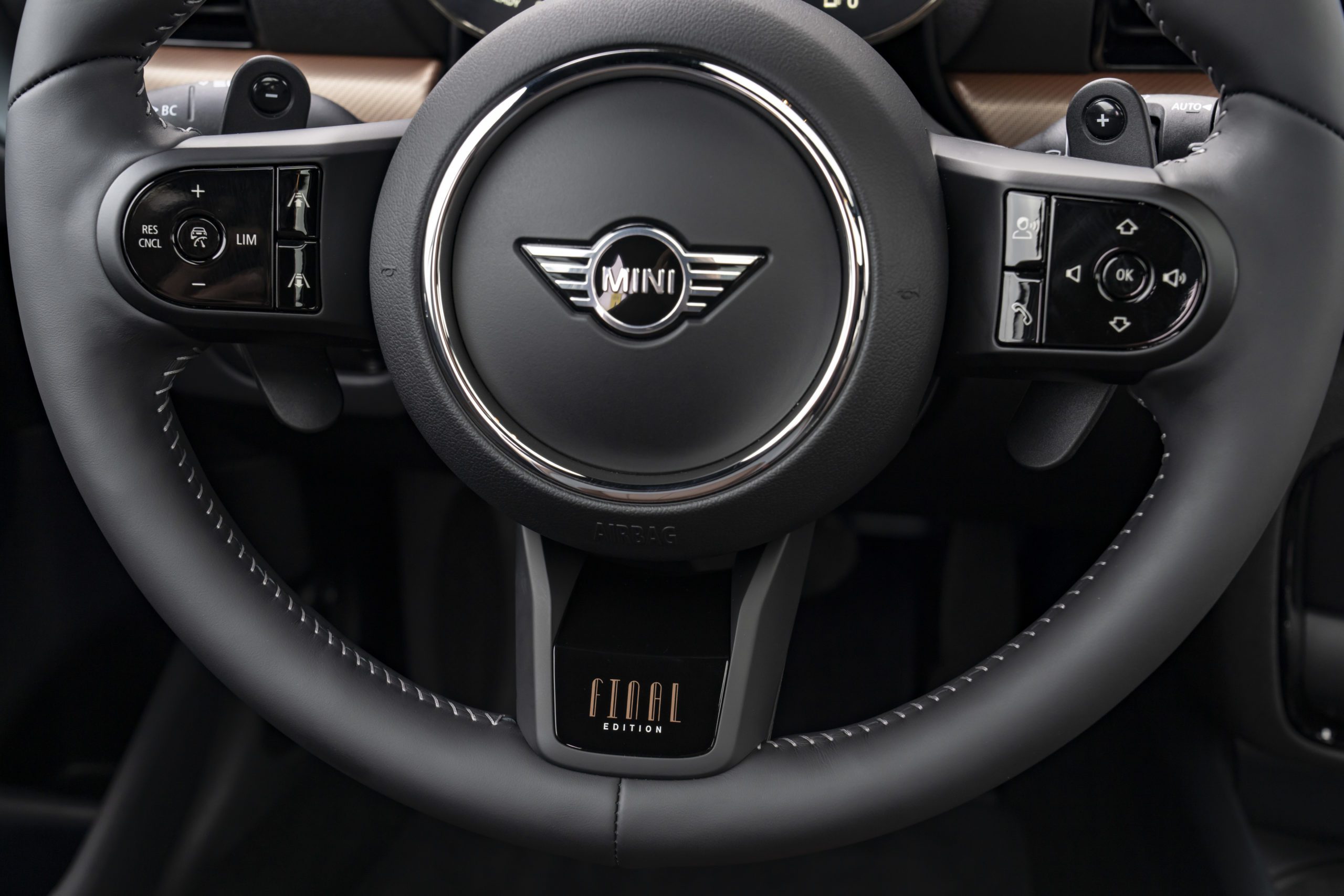 V kabíne nájdeme napríklad prahové lišty s nápisom Final Edition, rovnako tak sa toto označenie nachádza aj na spodnom ramene kožou obšitého volantu. Kožené športové sedadlá MINI Yours s nastaviteľnou opierkou stehien a všitým odznakom sú vyhotovené v hnedej farbe Dark Maroon. Štýlovo ich dopĺňa vložka z látky Piquet antracitovej farby a modré kontrastné prešívanie.