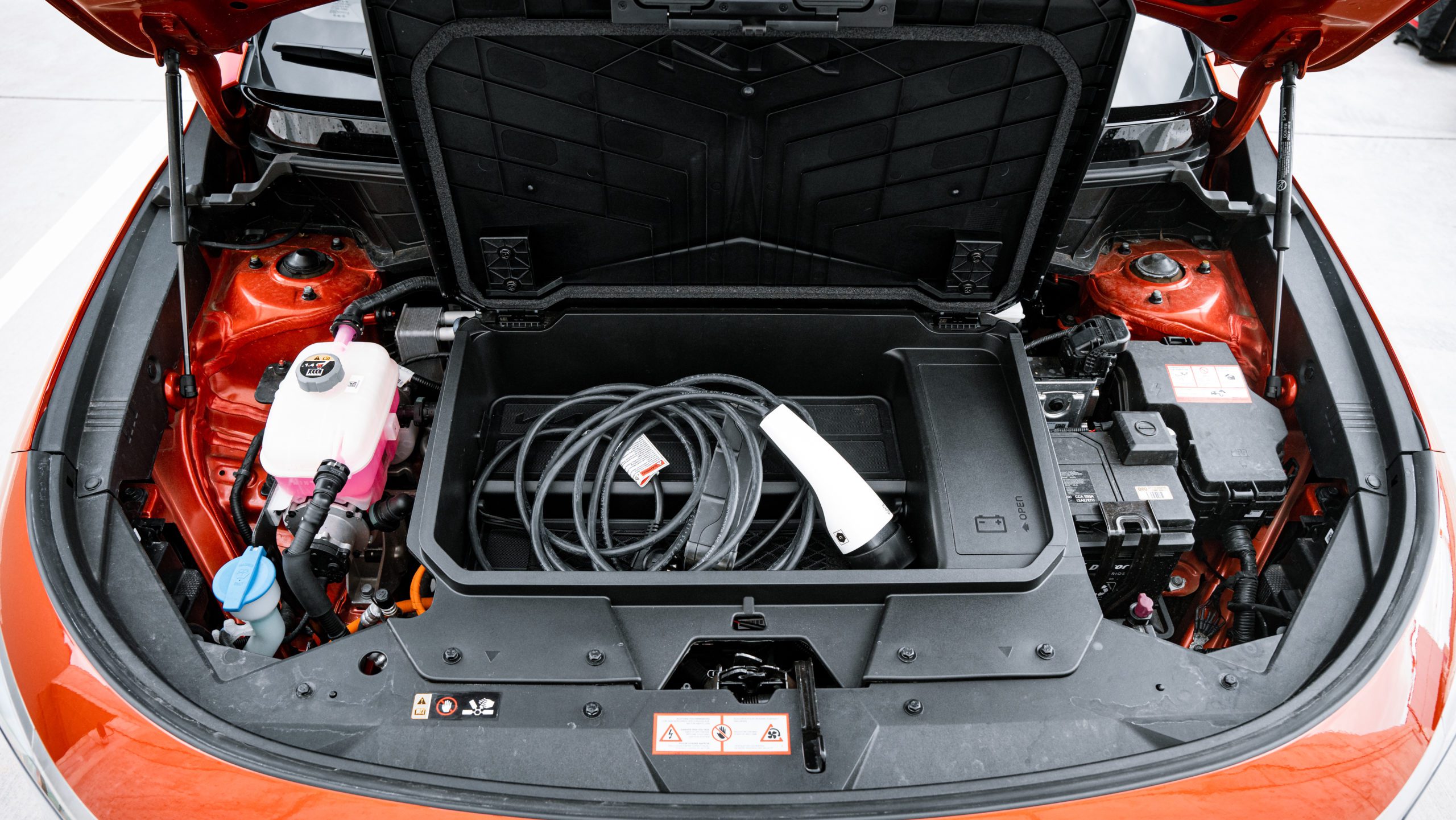 Druhá generácia elektrického Nira využíva aj priestor pod prednou kapotou, kde sa nachádza malá úložná schránka, ideálna na uloženie nabíjacieho káblu. Ten vám tak nezavadzia vzadu v kufri a navyše ho máte rýchlo poruke, keďže nabíjací port je vpredu.