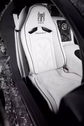 V interiéri je použitý rovnaký druh karbónu, biela koža a ambientné osvetlenie. Toto spojenie dodáva krásnu kulisu k vonkajšiemu vzhľadu a je jednoducho pripravený do boja. Cena žiaľ nie je nikde uvedená. To nový majiteľ automobilu neschváli. Ako je však vidno na tomto aute, jeho vzťah k peniazom je určite pozitívny, čo hovorí aj logo značky Bugatti na chladiči pozostávajúce z diamantov.