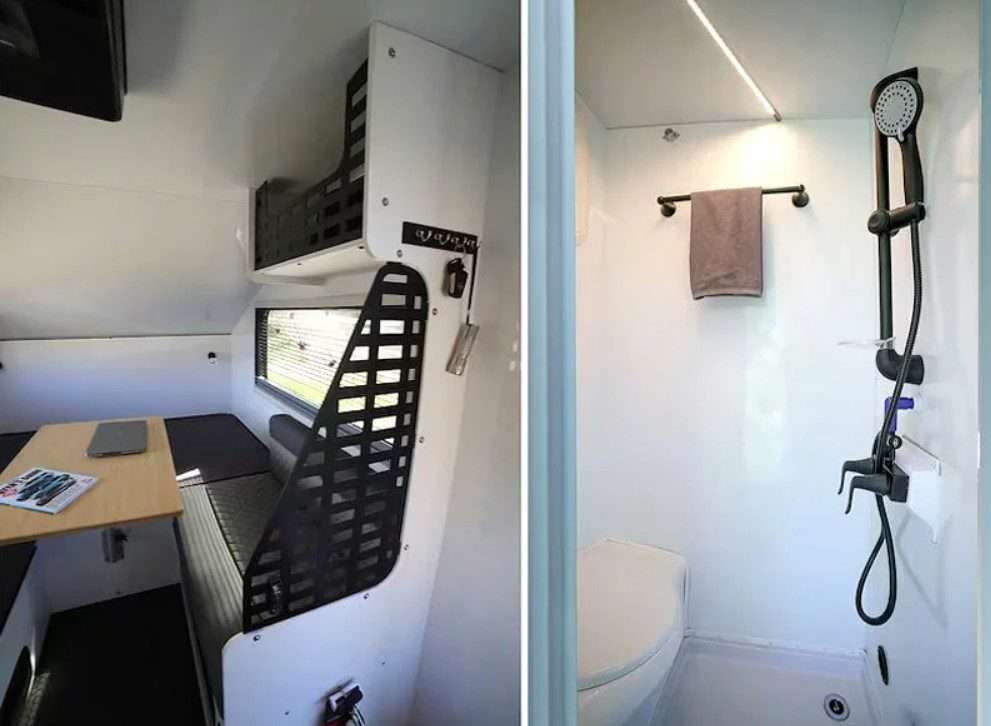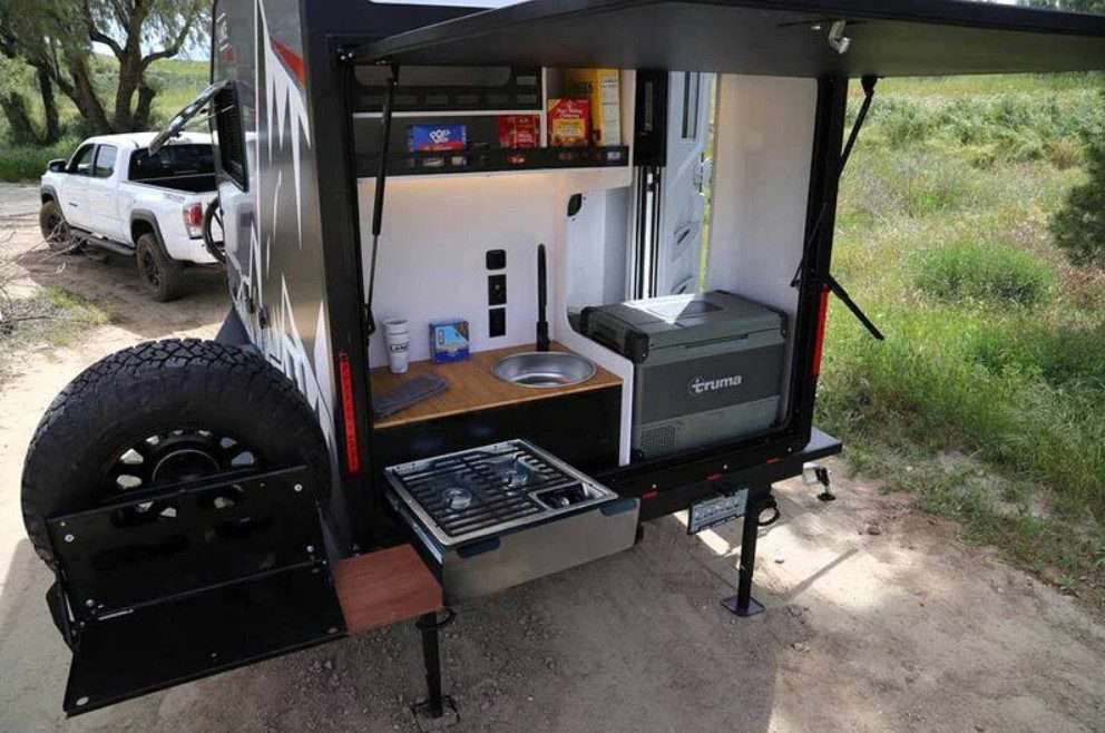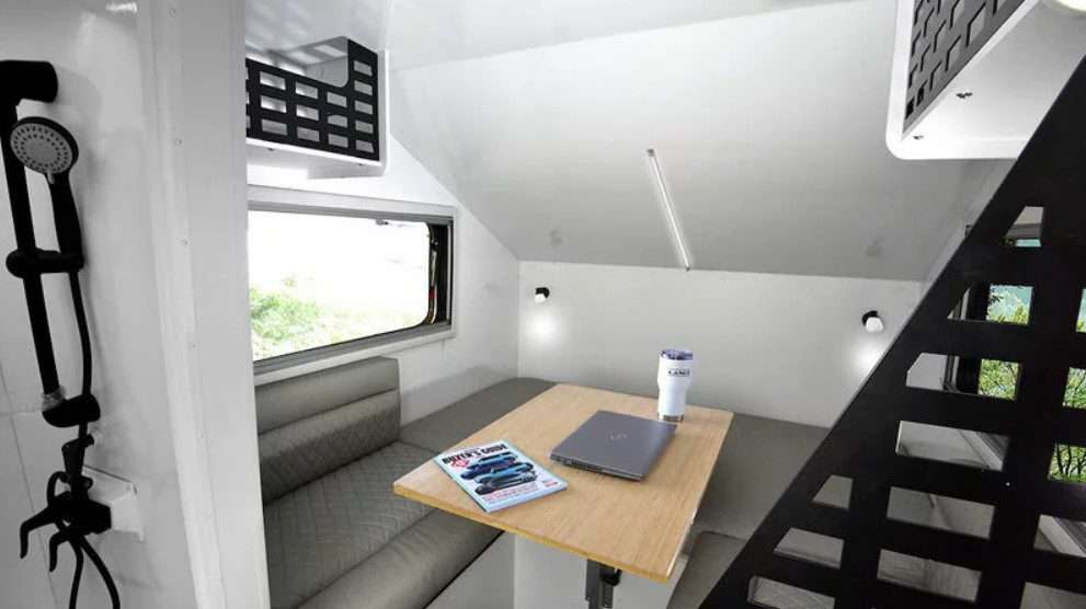Na spanie poslúži komfortná posteľ s rozmermi 203×183 cm. Aj priestor jedálne možno premeniť na priestor na spanie. V rámci udržiavania hygieny je k dispozícii kúpeľňa so spomínanou odnímateľnou toaletou. Určite treba spomenúť aj úložný priestor. Príves disponuje panelmi Molle, veľký priestor na uskladnenie vecí sa nachádza pod lôžkom a v prednom úložnom boxe. Ak sa rozhodnete zaobstarať si takýto príves, určite to nevyjde lacno. Cenovka tohto kusu začína na 70 tisíc dolároch.
