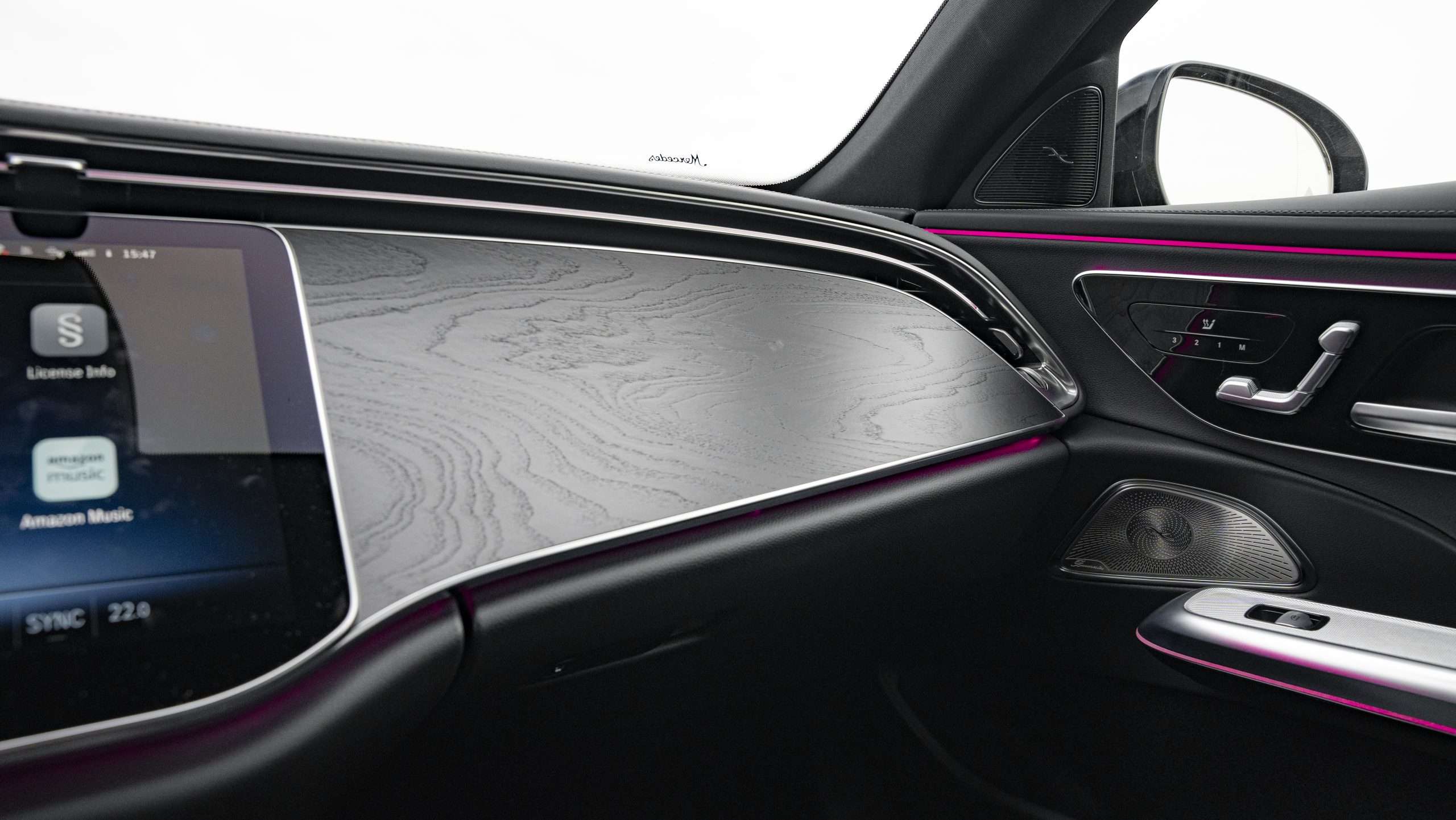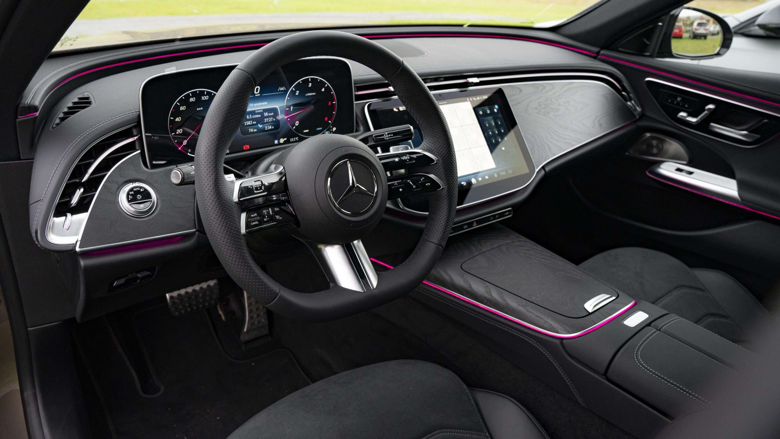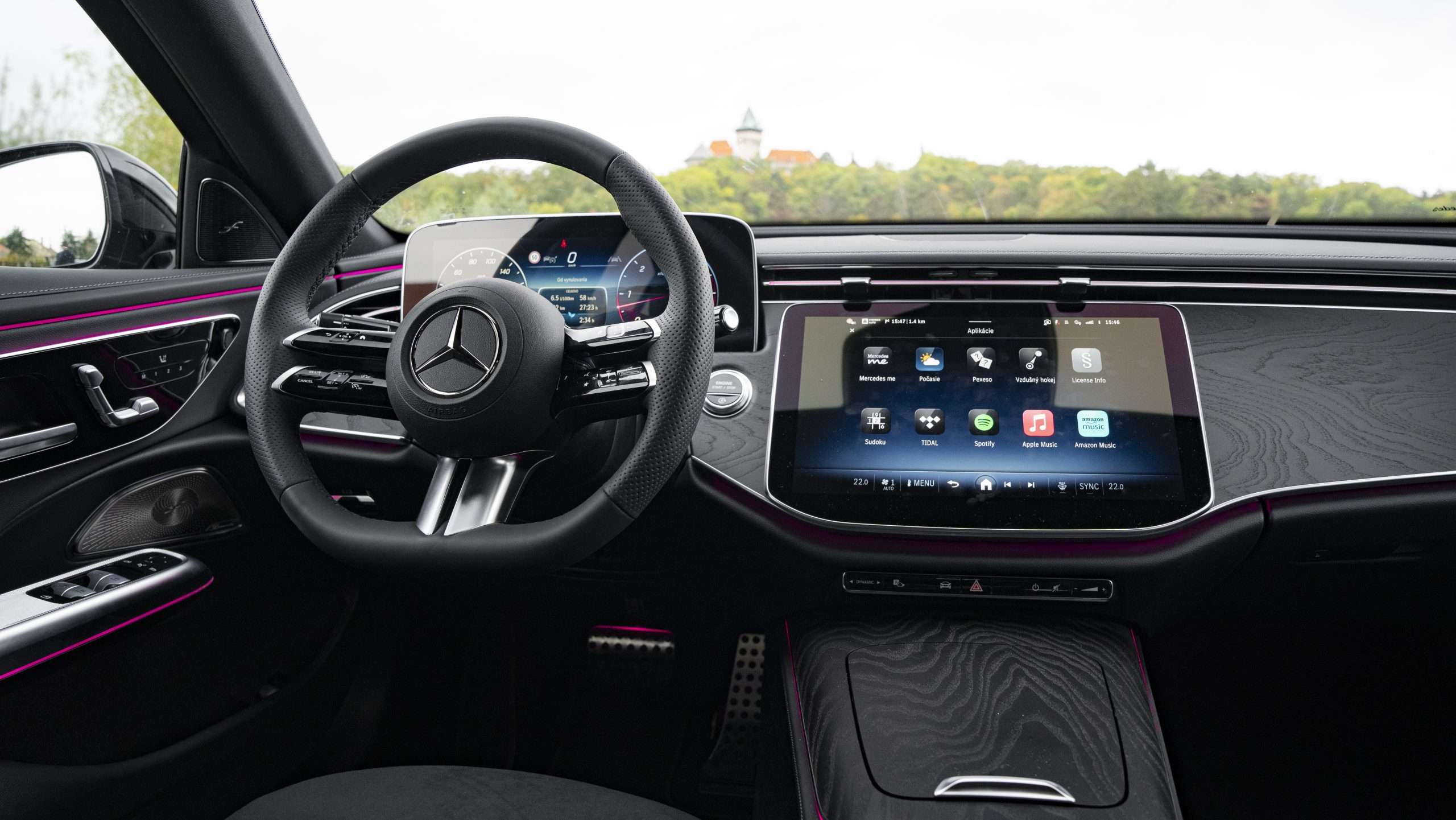 Ak by vás niekto zatvorí do kabíny nového Mercedesu bez toho, aby ste sa mohli oboznámiť s exteriérom, len veľmi ťažko by ste vedeli odhadnúť, že v akom modeli sa vlastne nachádzate. V prípade Triedy E tu však nachádzame úzky svetelný pás tiahnuci sa celou šírkou vrchnej časti palubnej dosky (niečo na štýl vozidiel značky Cupra). Špecialitou ambientného osvetlenia okrem toho, že je na výber celé spektrum farieb, je, že sa môže meniť v súlade s hudbou. Bohužiaľ, ani tento prvok sme nemohli vidieť na vlastné oči.