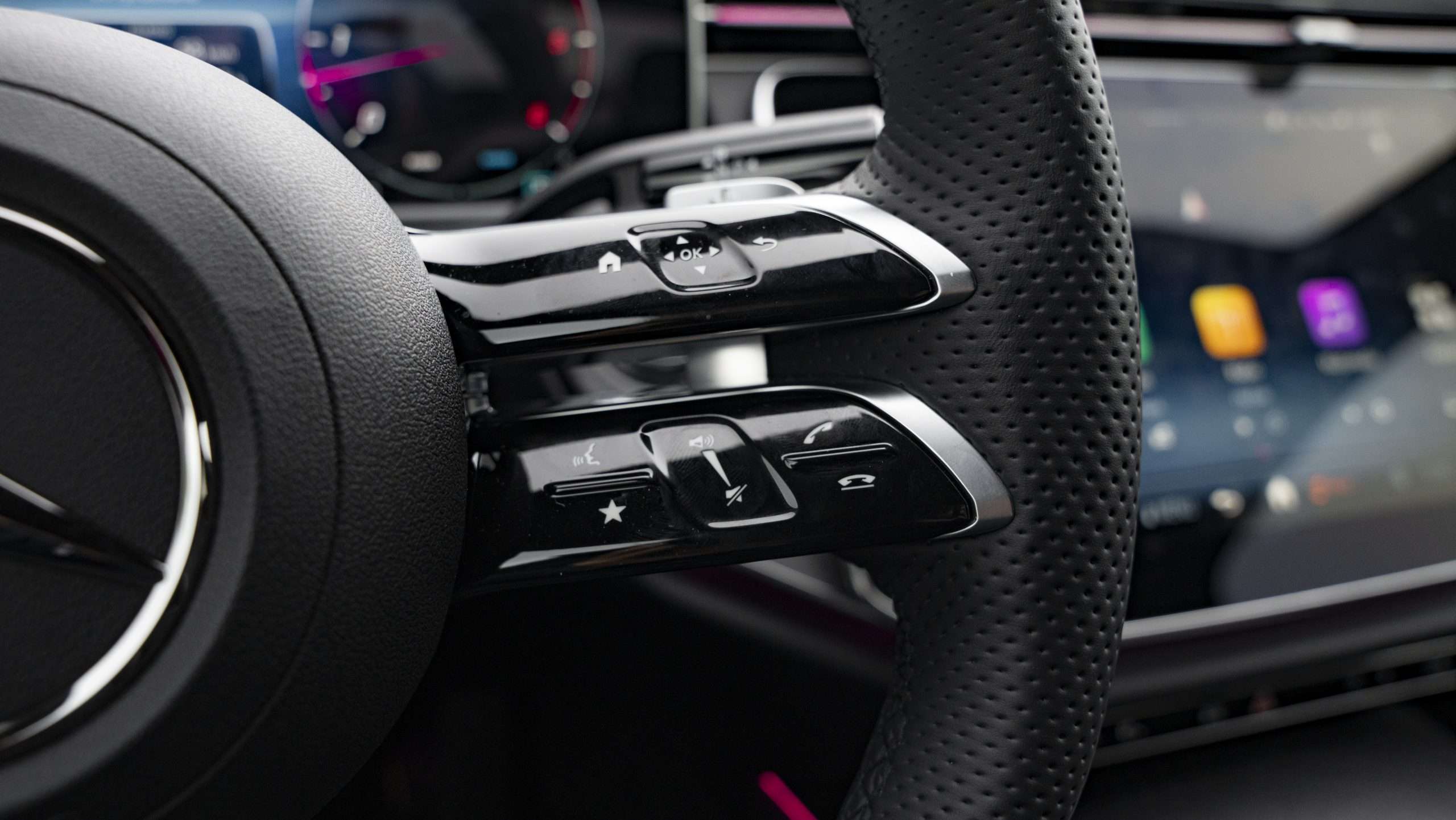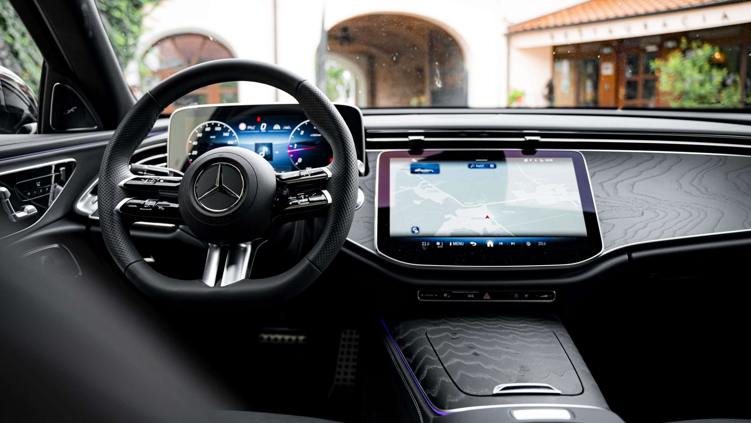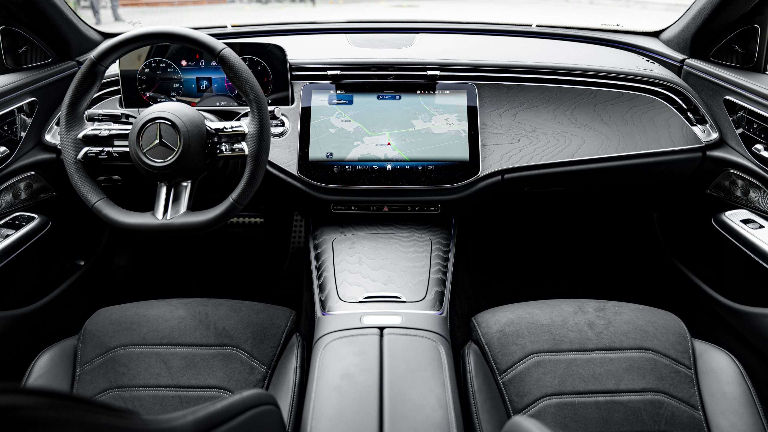 Vo výbave sa taktiež nachádza Superscreen so samostatnou obrazovkou pre predného spolujazdca. Verzie bez displeja spolujazdca majú na tomto mieste veľký ozdobný prvok. Samozrejme, Trieda E medzigeneračne narástla (+ 4 cm do dĺžky a + 3 cm do šírky) a zlepšili sa aj priestorové možnosti v kabíne. Vodič má o päť milimetrov viac miesta nad hlavou, priestor na kolená a maximálny priestor na nohy vzadu sa zväčšili o 10, resp. o 17 milimetrov. Šírka v oblasti lakťov vzadu sa zväčšila o 25 milimetrov na 1 519 milimetrov, čo je takmer na úrovni Triedy S. Základný objem batožinového priestoru predstavuje až 540 litrov. Po usadení na zadné sedadlá nás však trochu zarazili dve veci – operadlá zadných sedadiel nie sú polohovateľné a vo výbave chýba aj možnosť ventilácie sedadiel. Tá je možná len pre sedadlá vpredu, samozrejme, vyhrievané môžu byť všetky sedadlá. Panoramatická strecha je rozdelená priečkou, jej otvorenie nie je možné.