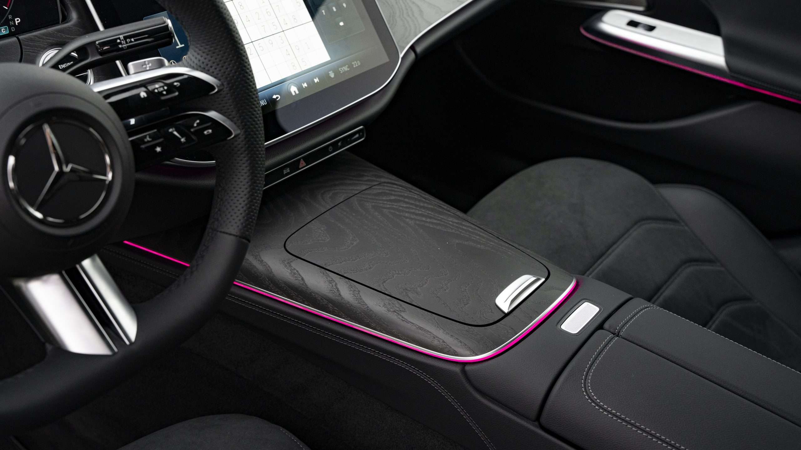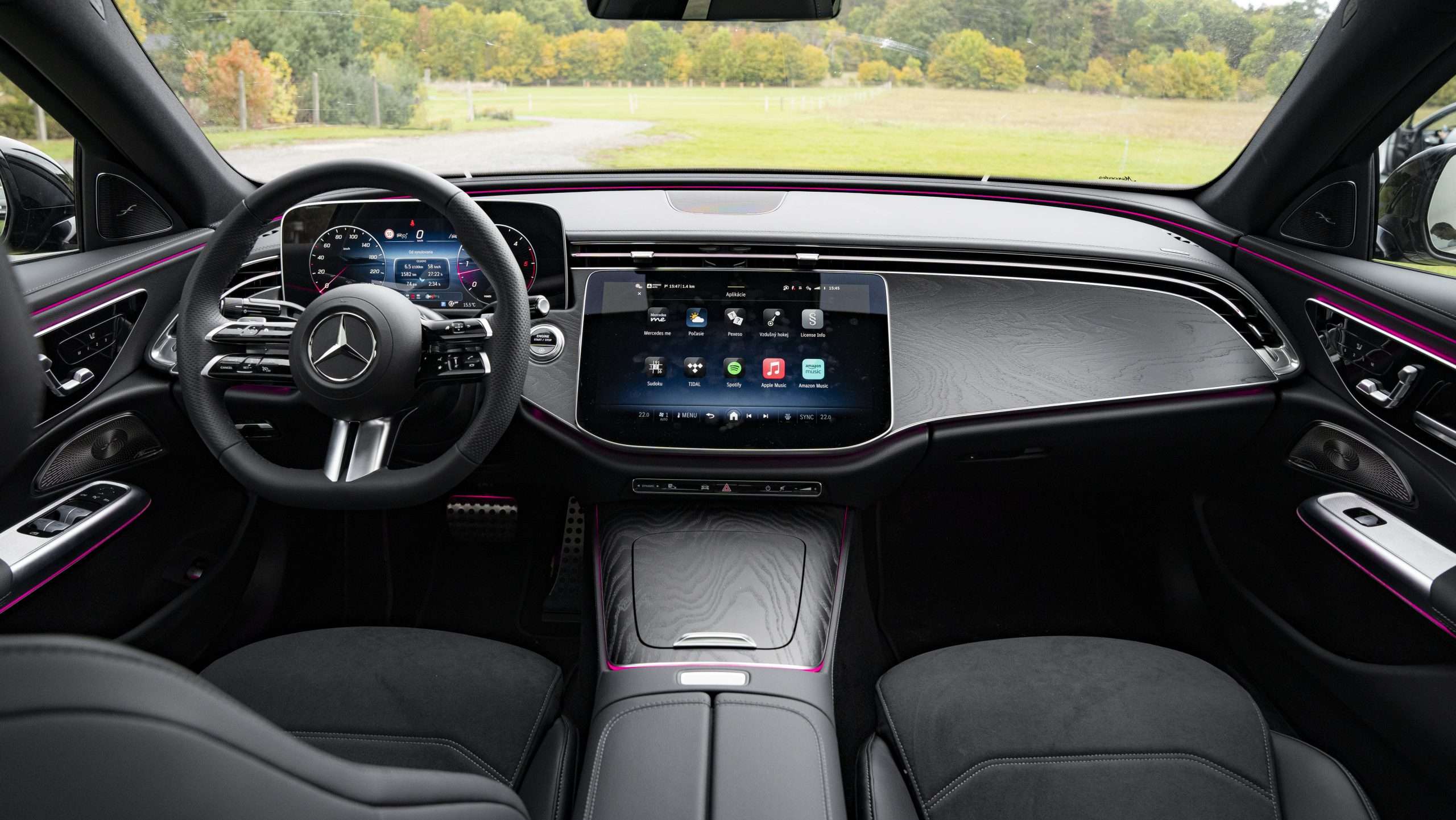 Ak by vás niekto zatvorí do kabíny nového Mercedesu bez toho, aby ste sa mohli oboznámiť s exteriérom, len veľmi ťažko by ste vedeli odhadnúť, že v akom modeli sa vlastne nachádzate. V prípade Triedy E tu však nachádzame úzky svetelný pás tiahnuci sa celou šírkou vrchnej časti palubnej dosky (niečo na štýl vozidiel značky Cupra). Špecialitou ambientného osvetlenia okrem toho, že je na výber celé spektrum farieb, je, že sa môže meniť v súlade s hudbou. Bohužiaľ, ani tento prvok sme nemohli vidieť na vlastné oči.