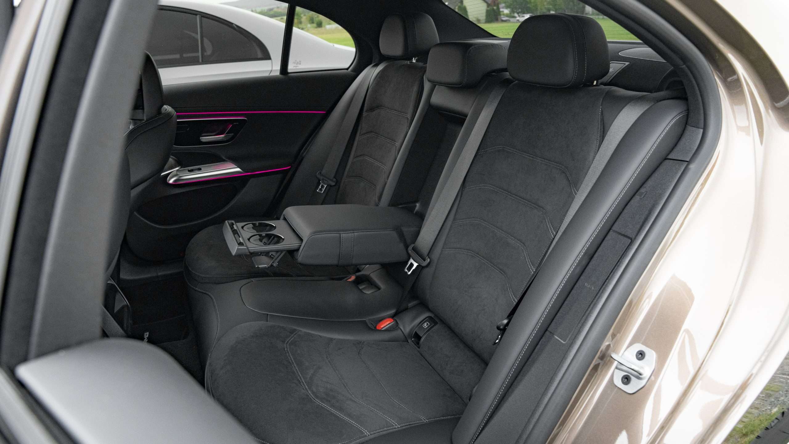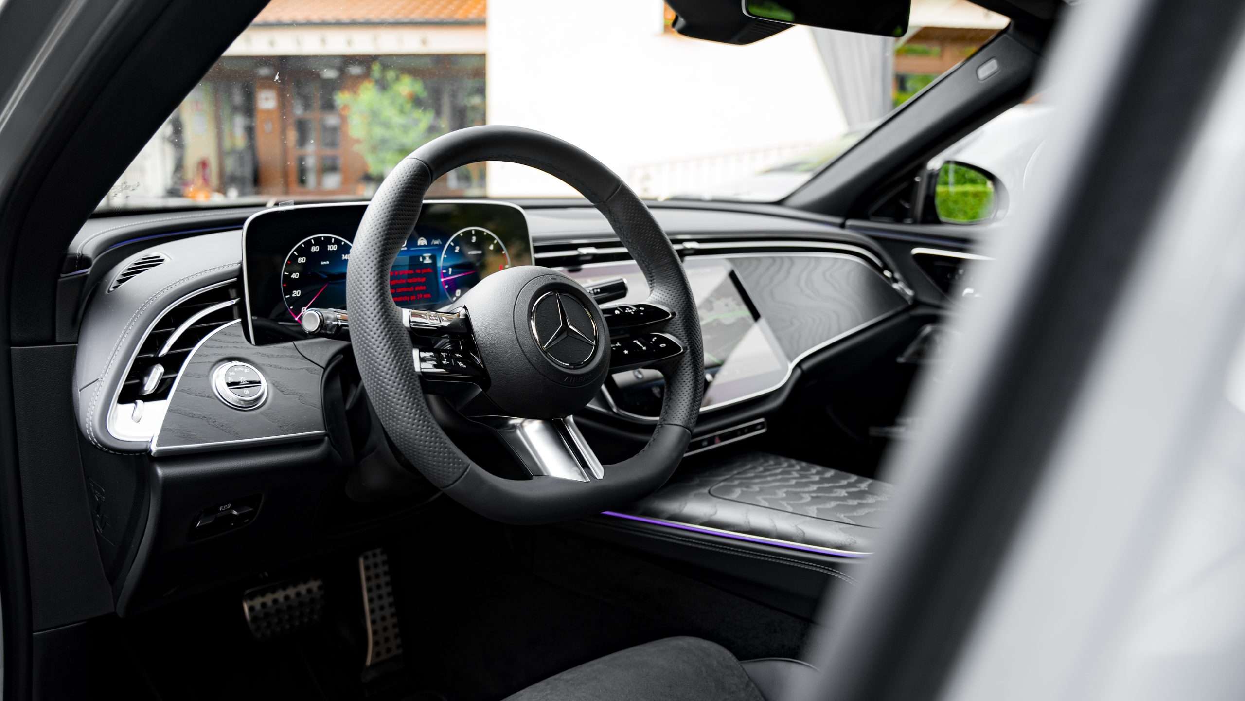 Vo výbave sa taktiež nachádza Superscreen so samostatnou obrazovkou pre predného spolujazdca. Verzie bez displeja spolujazdca majú na tomto mieste veľký ozdobný prvok. Samozrejme, Trieda E medzigeneračne narástla (+ 4 cm do dĺžky a + 3 cm do šírky) a zlepšili sa aj priestorové možnosti v kabíne. Vodič má o päť milimetrov viac miesta nad hlavou, priestor na kolená a maximálny priestor na nohy vzadu sa zväčšili o 10, resp. o 17 milimetrov. Šírka v oblasti lakťov vzadu sa zväčšila o 25 milimetrov na 1 519 milimetrov, čo je takmer na úrovni Triedy S. Základný objem batožinového priestoru predstavuje až 540 litrov. Po usadení na zadné sedadlá nás však trochu zarazili dve veci – operadlá zadných sedadiel nie sú polohovateľné a vo výbave chýba aj možnosť ventilácie sedadiel. Tá je možná len pre sedadlá vpredu, samozrejme, vyhrievané môžu byť všetky sedadlá. Panoramatická strecha je rozdelená priečkou, jej otvorenie nie je možné.