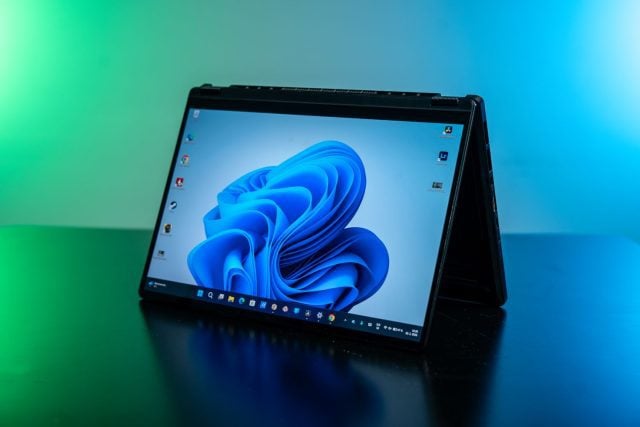 Vysoké rozlíšenie uľahčuje prácu s viacerými oknami naraz vedľa seba a vernosť farieb napríklad dofarbovanie videí či úpravu fotiek. OLED technológia ponúka aj perfektný kontrast čiernej. Plne dotykový displej drží prakticky v akomkoľvek uhle, ale dá sa aj plne preklopiť do režimu tabletu. V tom systém vypne hardvérovú klávesnicu, aby ste si počítač mohli položiť aj na kolená alebo celý „tablet“ podať napríklad klientom pri prezentáciách svojej tvorby.