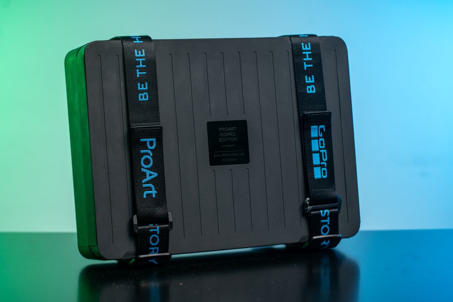 Kým väčšinu bežných notebookov zvykneme rozbaľovať z nevzhľadných krabíc, v tomto prípade na to ASUS išiel úplne naopak. To hlavné prichádza v prémiovo pôsobiacej čiernej škatuli. Hoci je stále papierová, je previazaná hrubými pásmi na suchý zips s logami GoPro. V útrobách krabice nájdete ešte jeden špičkovo spracovaný obal, tentokrát už priamo na počítač, do ktorého ho môžete bezpečne zazipsovať.