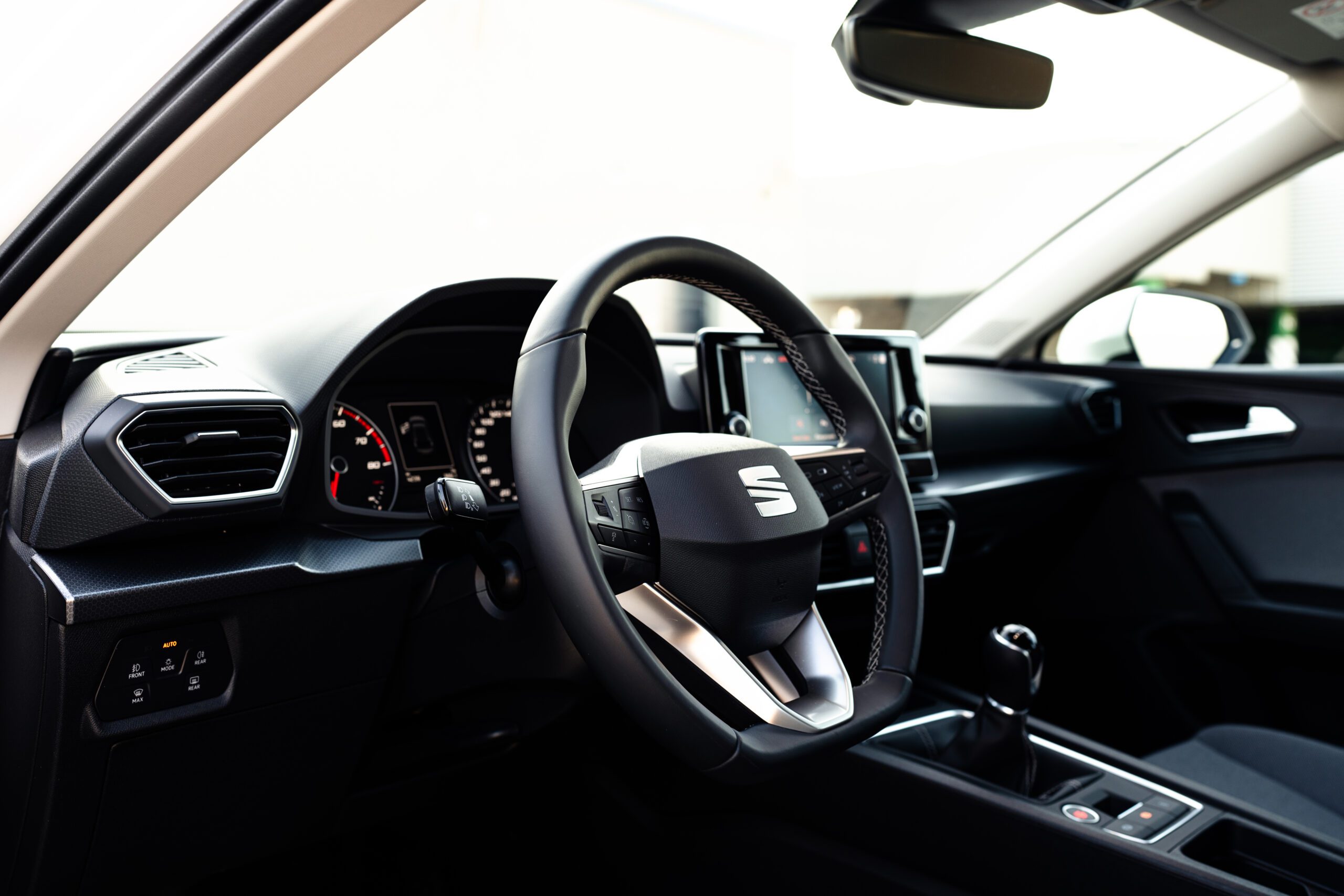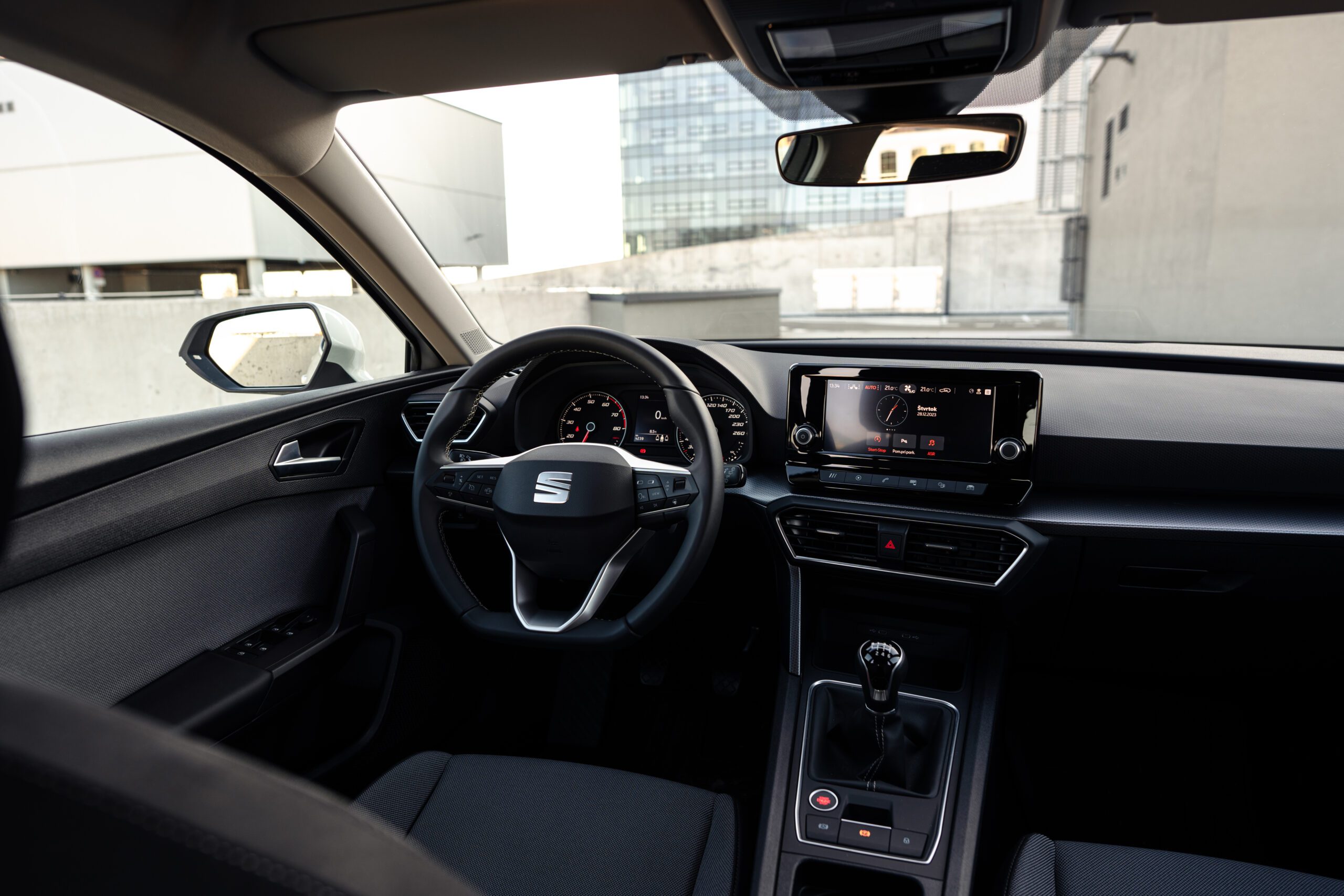 Mierne pobavenie vyvolal stredový 8,25″ dotykový displej. Pri Leone, podobne ako pri Octavii a Golfe, sme si akosi zvykli na absenciu hardvérových tlačidiel. Tu však bola tá plne digitálna hierarchia čiastočne prenesená späť do doby fyzických tlačidiel. 6 skratiek pod displejom plus otočné kolieska pre hlasitosť, alebo ladenie/preskakovanie staníc.