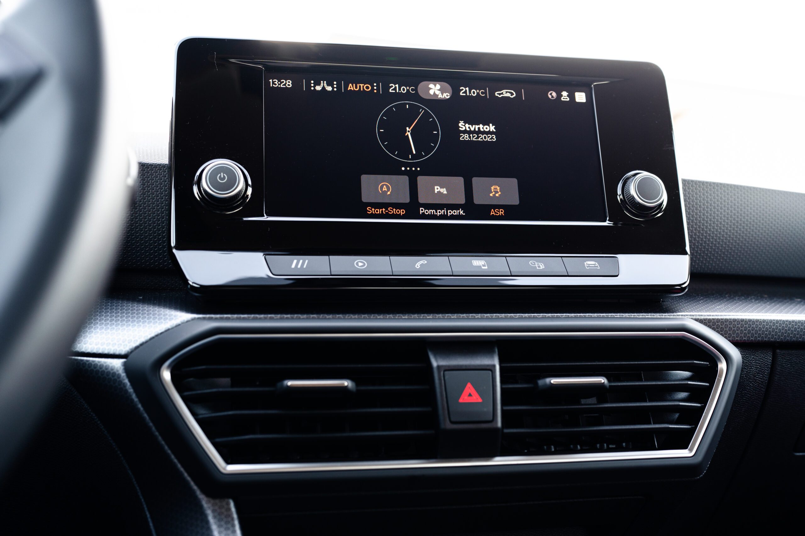 Mierne pobavenie vyvolal stredový 8,25″ dotykový displej. Pri Leone, podobne ako pri Octavii a Golfe, sme si akosi zvykli na absenciu hardvérových tlačidiel. Tu však bola tá plne digitálna hierarchia čiastočne prenesená späť do doby fyzických tlačidiel. 6 skratiek pod displejom plus otočné kolieska pre hlasitosť, alebo ladenie/preskakovanie staníc.