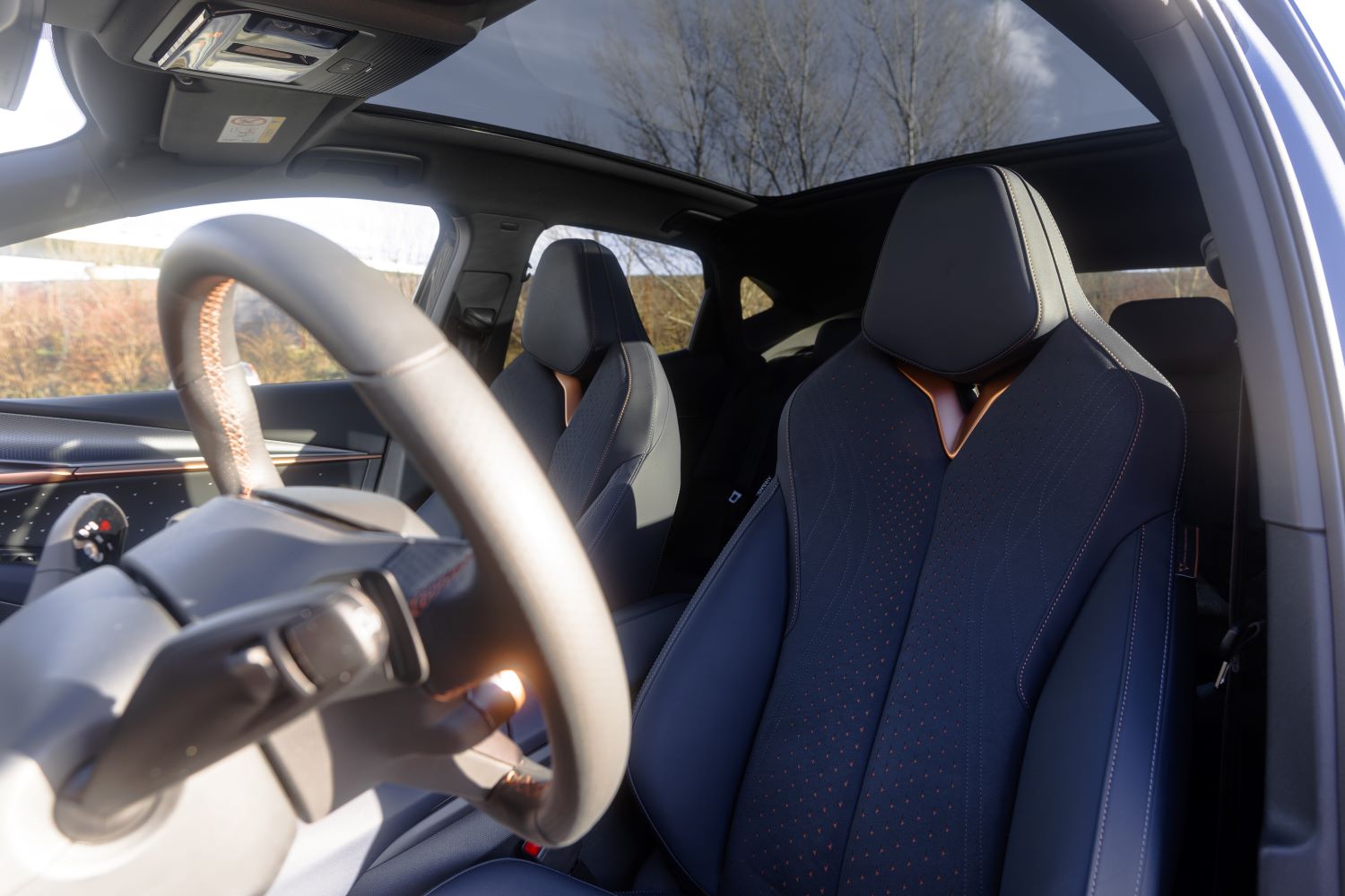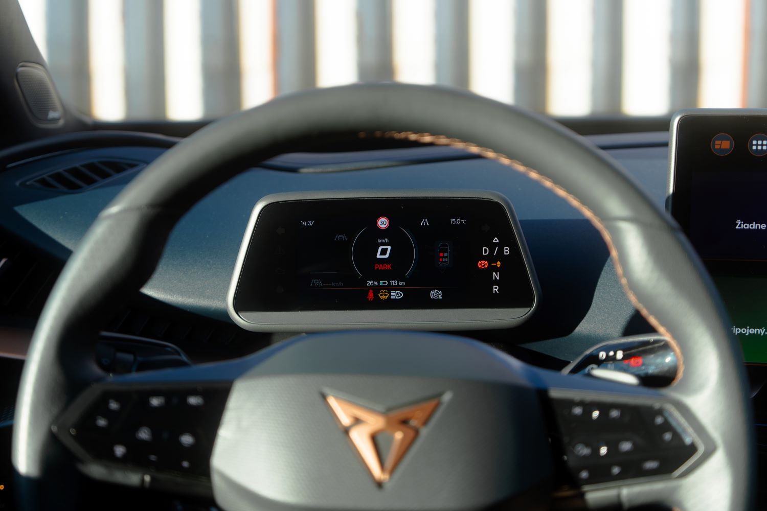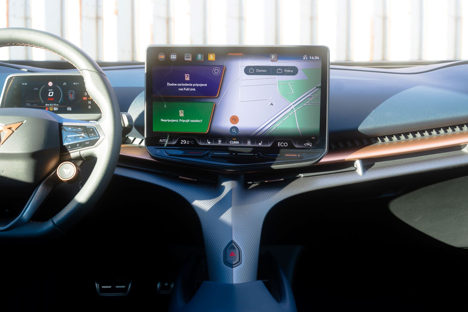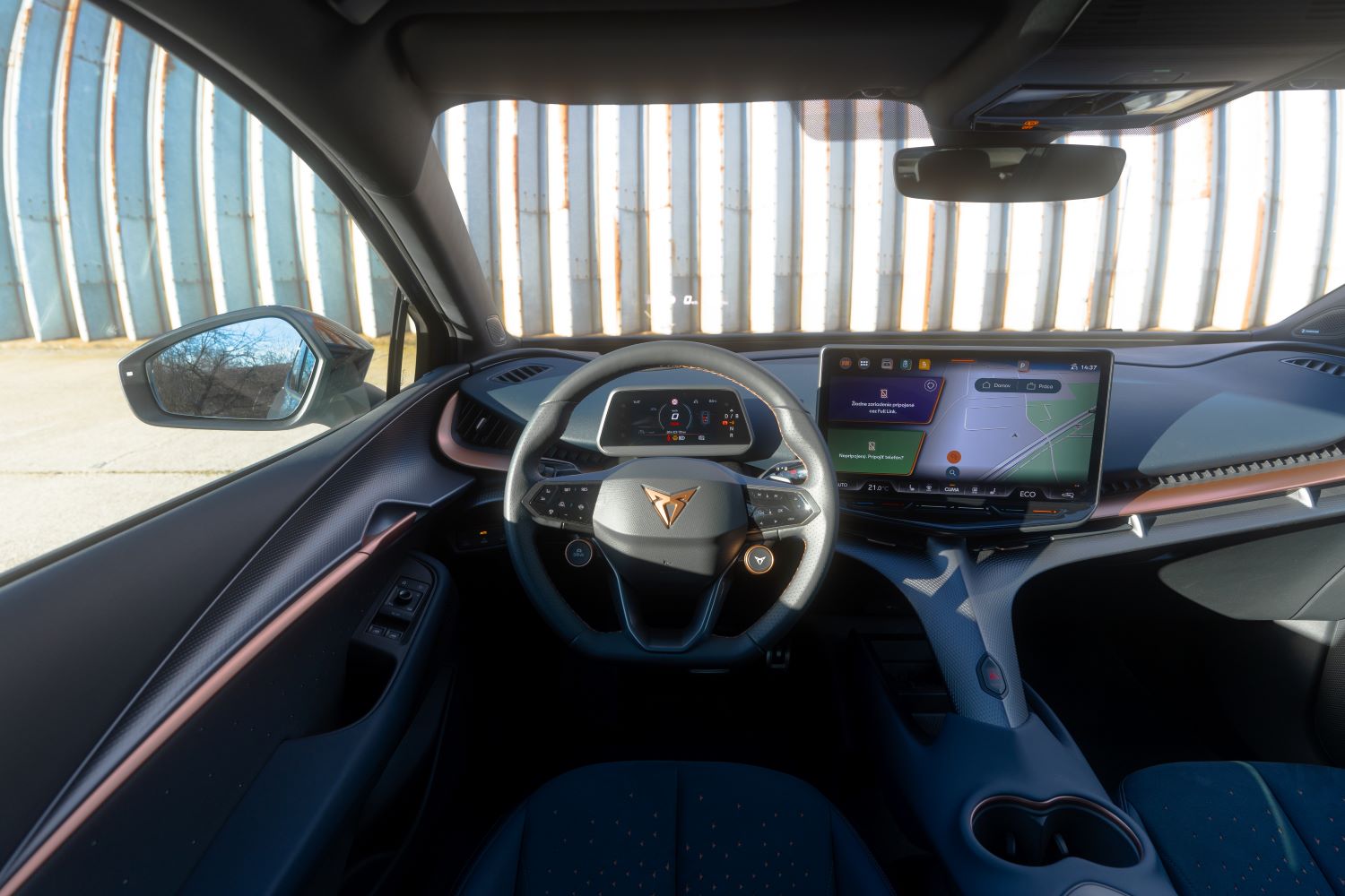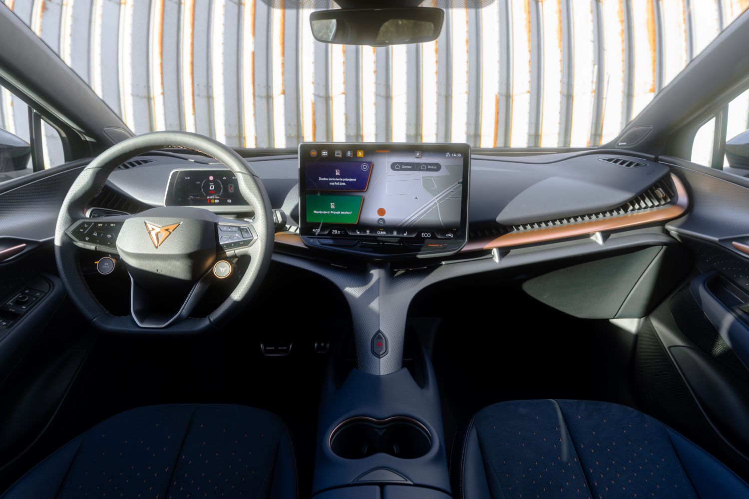 Materiály pôsobia príjemne na dotyk, občas však niektoré časti dokážu zavŕzgať. Priestoru dominujú detaily v podobe trojuholníkov, ktoré pripomínajú logo značky. To nájdeme aj na športových sedadlách. Druhou dominantou interiéru je obrovská 15″ obrazovka, ktorá pôsobí tak trochu ako billboard. Je posadená vysoko a vzhľadom na jej rozmer aj blízko k vodičovi, takže občas sa na tej veľkej ploche pomalšie zorientujete. No rozhranie je prehľadné, konektivita špičková a reakcie rýchle ako švajčiarske hodinky. Len kamerový systém si pýta výrazný upgrade, keďže pri takejto veľkej ploche je poznať jeho vek.