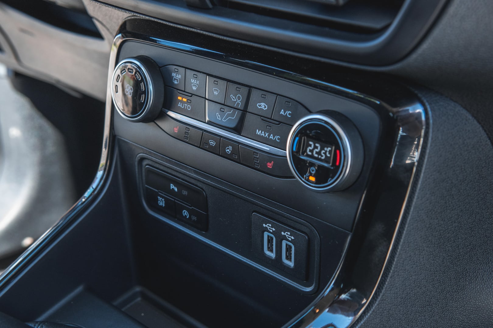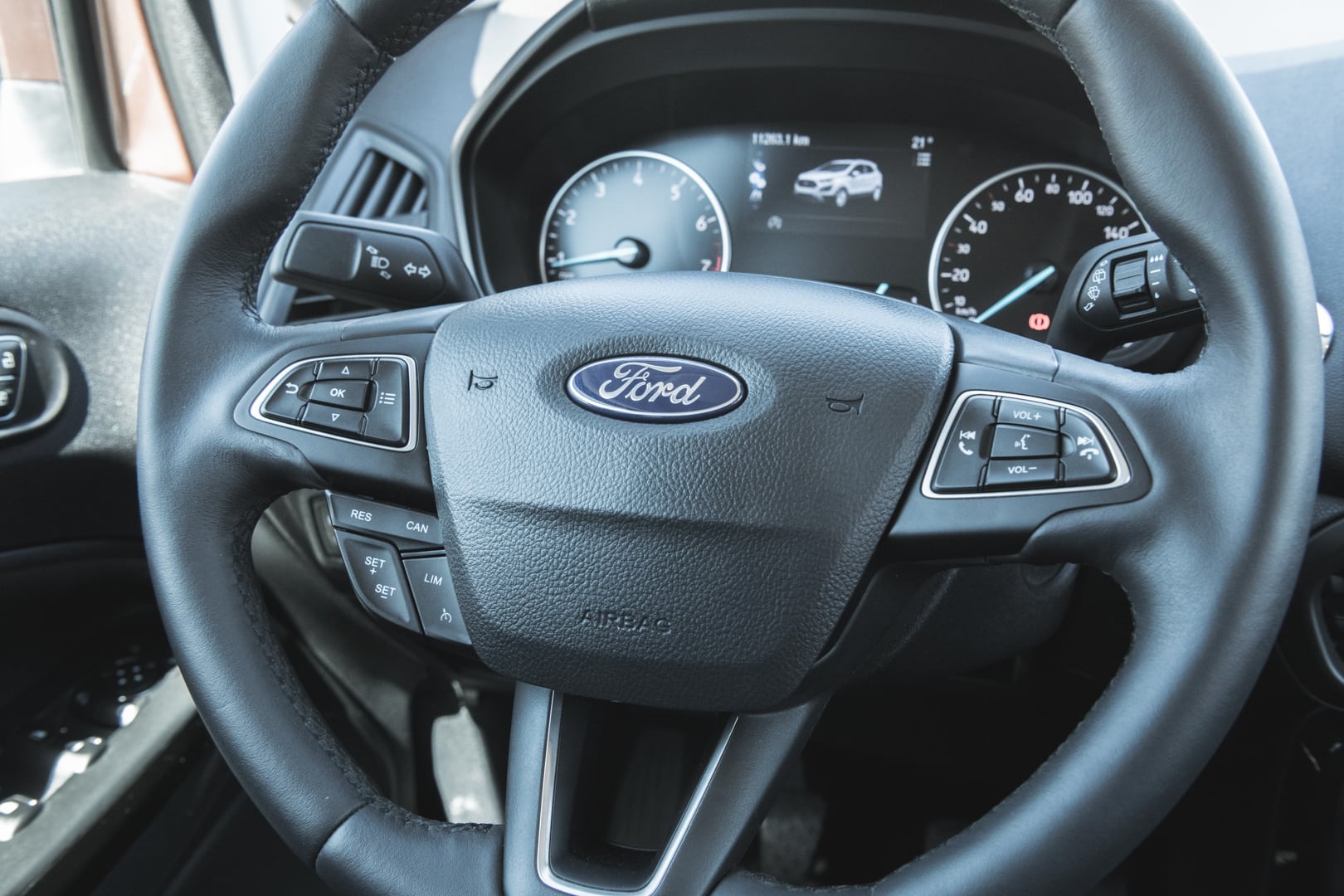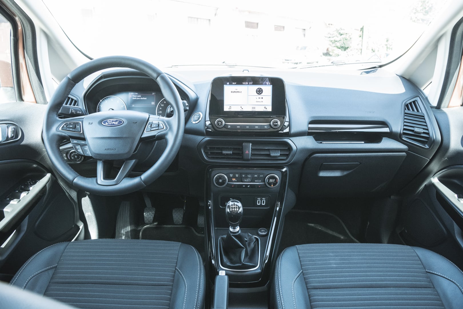 Interiér je prakticky prevzatý z Fiesty, nechýba farebný displej uprostred prístrojovej dosky, multifunkčný a vyhrievaný volant, vyhrievanie čelného skla, známy infotainment Sync 3, dvojica USB portov vpredu či nabíjačka vzadu umiestnená prakticky vedľa sedadla. Plus patrí určite aj množstvu odkladacích priestorov, či zaujímavému viacfarebnému ambientnému osvetleniu v interiéri ktoré nás celkom prekvapilo.