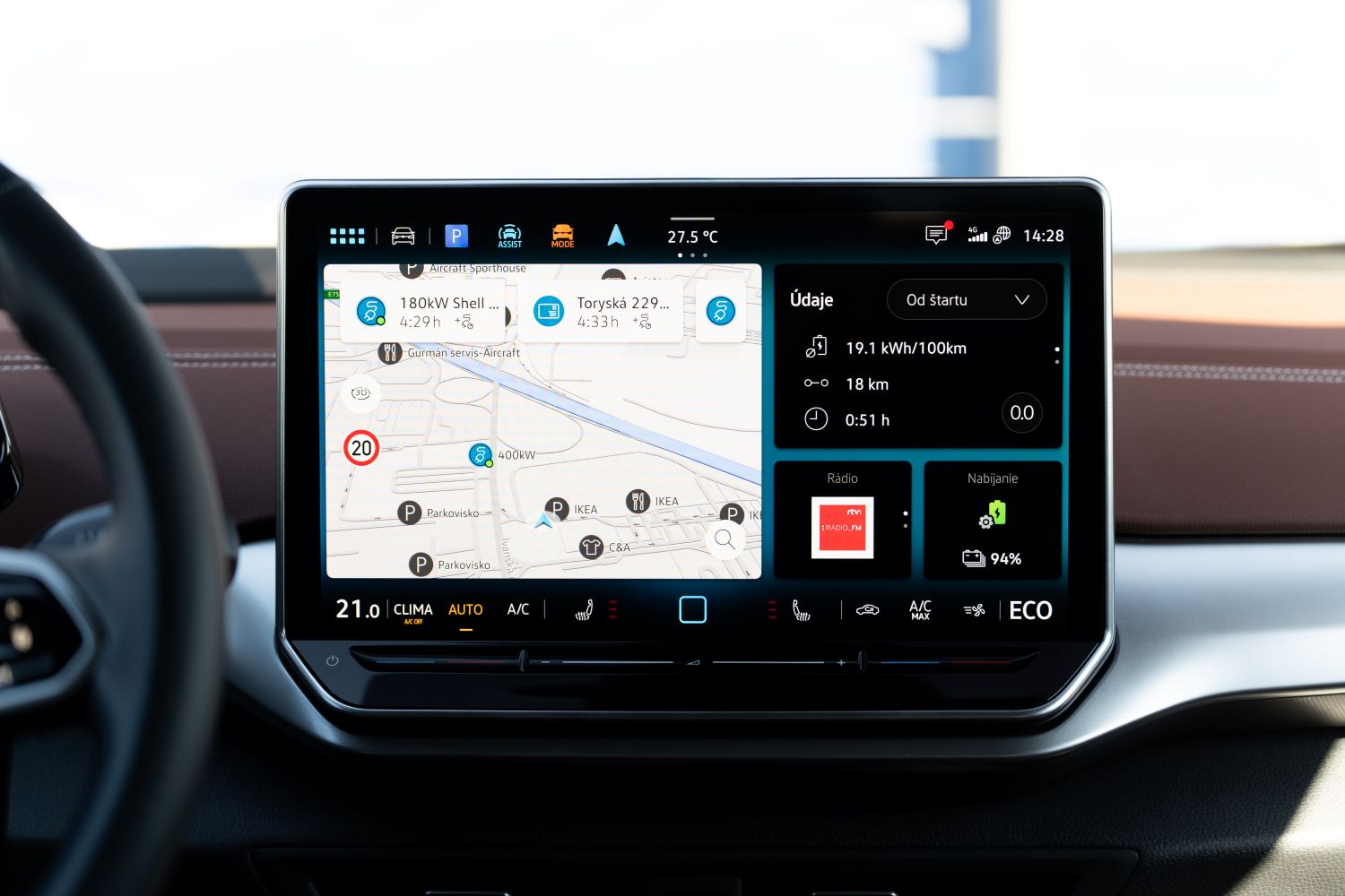 Príjemne. Z vozidla je výborný výhľad, v chladnejšom počasí určite oceníte vyhrievanie predných sedadiel i vyhrievanie čelného skla. Jazda je komfortná, ale pohyby karosérie si ID.4 stráži, takže po ceste nepláva. V nízkych rýchlostiach je tichá, no na diaľnici existujú na trhu aj elektromobily, ktoré prenášajú do kabíny menej aerodynamického hluku. Páči sa nám aktivovanie auta stlačením brzdy, vyraziť vpred tak môžete prakticky ihneď po nasadnutí.