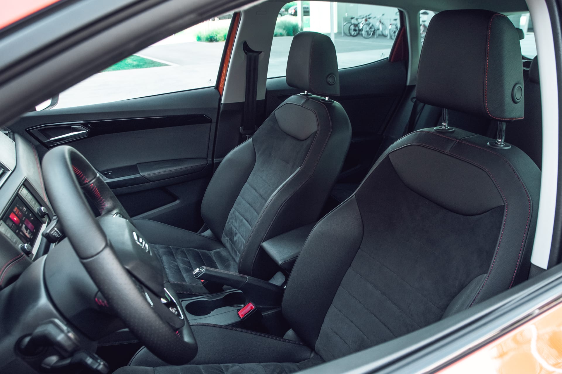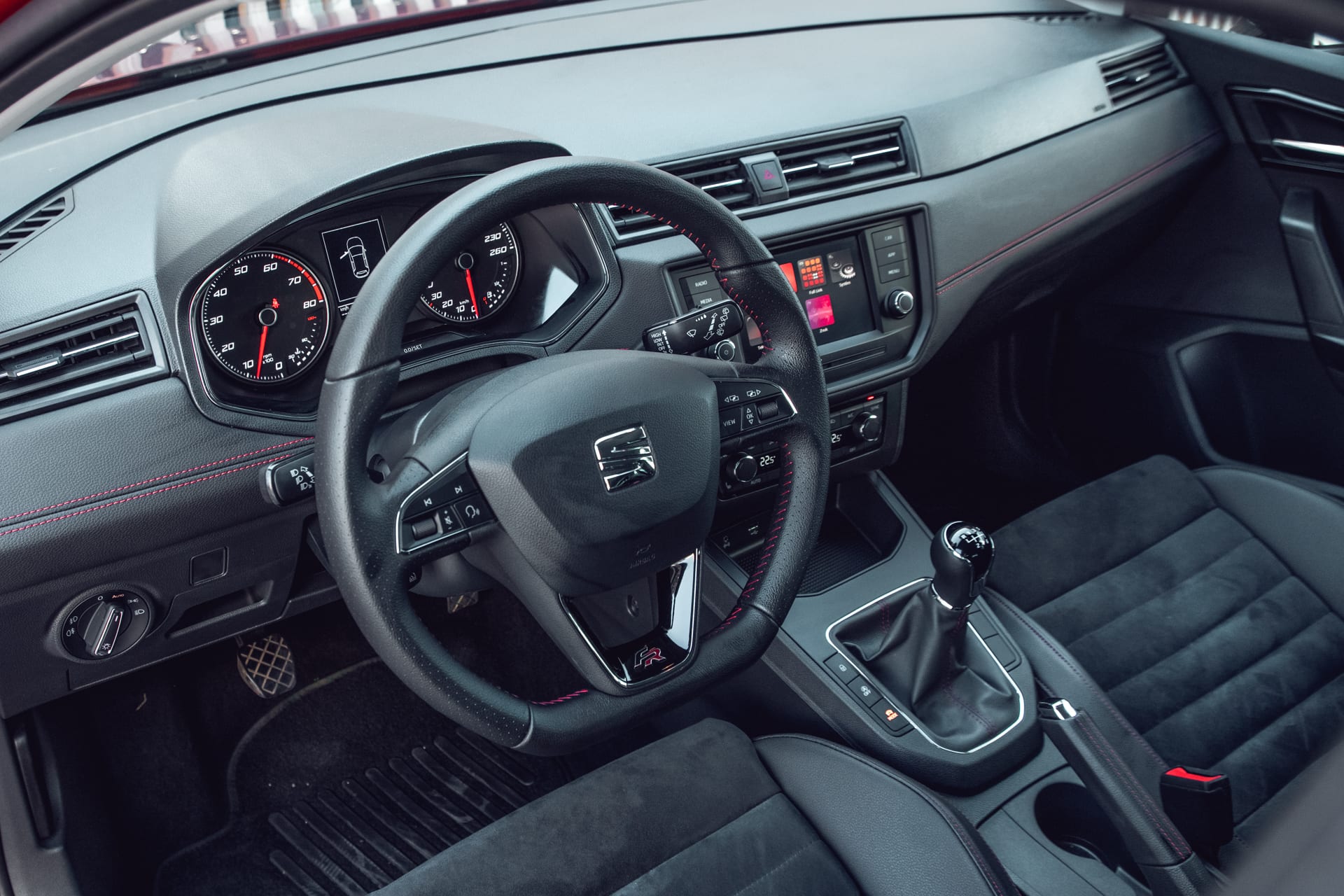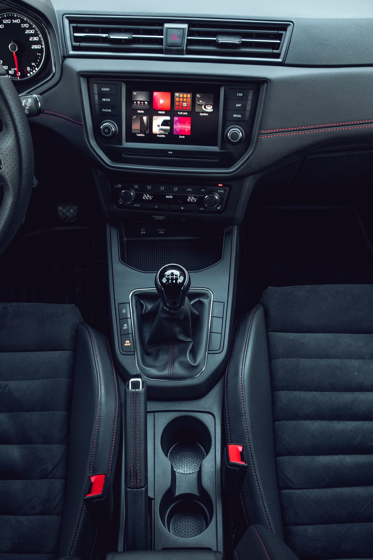 Interiér je vzdušnejší, priestrannejší a kvalitnejší. Je vypracovaný hlavne z tvrdých plastov, no celkový dojem je primeraný triede a vôbec nepôsobí lacno. V prípade FR je palubovka obšitá umelou kožou, interiéru sa to hodí, dotvára to finálny dojem. Plasty však najviac pocítite vo výplniach dverí a stredovom tuneli, ktorý je, mimochodom, na triedu auta výrazne masívny. Športové sedadlá sú kapitola sama o sebe! Perfektne držia telo, sú pohodlné a vyzerajú dobre. Naša Ibiza ešte nemá digitálny prístrojový štít, no do ponuky sa neskôr dostane. Displej infotainmentu v našom prípade s uhlopriečkou 6,5 palca, za príplatok môžete mať celosklenenú plochu s rozmerom 8 palcov. Oceňujem praktický priečinok na telefón, privítal by som však aj indukčné nabíjanie. Ambientné osvetlenie je príjemným spestrením dojmu z interiéru, nečakajte však celú farebnú škálu, k dispozícii je len červená a biela farba.