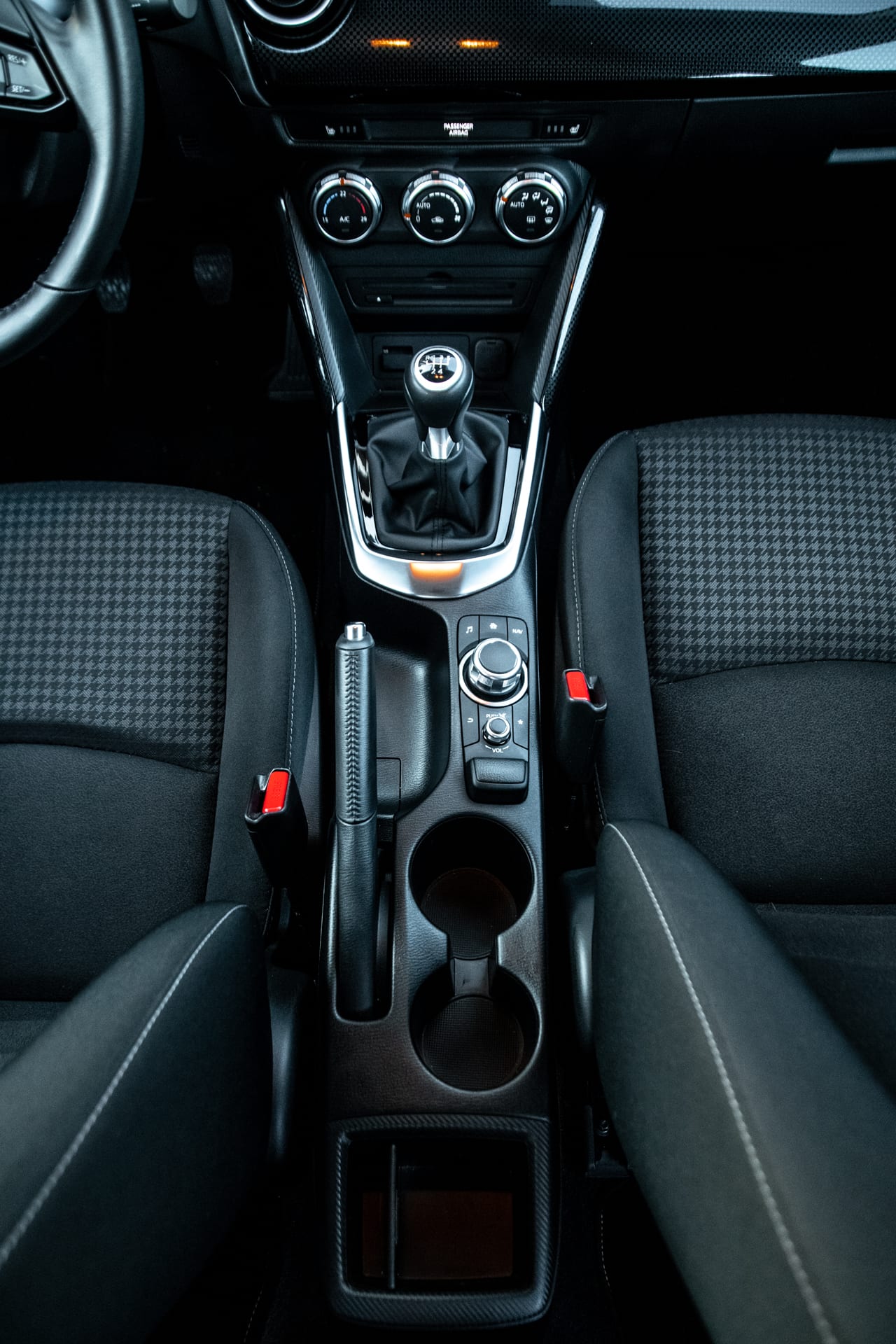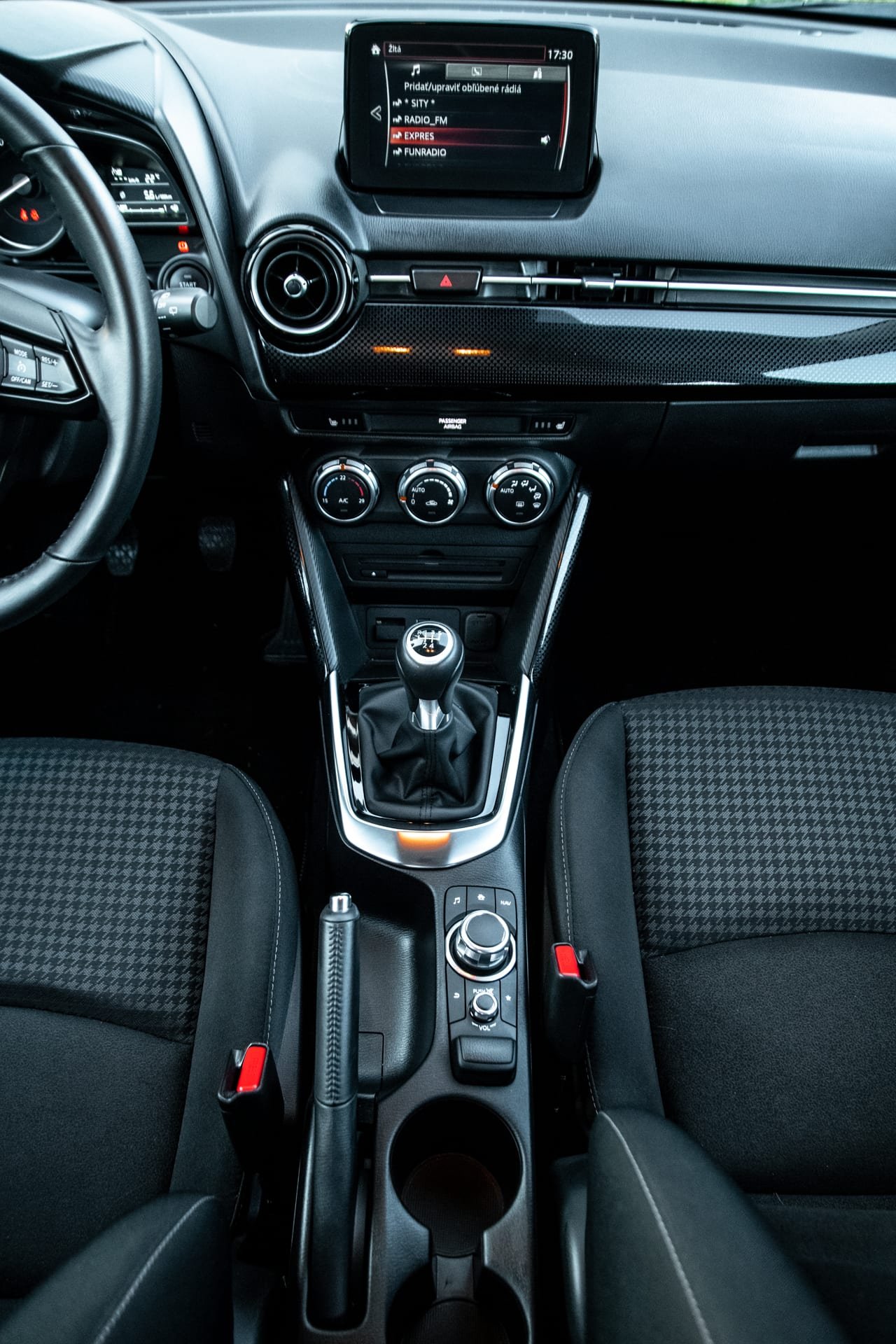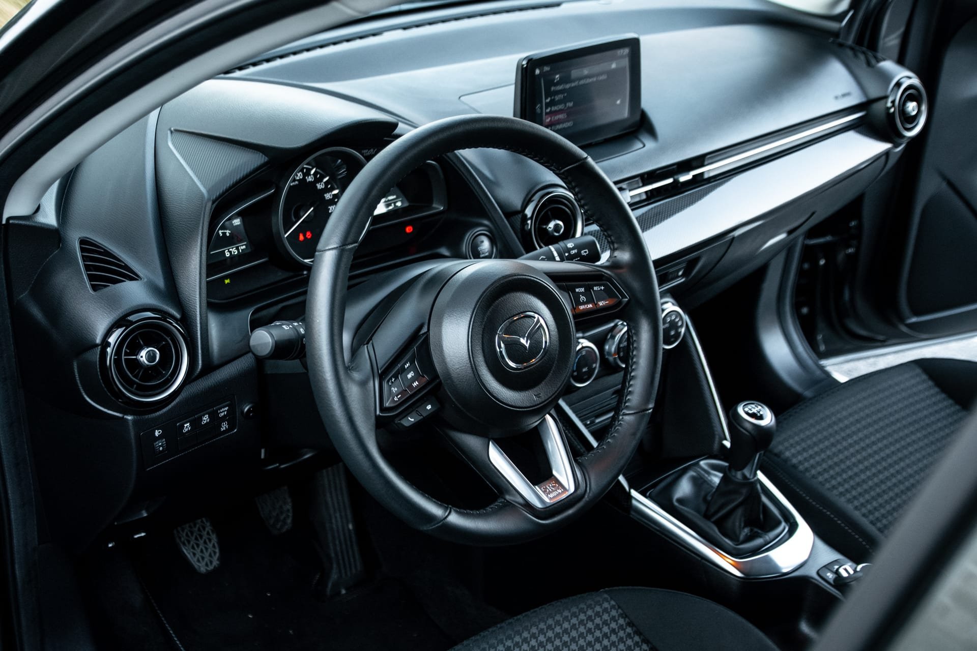 A čo interiér? Ako je už vyššie spomenuté, komfort a pohodlie je v kabíne na jednotku. Dobre tvarované sedadlá v kombinácii s tlmením nerovností robia z Mazdy 2 „parťáka“ na výlety. Z môjho pohľadu kabína pôsobí príťažlivým dojmom. Človek sa v ňom necíti stiesnene ani ako sardinka. Teda čo sa týka posedu vpredu.