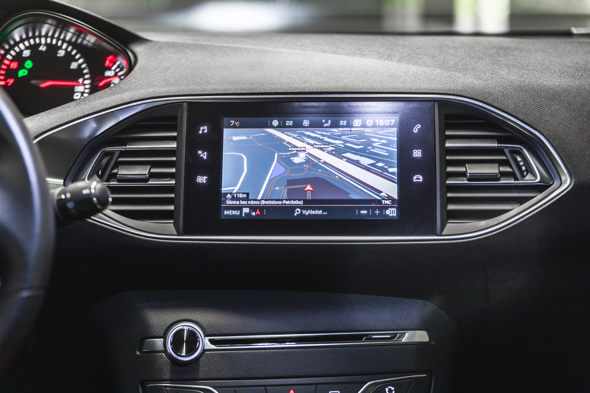 Ovládanie. Posed. (hlboký nádych). Nemôžem povedať, že ovládanie prvkov v interiéry je chaotické, alebo nepremyslené, takisto posed za palubnou lištou. Je jednoducho svojské. Na stredovom paneli však nehľadajte žiadnu možnosť ovládania klimatizácie. Tá sa (ako je dlhodobo známe) presunula do displeja nad panelom. Zaujímavé je, že väčšina automobiliek sa ku klasickému – vlastnému panelu klimatizácie vracia – iba Peugeot akoby to mal „na saláme“. V stredovom paneli tak nájdete iba výstup na CD, ovládanie hlasitosti, cirkuláciu vzduchu, výhrev predného a zadného okna, uzamknutie vozidla a výstražné blinkre.