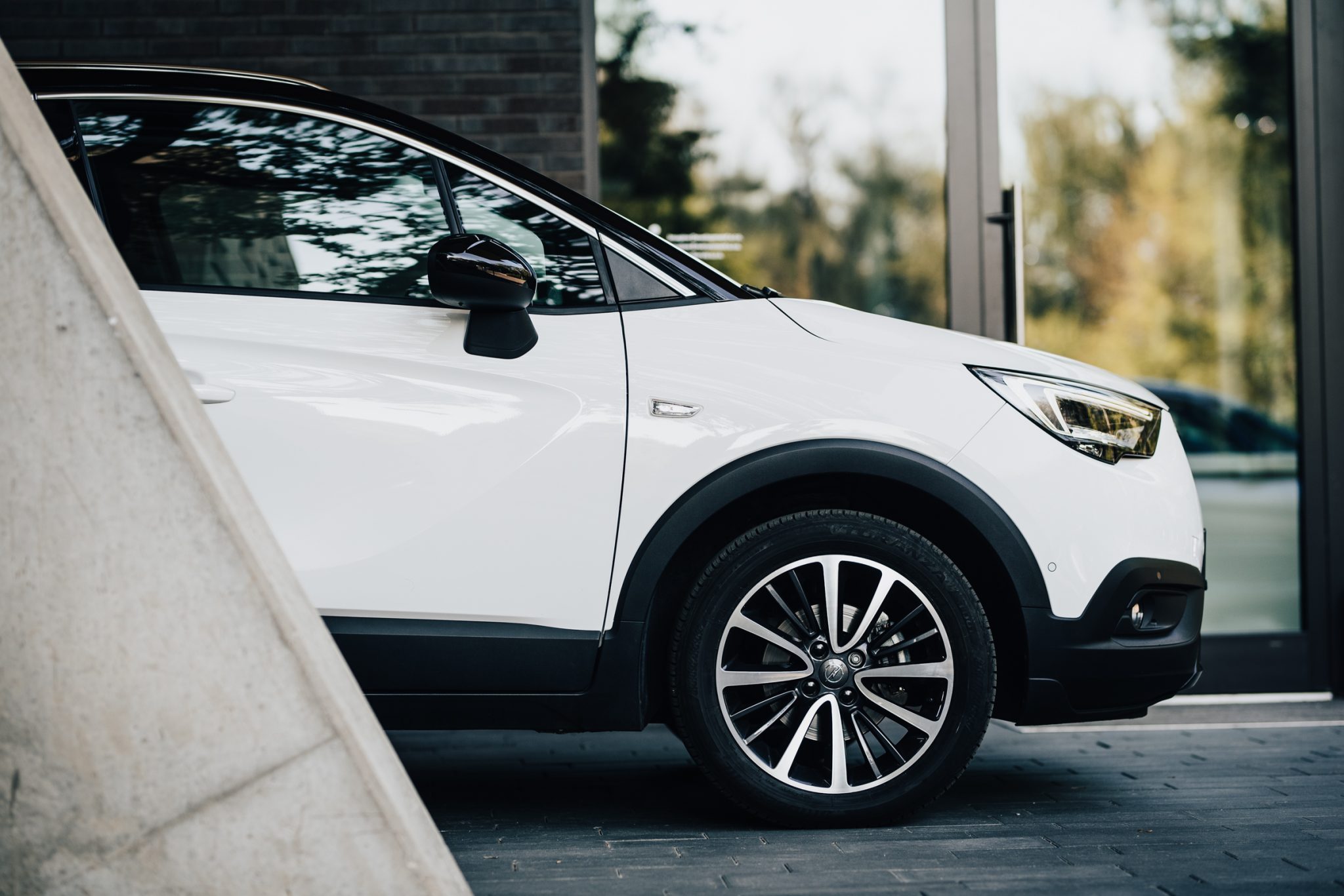 Pri pohľade zboku sa ale dojmy začnú meniť. Práve z tejto perspektívy pôsobí Crossalnd X najmohutnejšie. Bielu karosériu vkusne dopĺňajú čierne kryty spätných zrkadiel a doslova klesajúca strecha. Tú od okien pasažierov predeľuje chrómová lišta tiahnuca sa od A stĺpiku až po zadné svetlomety netradičného tvaru. Do očí rozhodne udrú aj 17 palcové disky kolies, ktoré pôsobia veľmi štýlovo.