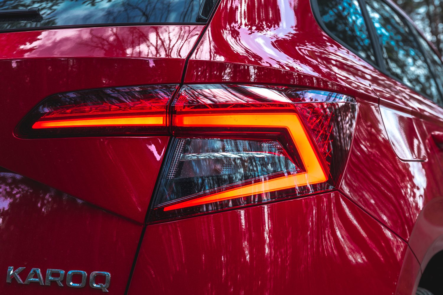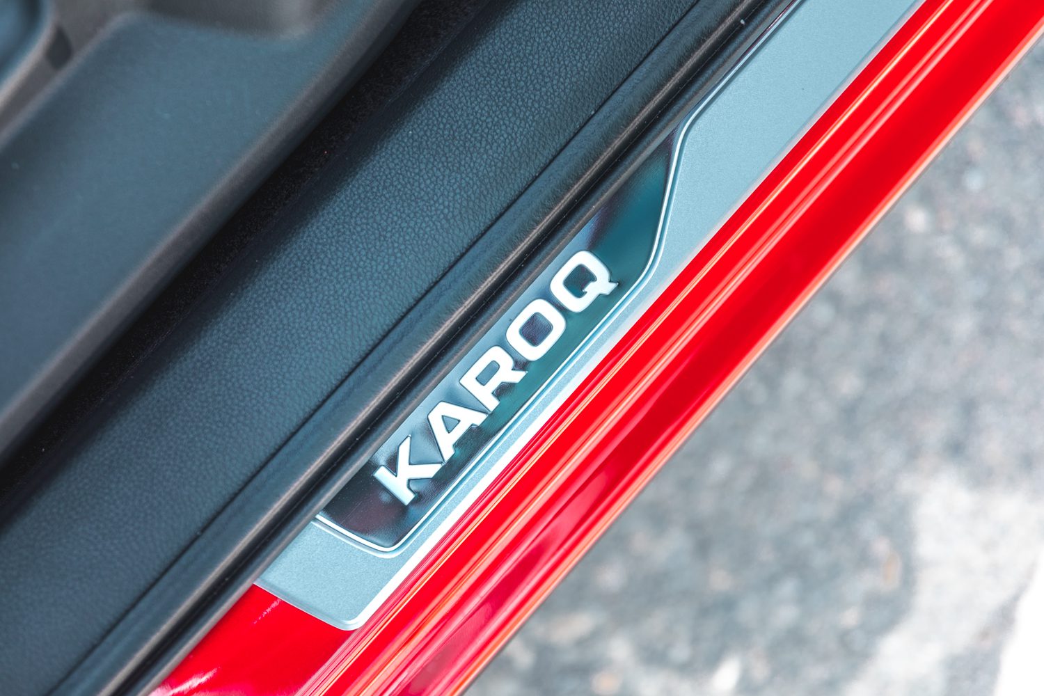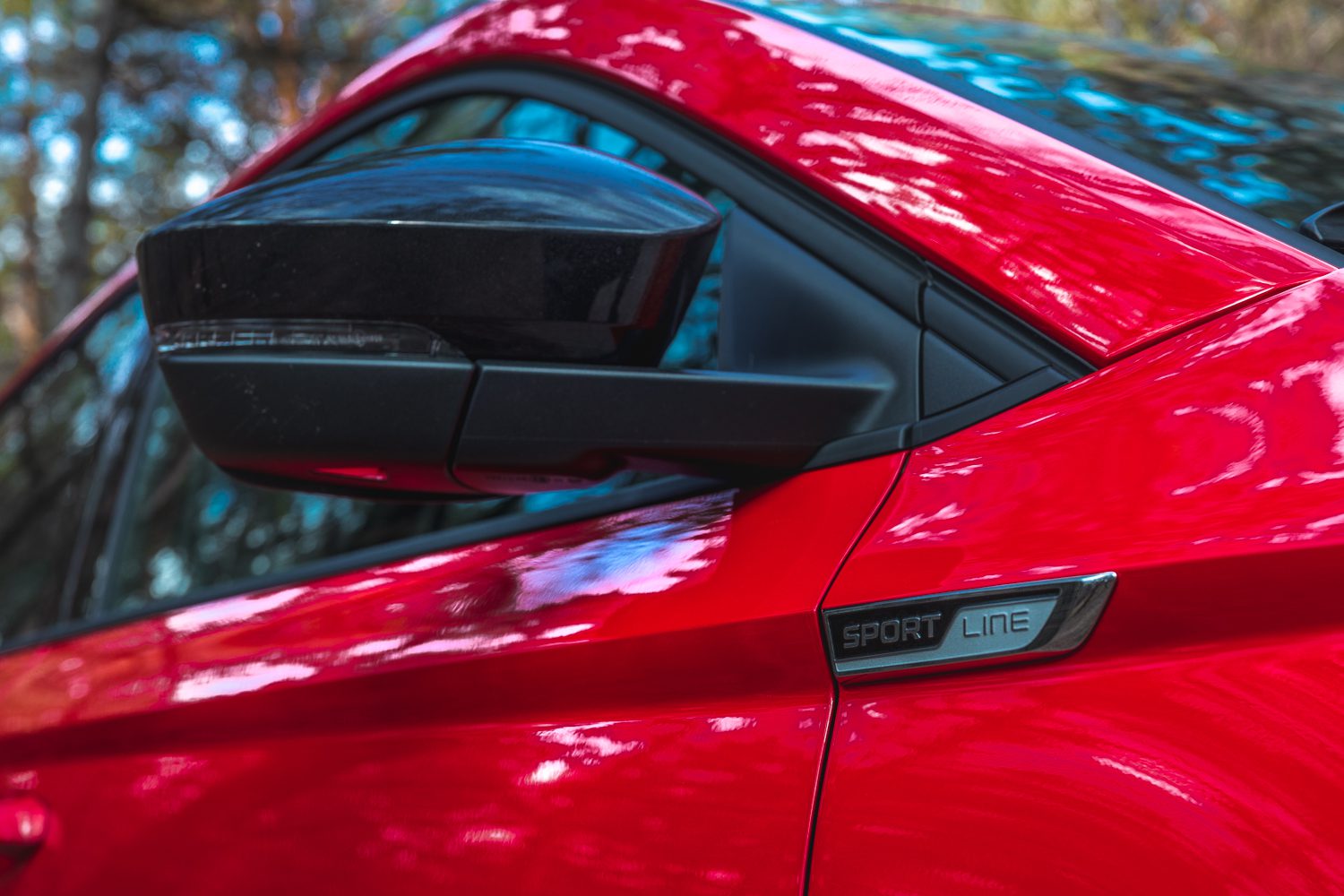 Červená Velvet metalíza sa Karoqu hodí a efektne ju dopĺňajú práve Sportline prvky. Nieje ich síce veľa no o to decentnejšie pôsobia vo finále. Čierna matná maska chladiča, dve čierne krídelká po bokoch spodnej časti predného nárazníka, čierne bočné lemy dverí, čierne lakované kryty spätných zrkadiel či čierne strešné nosiče.