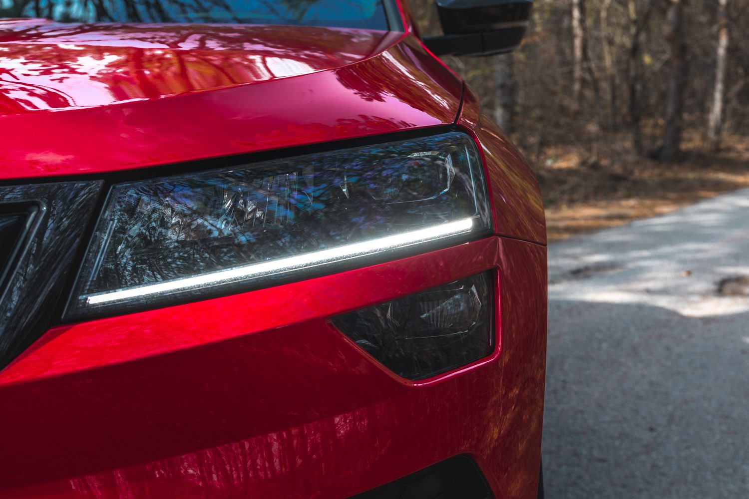 Červená Velvet metalíza sa Karoqu hodí a efektne ju dopĺňajú práve Sportline prvky. Nieje ich síce veľa no o to decentnejšie pôsobia vo finále. Čierna matná maska chladiča, dve čierne krídelká po bokoch spodnej časti predného nárazníka, čierne bočné lemy dverí, čierne lakované kryty spätných zrkadiel či čierne strešné nosiče.