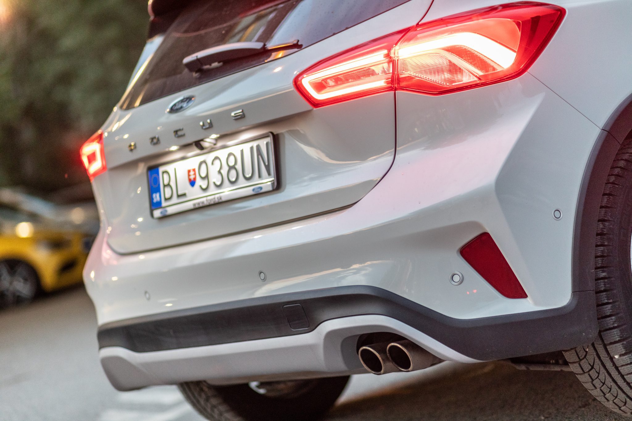 Feeling luxusu je doplnený čiernou strechou, ktorá dokáže s nami testovanou bielou farebnou schémou karosérie krásne vyniknúť. Focus Active od bežného Focusu rozoznáte vyššou svetlou výškou a už spomínaným oplastovaním. Dynamický look dodávajú aj 18“ kolesá. Pokiaľ by ste pochybovali o potenciály Focusu Active, tak presvedčiť Vás môže dvojitá koncovka výfuku a dobrý hlasový prejav, či malé emblémiky na blatníkoch. Nemôžem si pomôcť. Keď sa spätne pozerám na fotky tohto auta, mne osobne príde viac sexy, než sériová podoba. Za zmienku stoja určite chrániče proti oškretiu dverí, ktoré sa automaticky vysunú pri otvorení dverí a olemujú tak vždy obíjanú hranu.