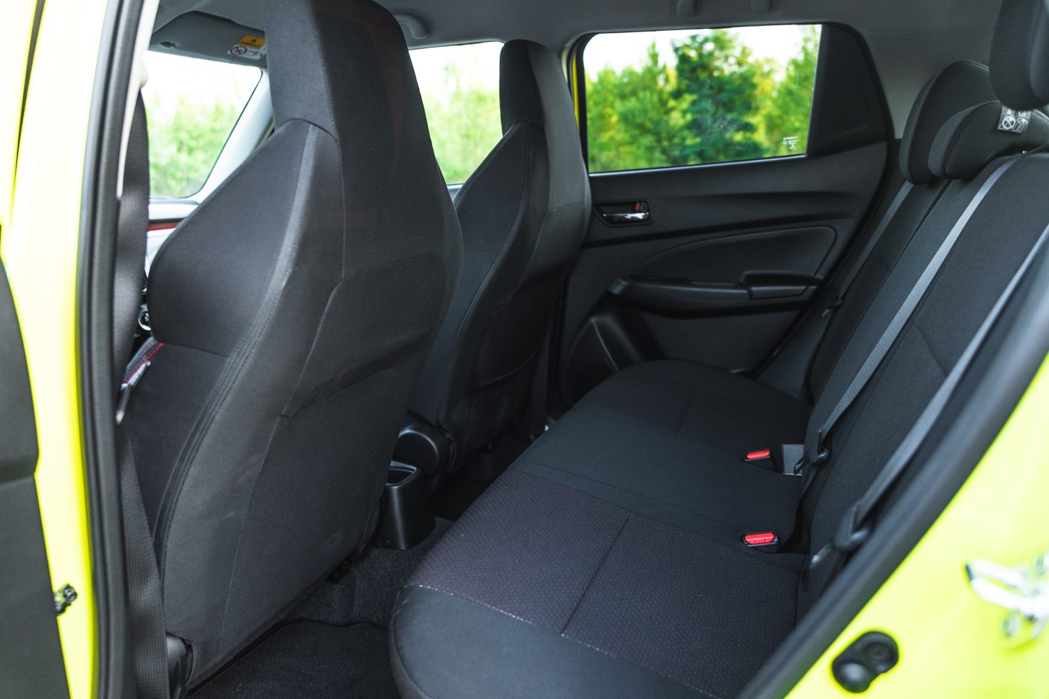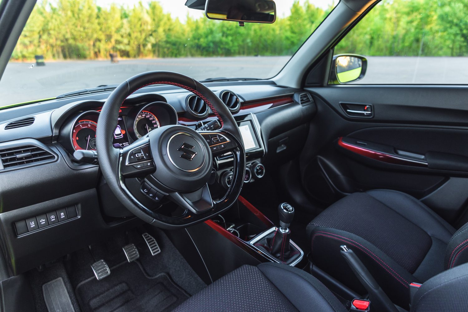 Interiér Swiftu Sport môže pôsobiť veľmi stroho, no zato je veľmi príjemný a prehľadný. Šofér a spolujazdec sedia v úplne nových sedadlách, ktoré Vás krásne držia v zákrutách, no sú pre osoby so štíhlejšou postavou. V novom Swifte sedíte o čosi vyššie, než v predošlej generácií, no pozícia sedačky oproti volantu, pedálom a riadiacej páky je úžasná. Pedále sú pri sebe „tak akurát“, vďaka čomu dokážu skúsení šoféri ľahko radiť s medziplynom.