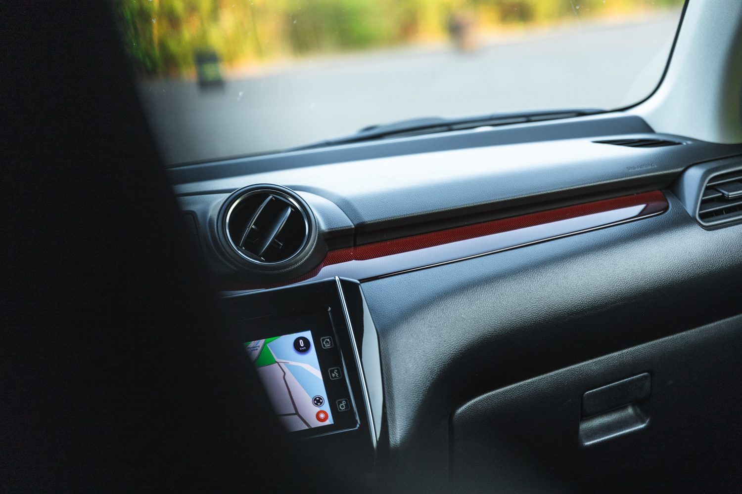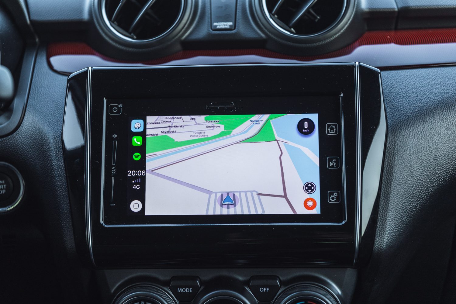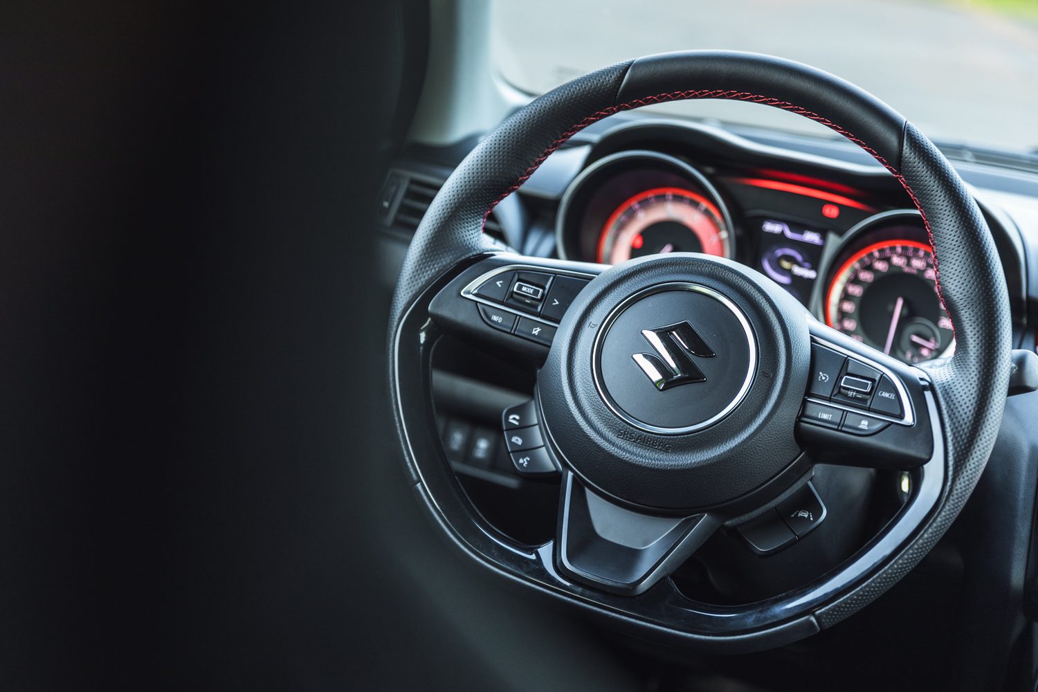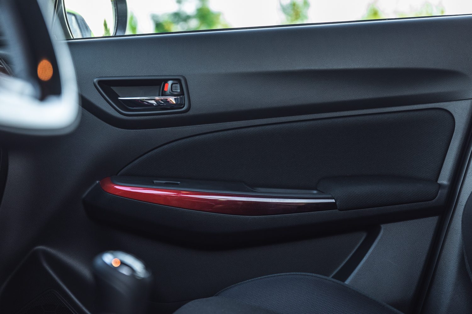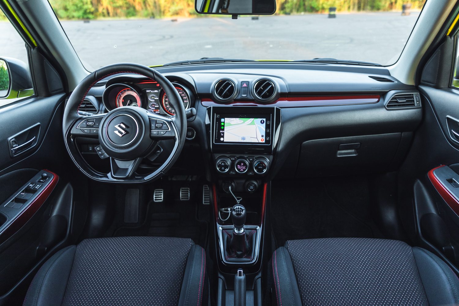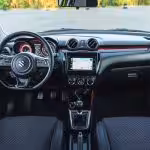 Keď to zoberieme zo širšieho spektra, tak práve táto červená farba dokáže oživiť kabínu. Kvalitou sa možno Swift nemôže rovnať svojim vyšším konkurentom, ale to je to posledné, čo človeka zaujíma, keď stojí niekedy aj o 10.000€ menej. Dotyková plocha v strede taktiež nie je najrýchlejšia a najprehľadnejšia, ale všetky potrebné funkcie dokáže spraviť.