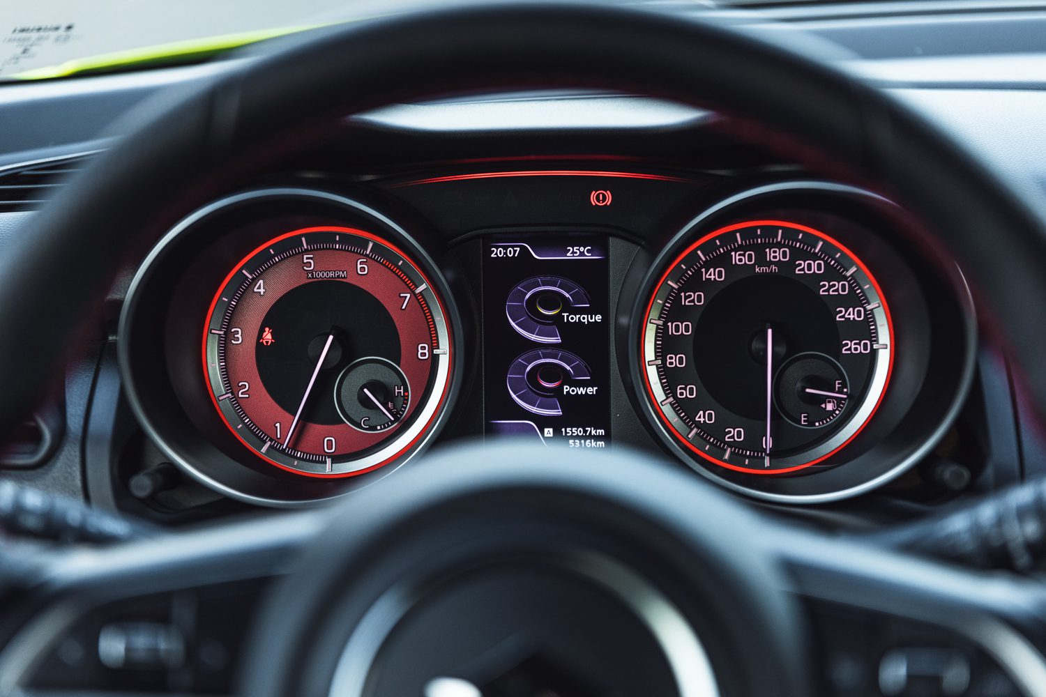 V interiéri som však nepochopil jednej veci. Prečo je vnútri červený dekor na dverách, palubovke, či na sedačkách, keď je auto zvonku žlté? Je to tak trocha proti mojej logike, ale po pár dňoch si na to človek aj zvykne. Červené sú aj ciferníky na prístrojovke. Medzi nimi sa nachádza farebný displej, ktorý dokáže ukazovať aj tlak turba, či teplotu oleja.
