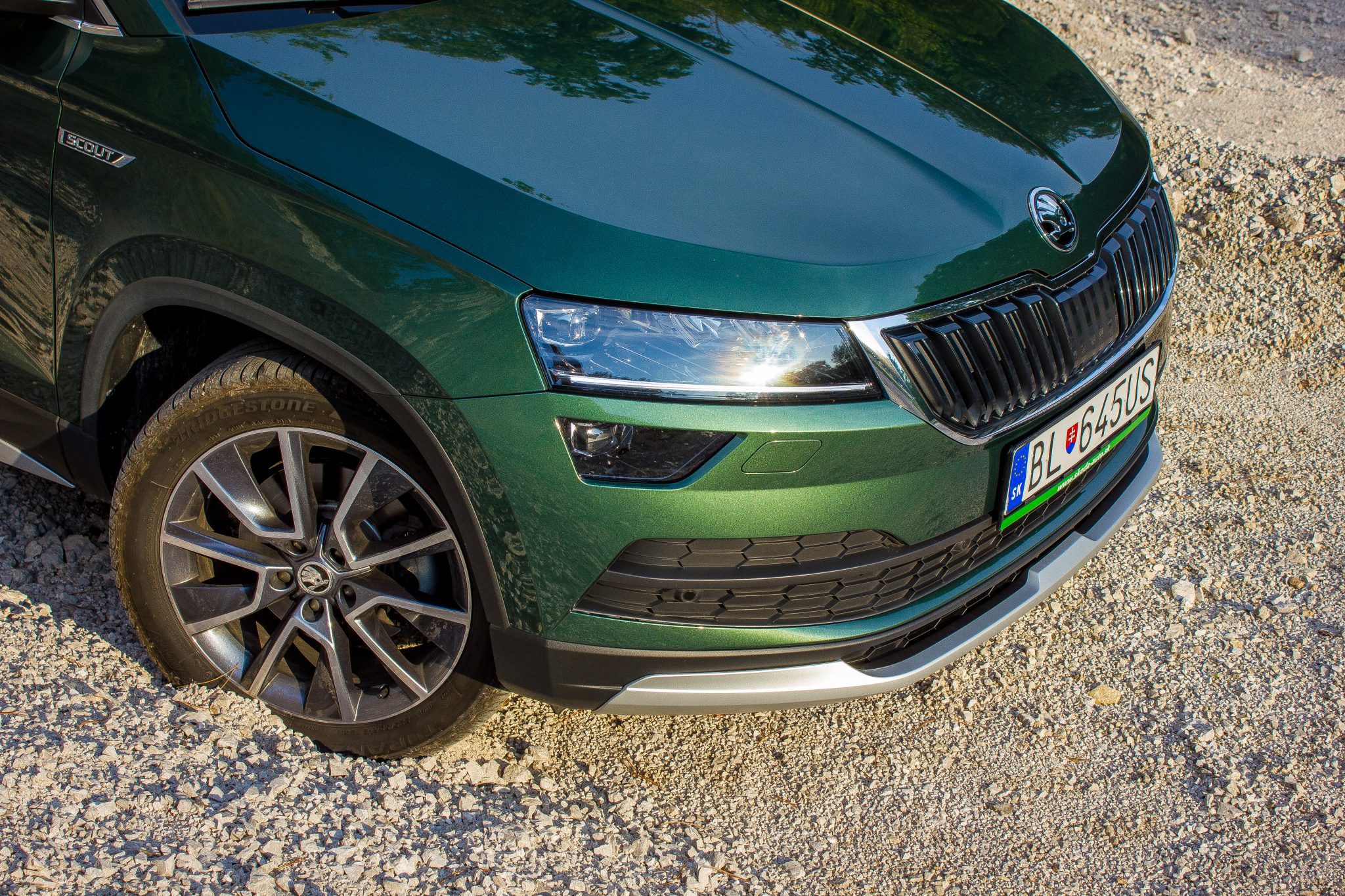 Keď sa na Karoq Scout pozriete pozornejšie zistíte, že nemá byť iba dizajnovým cvičením, plní aj funkciu výkladu technologických možností, ktoré si v prípade tohto modelu môžete dopriať. Auto teda na cestu svieti FULL LED reflektormi, modernou technikou sú osadené aj zadné skupinové svetlá. Reflektory svietia výborne a na mojom zozname preferovanej výbavy, ktorú by som si do auta objednal, by boli úplne hore. Vekom a skúsenosťami totiž človek zistí, že na to, aby sa v aute cítil pohodlne aj počas dlhých kilometrov, musia byť splnené tri základné parametre. Auto  musí mať dobré sedadlá, výkonné svetlá a dobre odhlučnenú kabínu. Karoq ma vo všetkých týchto kritériách uspokojil. Testované auto malo zliatinové disky s priemerom 18 palcov. Pre Karoq Scout sú tak akurát, po väčších by som už nesiahol. Na aute totiž vyzerajú dobre a svedčia aj cestovnému komfortu. Iste, automobilka ponúka aj devätnástky, no s nimi by auto podľa mňa vyzeralo akosi zvláštne. Ako keby ste si k vojenským maskáčom obuli lakovky. Ale samozrejme, proti gustu…
