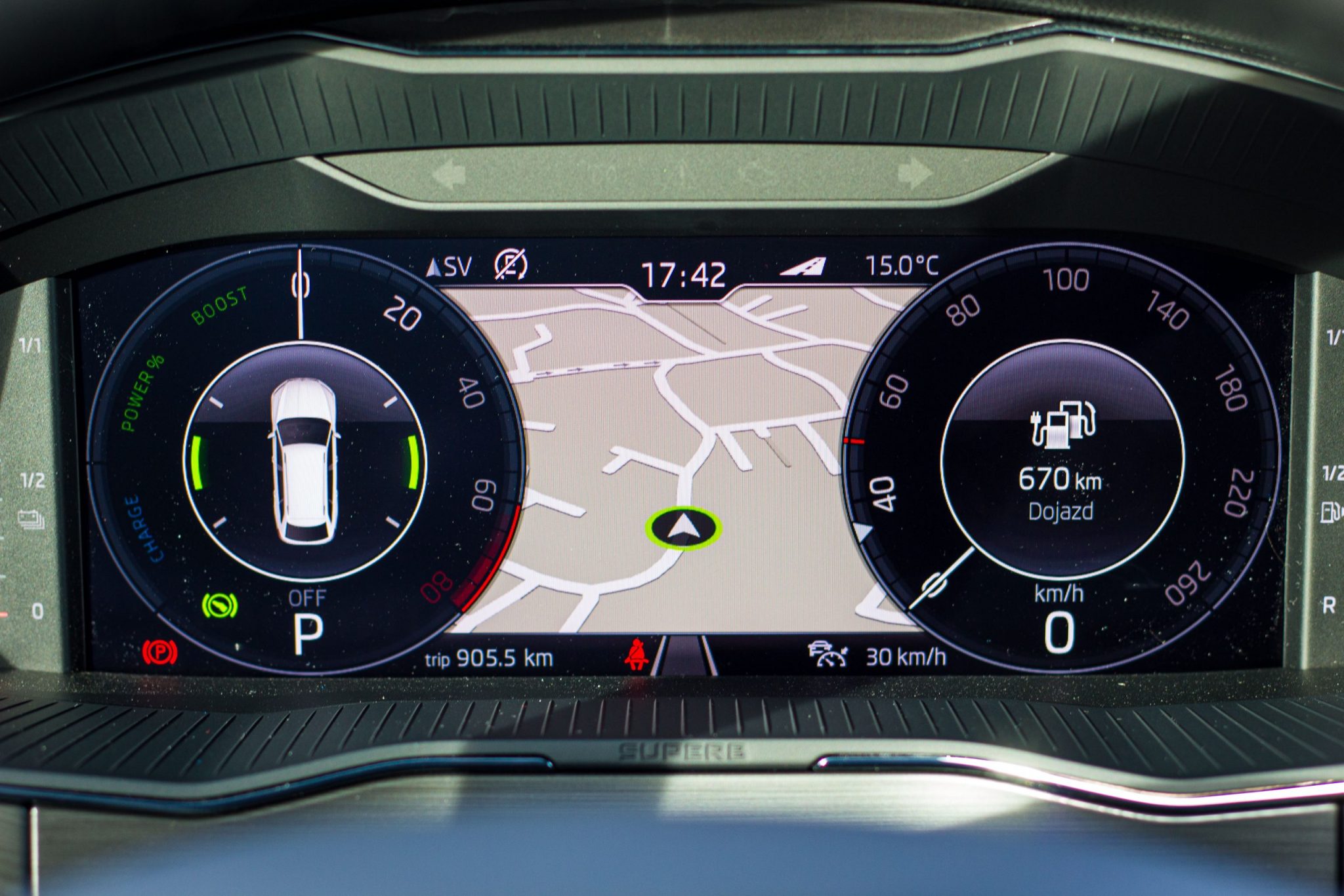 Po presune do interiéru ma zaujala jedna vec. Škoda Superb už viac nie je taký ten „lacnejší“ príbuzný Passatu. Vidieť to najmä na prepracovaných detailoch ako prešívanie sedadiel či kožené madlá dverí. Za mňa osobne je to pre českú automobilku posun vpred a prísľub prémiovejšej budúcnosti. Navyše musím podotknúť, že počas celého testu v interiéri nič nevŕzgalo, nič neškrípalo a všetko pasovalo do seba tak, ako by som si to pri aute v tejto cenovej kategórii predstavoval. Navyše sedačky, ktoré boli nie len pohodlné, ale aj vzhľadovo perfektné, dokonale sadli do interiéru. Bola tu však jedna vec, ktorá mi ihneď po nastúpení povedala, že nesedím len tak v bežnom Superbe. Namiesto ukazovateľa teploty na prístrojovom štíte, tu bol druhý ukazovateľ aktuálnej „kapacity nádrže“. Avšak v tomto prípade tá druhá „nádrž“ bola batéria s kapacitou 13 kWh.