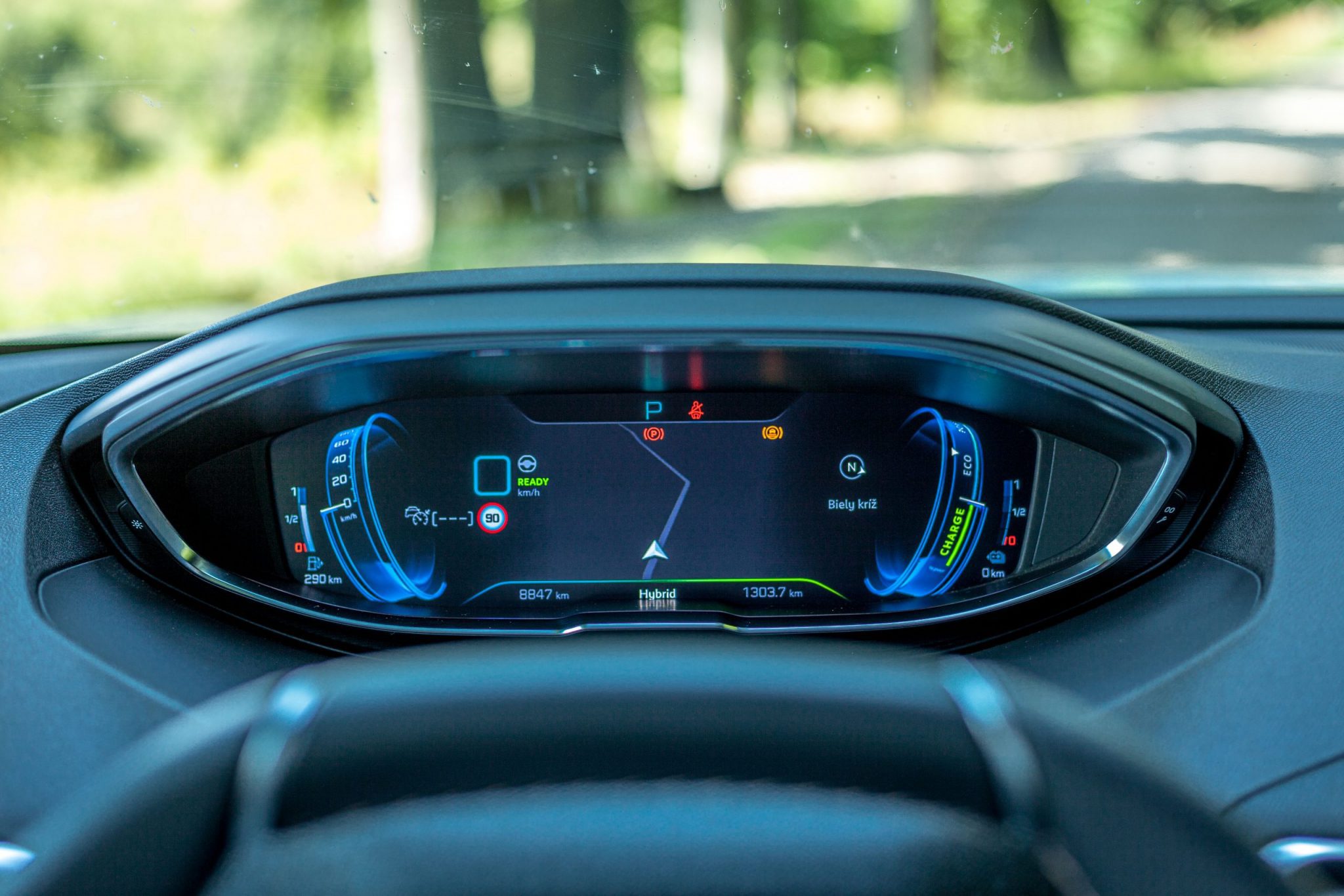 Automatický voliteľ jazdných režimov pri bežnej jazde prioritizuje spotrebu, a to ako benzínu, tak aj elektriny. S nabitým akumulátorom sa viete pohyovať v mestskej premávke za ďaleko menej než 5 litrov na 100 kilometrov. Osobne som si však najviac zamiloval čisto elektrický režim. Auto sa v ňom správa ako každý iný elektromobil – každým brzdením rekuperuje energiu a lenivé rozhodne nie je. V čom je ale iné od väčšiny elektromobilov je reálny dojazd. Samozrejme, že vzhľadom na koncepciu pohonu asi neprejde len na elektrinu 300 kilometrov, no aj tak ma daná hodnota zaskočila. Peugeot sľubuje dojazd podľa metodiky WLTP 50 kilometrov. Mne sa podarilo na okruhu, ktorý pozostával z diaľnice, mesta a okresiek prekvapivo prejsť až 52 kilometrov len na elektrinu. V praxi to znamená asi toľko, že cez deň môžete jazdiť po meste len na elektrinu, večer dáte auto nabiť a do dvoch hodín ho máte úplne nabité. V prípade, že sa vydáte na dlhšiu cestu, súhra spaľovacieho motoru a hybridnej jednotky vás odmení veľmi dobrou spotrebou.