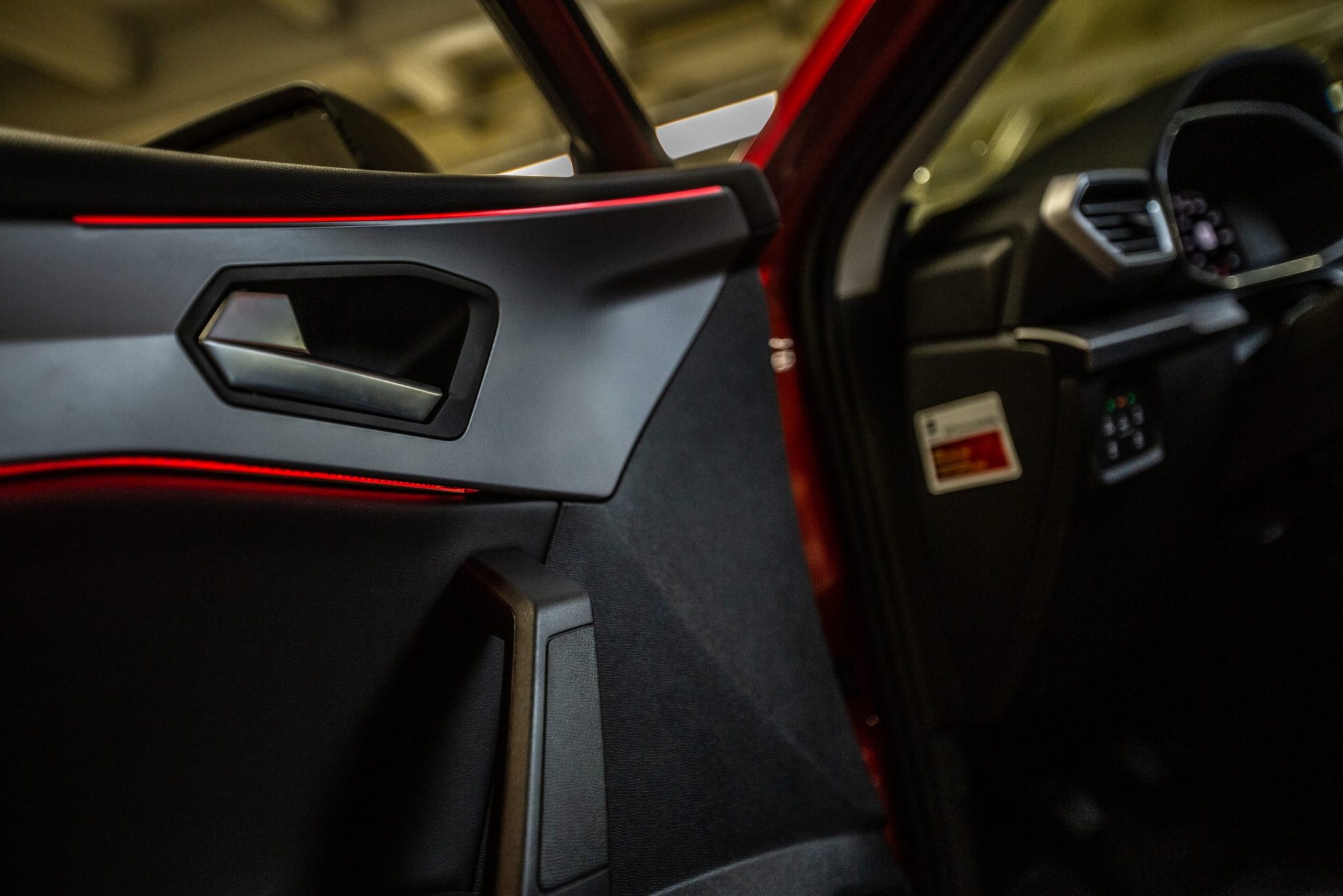 Za spomenutie určite stojí okolité osvetlenie, teda úzky LED pásik v hornej časti palubovky a dverí. Vo dverách má ale navyše aj inú ako estetickú funkciu. Ak sa totižto do mŕtveho uhlu auta dostane vozidlo, napríklad pri predbiehaní na diaľnici, časť tohto osvetlenia zmení farbu na oranžovo. Bonusom je, že ak otvoríte dvere, LED pás zmení farbu na červenú, aby okoloidúce autá videli aj v tme, že máte otvorené dvere.