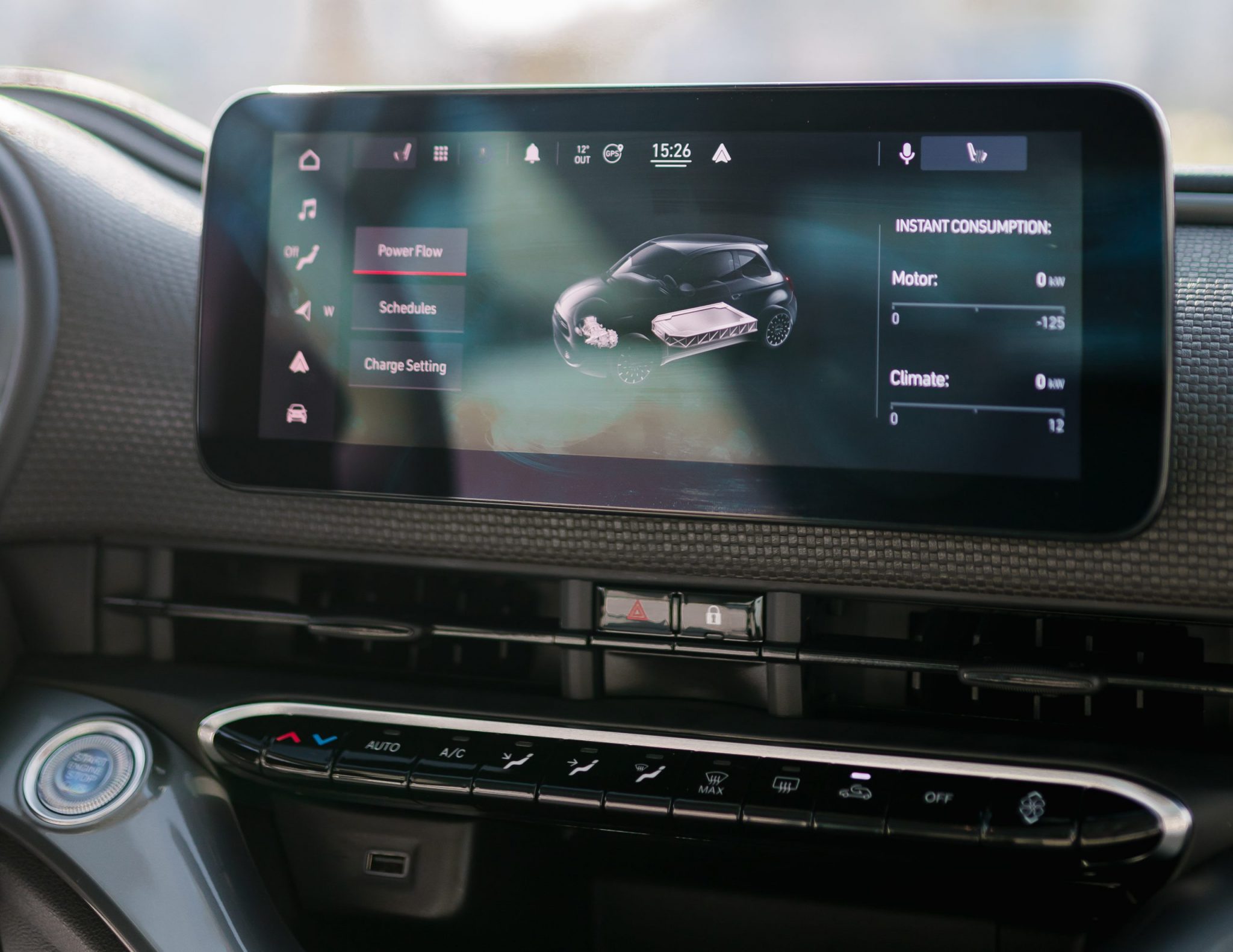 O poschodie nižšie sa nachádza bezdrôtová nabíjačka na telefón, nechýba ani dekor v podobe panorámy Torina. Absentuje štandardný volič prevodovky, ten nahradil pás tlačidiel pre voľbu smeru jazdy. Na samostatnej plávajúcej stredovej konzole, medzi sedadlami, sa nachádza panel s elektrickou ručnou brzdou potenciometrom pre ovládanie hlasitosti a voľbou jazdných režimov.