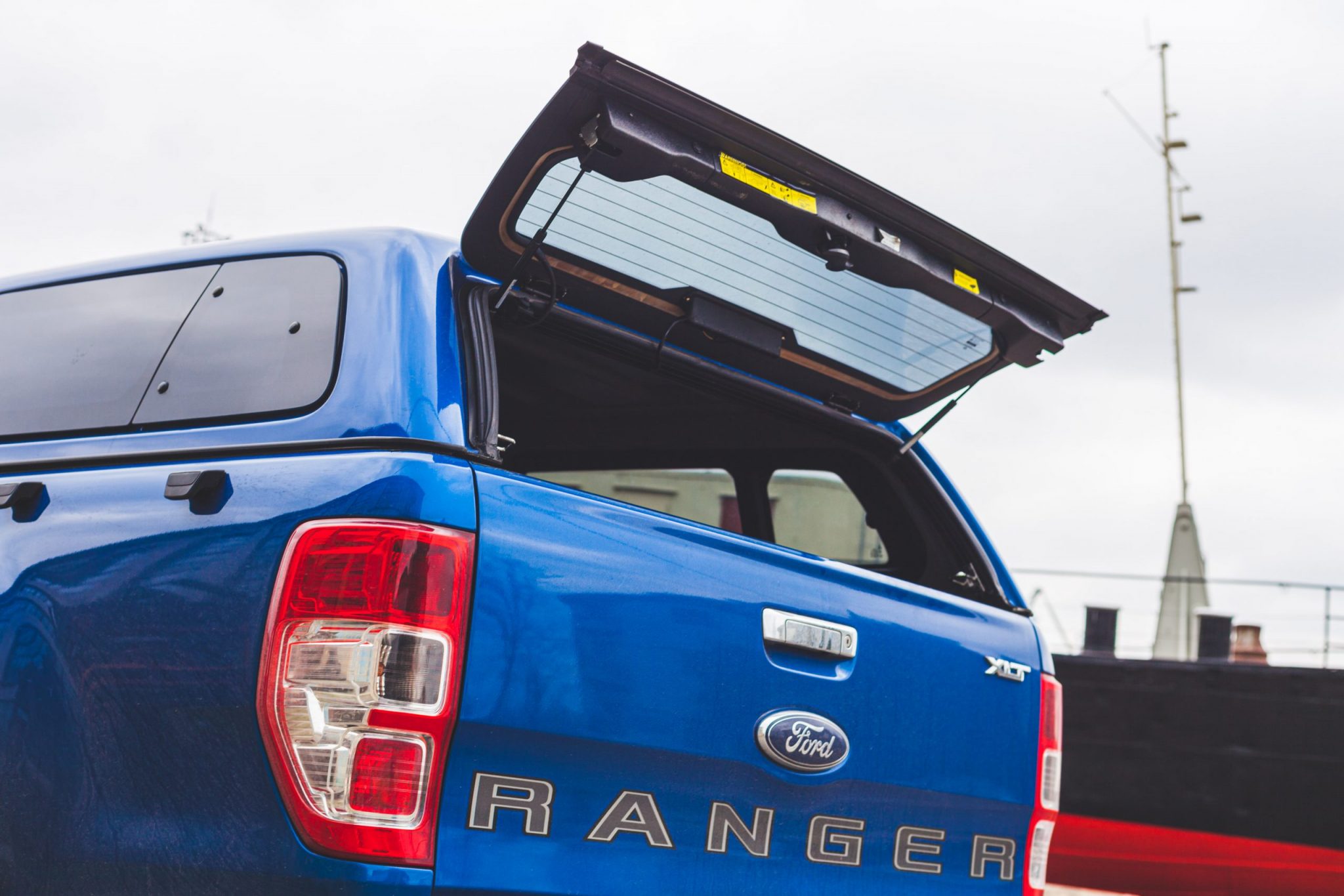 Zadná časť vozidla taktiež prináša na sklopných dverách nakladacieho priestoru veľký nápis Ranger. Nad ťažným zariadením sa nachádza taktiež nástupná plocha. Tá bude užitočná v prípade, že by ste sa rozhodli vstúpiť na obrovskú korbu Rangera. Nami testovaný model bol vybavený ochranným rámom za kabínou. Zadné svetla sú umiestnené vertikálne a sú vsadené viac do zadného blatníka. Testované vozidlo bolo vybavené pneumatikami s poriadnou porciou gumy. Práve preto dokáže spolu s ostatnými systémami Ranger skvele zvládať rôzne typy terénu.