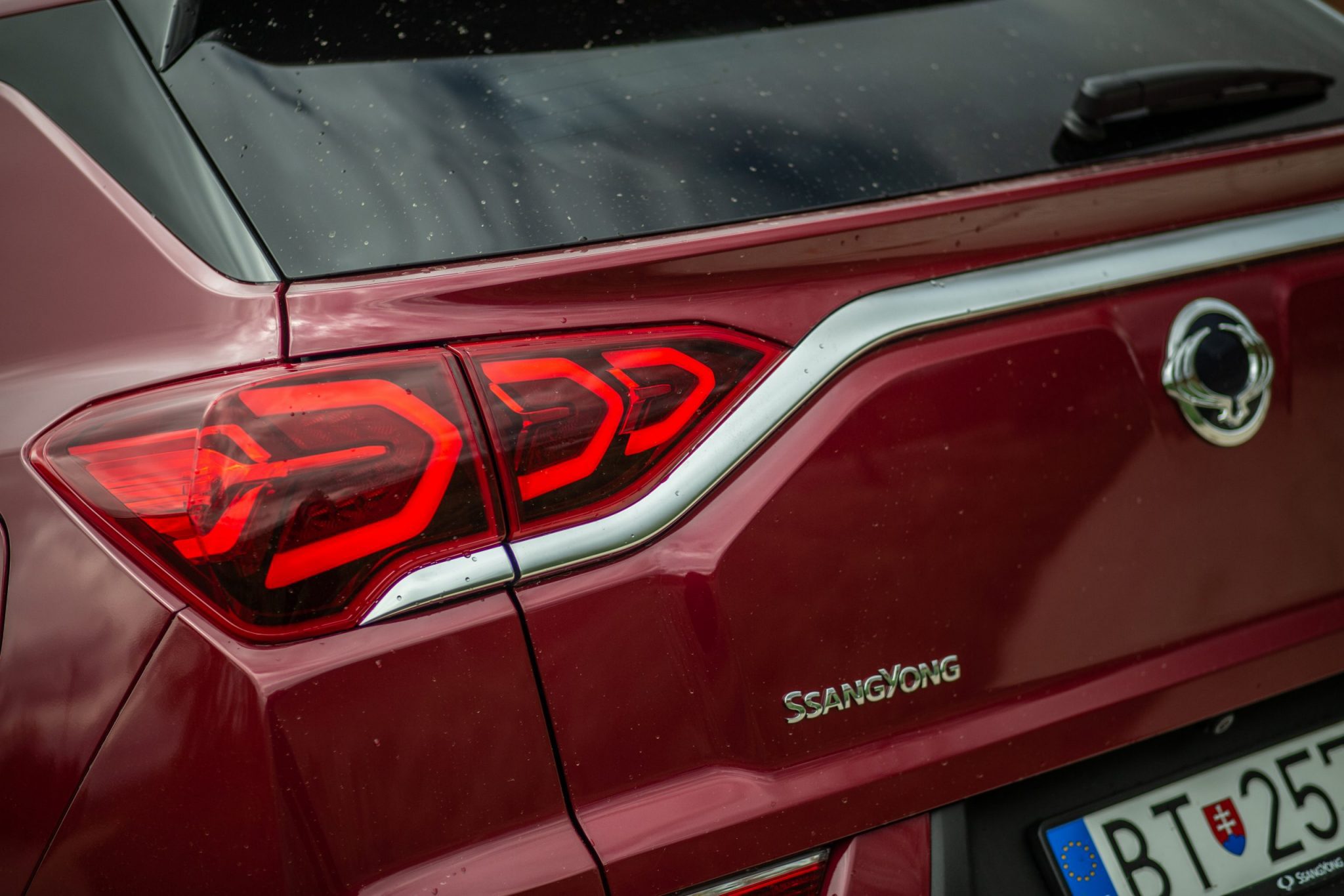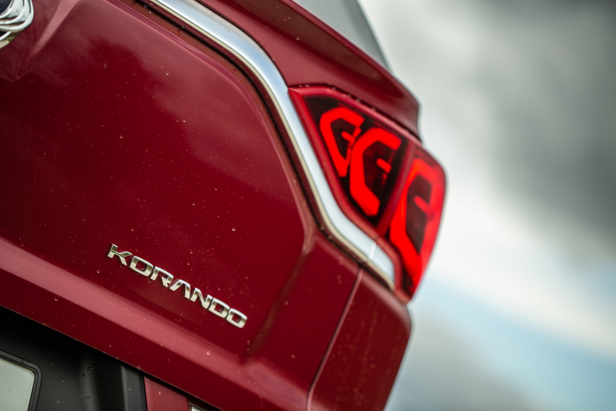 Plynule môžeme prejsť k zadnej časti vozidla. Tej opäť určuje štýl chrómová lišta, ktorá pomyselne spája zadné skupinové svetlá. Zaujímavé je umiestnenie smeroviek v spodnom nárazníku, čo je pravdepodobne štýlom kórejských automobiliek, no nie úplne zbehlých šoférov to môže celkom zmiasť. Zadné okno dostalo decentný strešný spojler, ktorý spĺňa svoju estetickú a pravdepodobne aj aerodynamickú funkciu. Celkovo tak Korando pôsobí veľmi komplexne a jeho dizajn je jasne ucelený a uhladený.