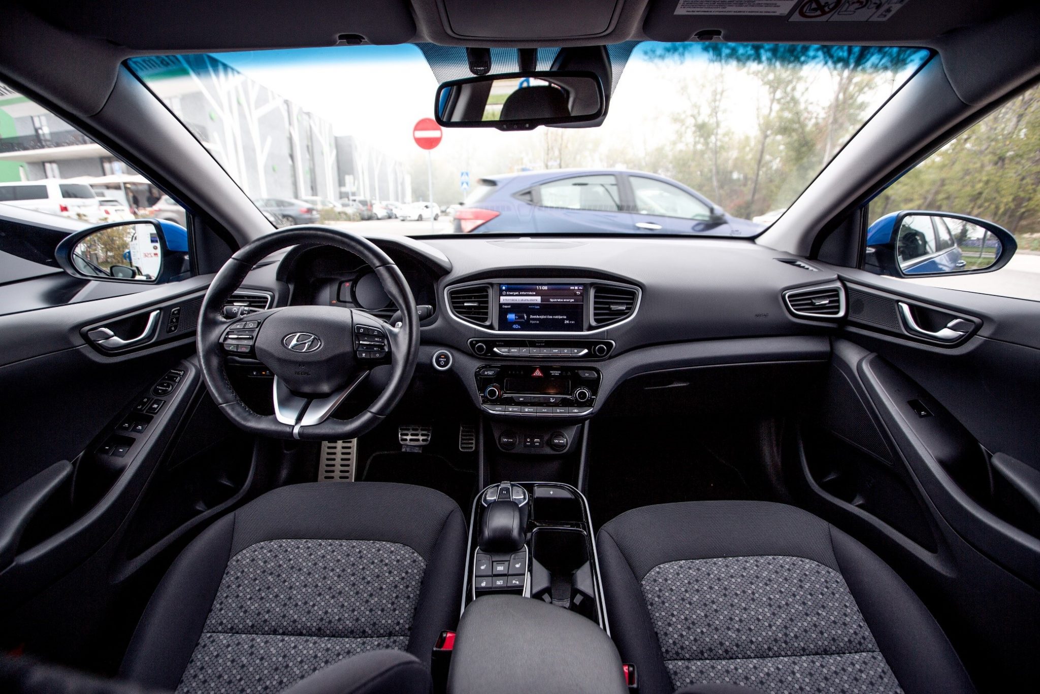 Interiér Ioniqu nám zásadne pripomínal menši hatchback i30, vypracovanie je totožne, posed za volantom hodnotíme taktiež pozitívne miesta vzadu je dostatok aj pre vyšších pasažierov no Octaviu nečakajte. Odkladacích priestorov je dostatok. S batožinovým priestorom to vôbec nieje zlé jeho základná hodnota sa pohybuje na úrovni 455l. Vo výbave nechýbajú prvky ako dažďový a svetelný senzor, adaptívny tempomat, aktívne sledovanie jazdných pruhov, automatické núdzové brzdenie, vyhrievanie zadných sedadiel a vyhrievanie a ventilácia predných sedadiel alebo bezkontaktná nabíjačka na telefón.