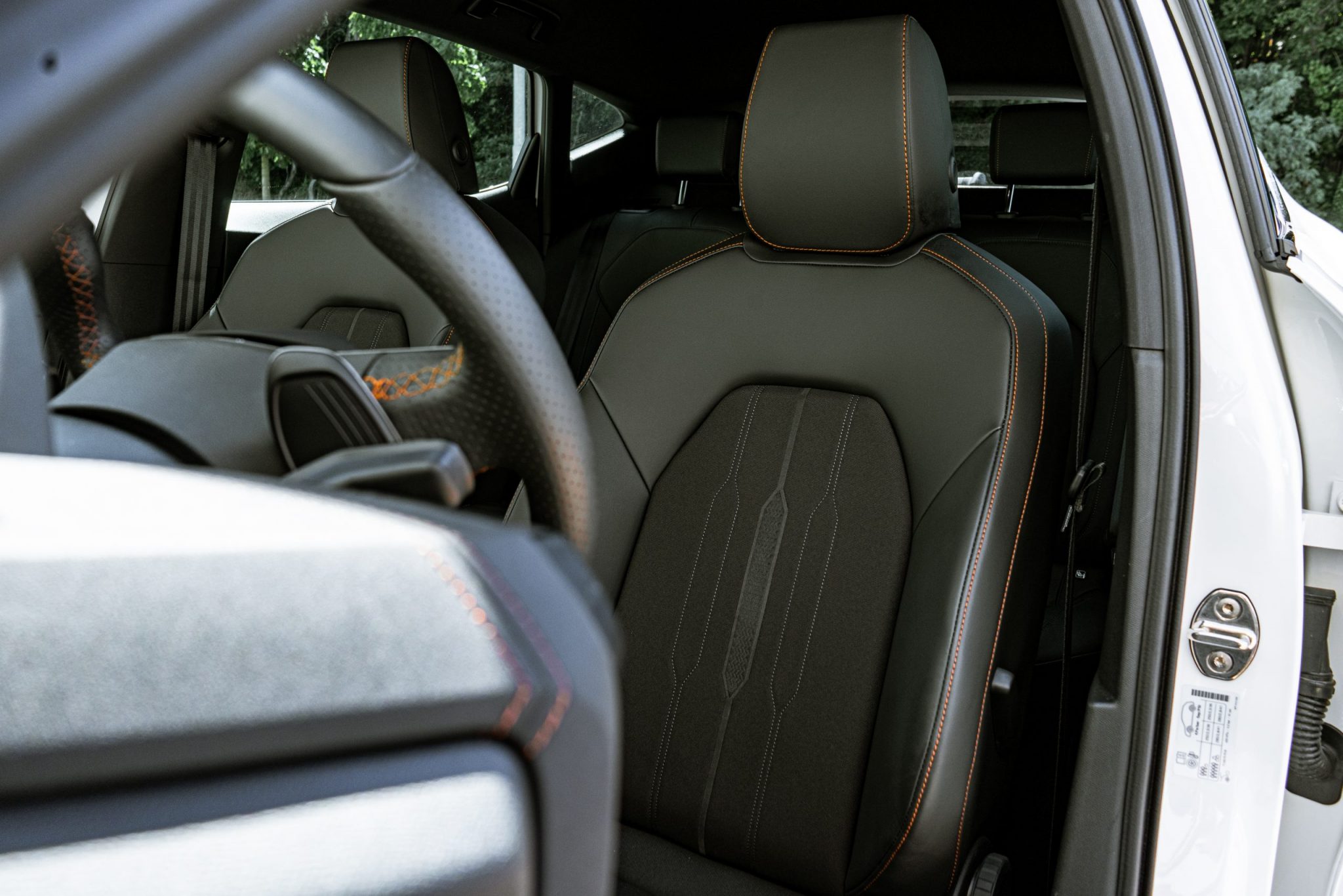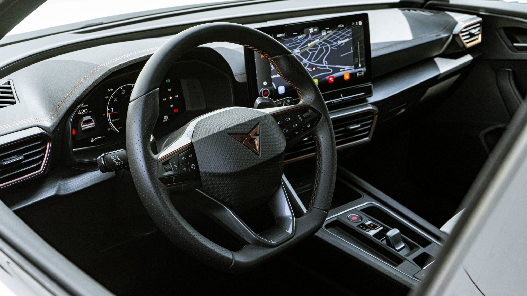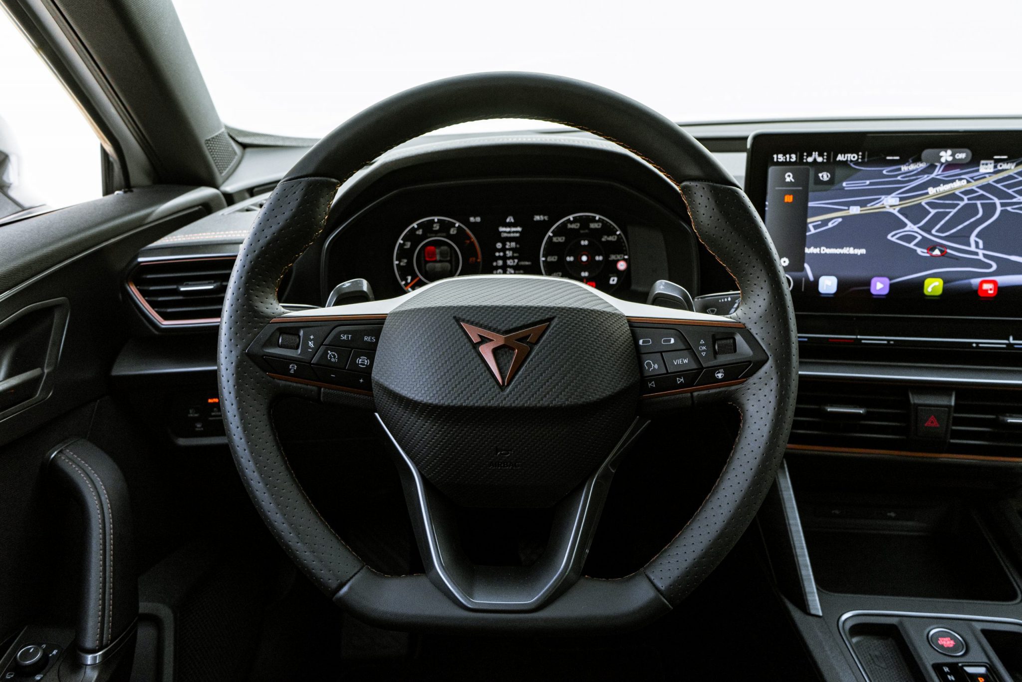Kabína je presne taká, ako ju poznáme. Sedadlá aj v základnejšom Formentore sú dobre tvarované a dokážu vás pekne pohltiť. Keď však sedíte za volantom „úplne na zemi“, nie je šanca, aby ste dokázali vidieť na koniec kapoty. Kapota je extrémne dlhá a nemáte takmer ani pocit, že sa nachádzate vo zvýšenom aute. Naopak, je veľmi príjemné sedieť takto nízko, človek si myslí, že je spojený so zemou. Aj toto poukazuje na športovú DNA značky Cupra.