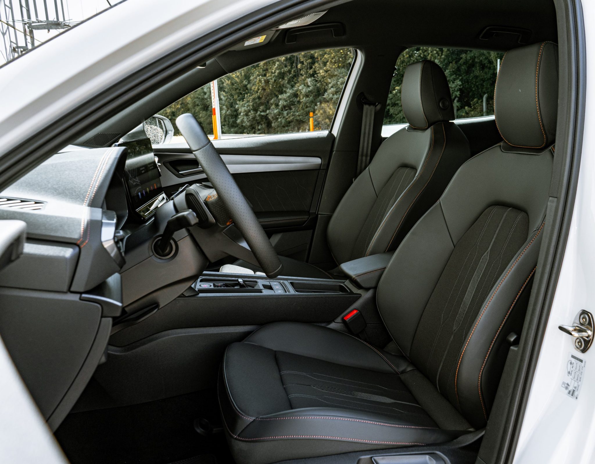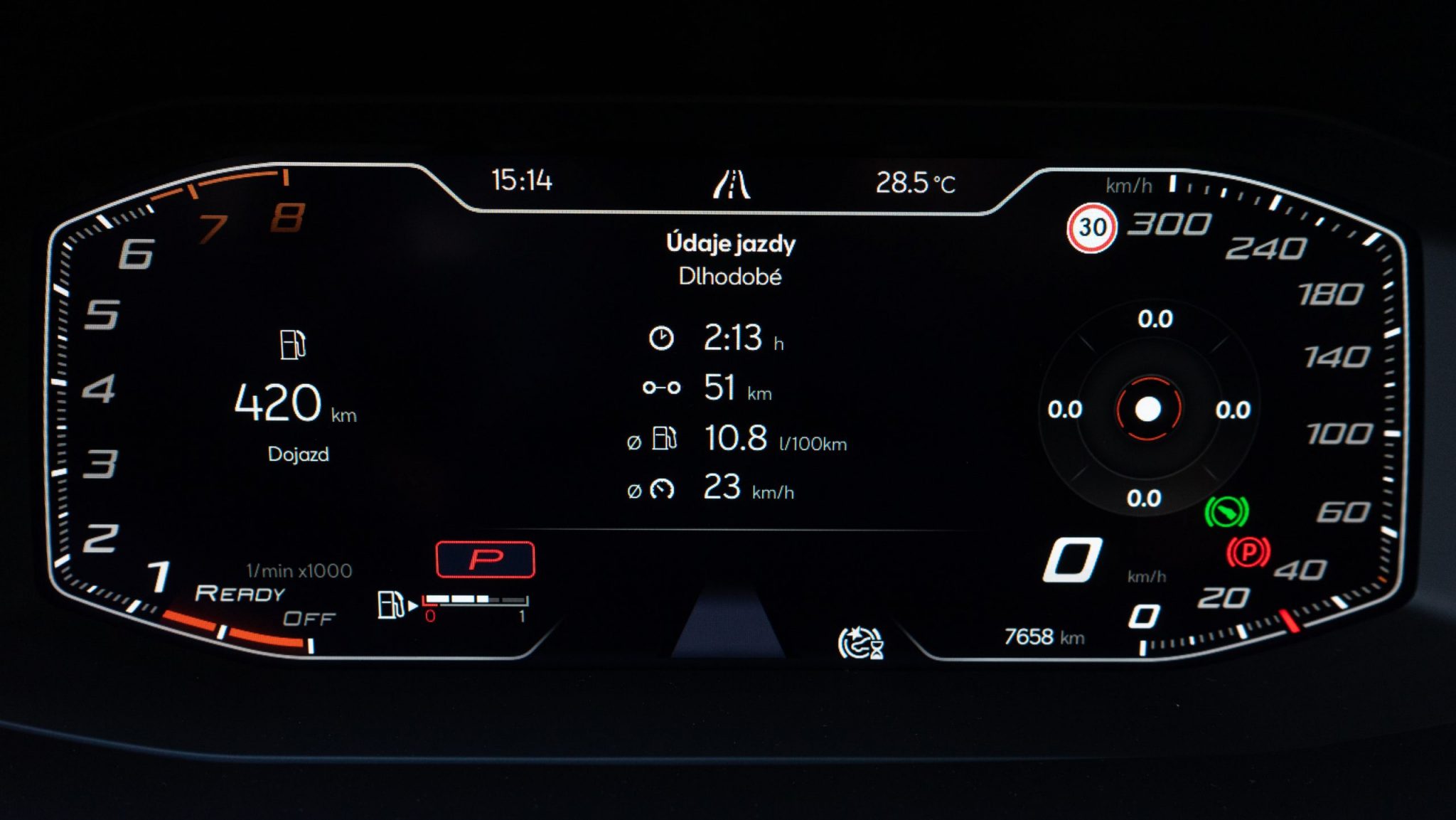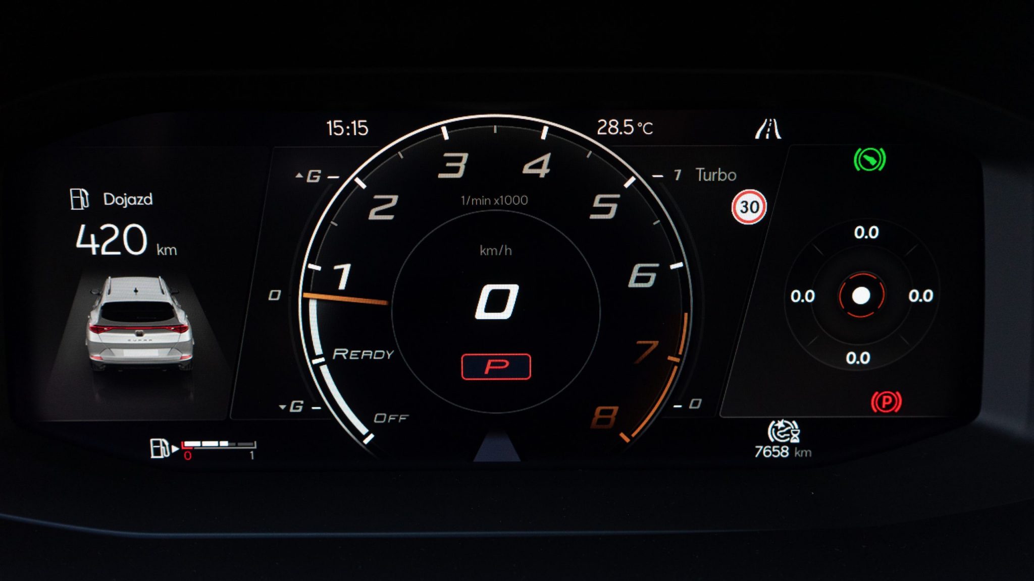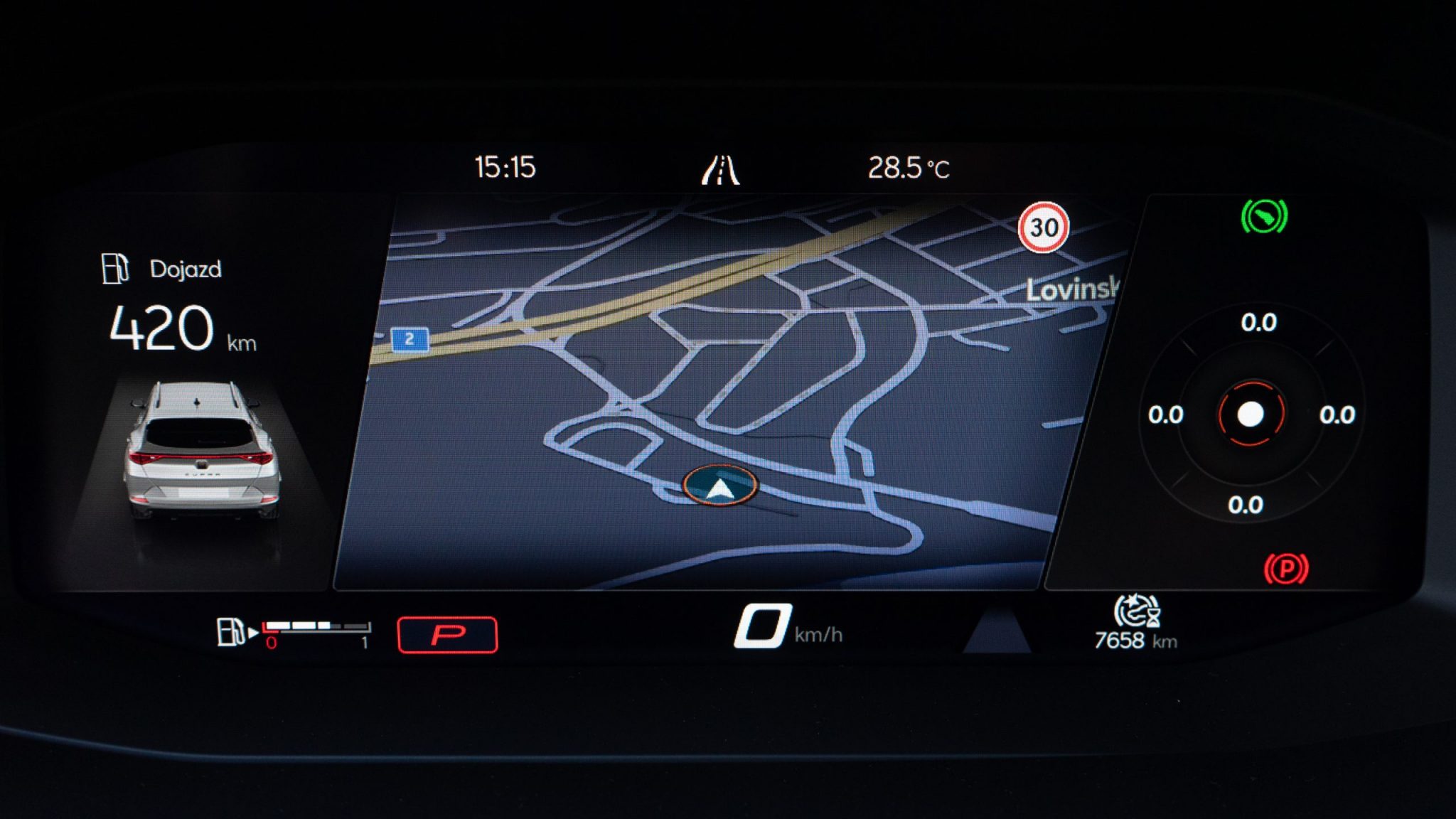 Kabína je presne taká, ako ju poznáme. Sedadlá aj v základnejšom Formentore sú dobre tvarované a dokážu vás pekne pohltiť. Keď však sedíte za volantom „úplne na zemi“, nie je šanca, aby ste dokázali vidieť na koniec kapoty. Kapota je extrémne dlhá a nemáte takmer ani pocit, že sa nachádzate vo zvýšenom aute. Naopak, je veľmi príjemné sedieť takto nízko, človek si myslí, že je spojený so zemou. Aj toto poukazuje na športovú DNA značky Cupra.