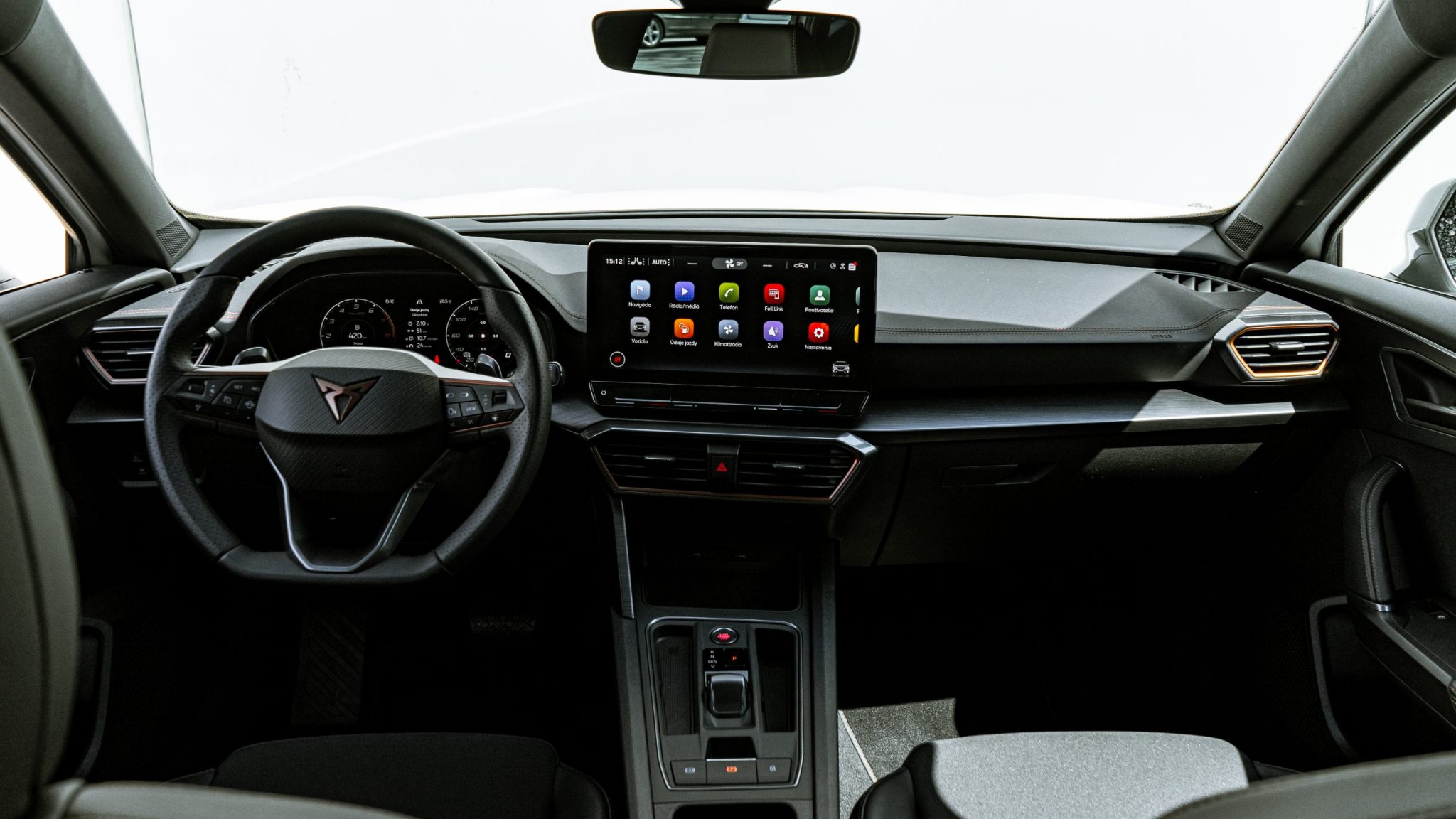 Kabína je presne taká, ako ju poznáme. Sedadlá aj v základnejšom Formentore sú dobre tvarované a dokážu vás pekne pohltiť. Keď však sedíte za volantom „úplne na zemi“, nie je šanca, aby ste dokázali vidieť na koniec kapoty. Kapota je extrémne dlhá a nemáte takmer ani pocit, že sa nachádzate vo zvýšenom aute. Naopak, je veľmi príjemné sedieť takto nízko, človek si myslí, že je spojený so zemou. Aj toto poukazuje na športovú DNA značky Cupra.