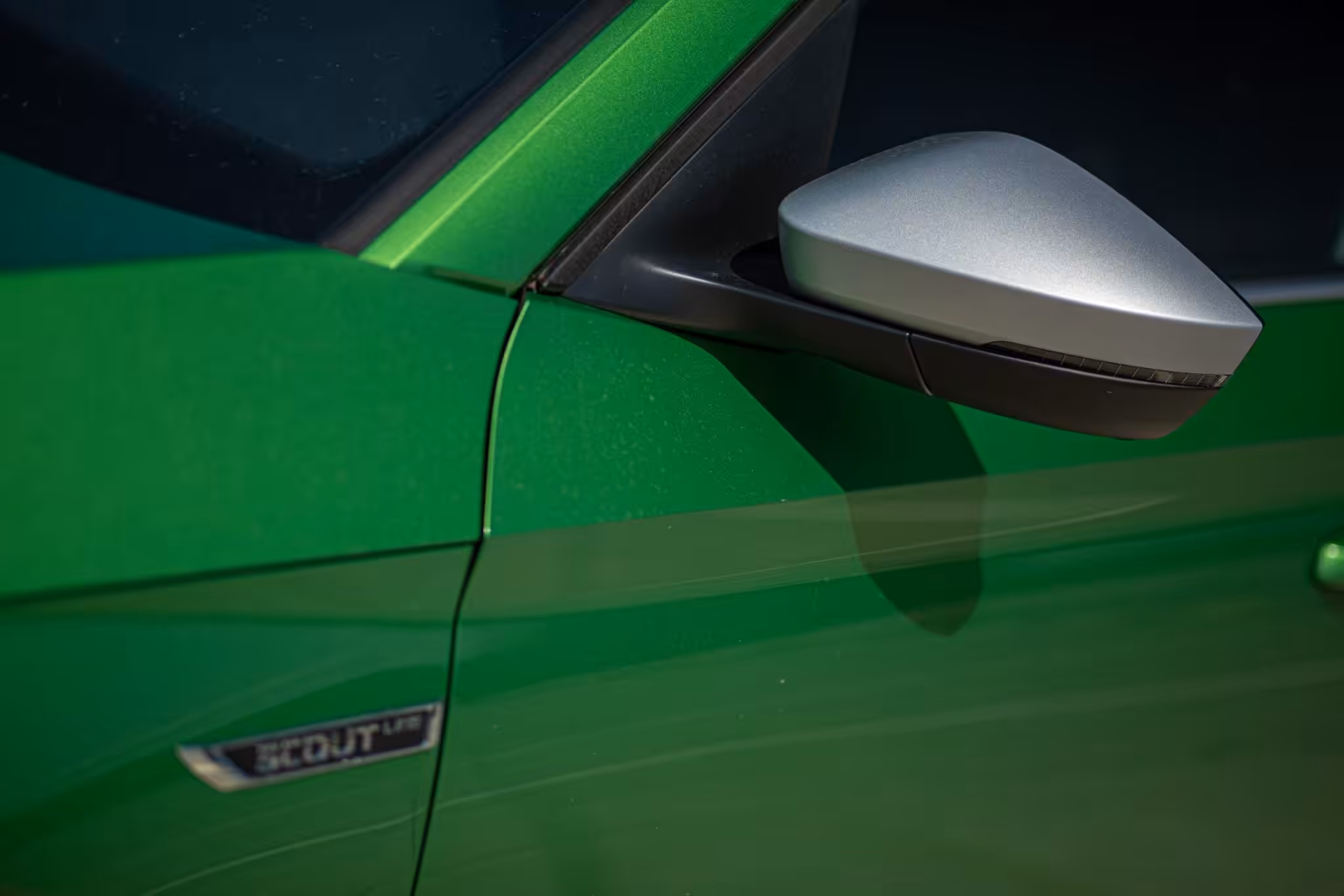 Exteriér je doplnený o plastové lemy blatníkov, ktoré sú akousi modlou výbavy Scoutline. Tie sú doplnené o strieborné nosiče, kryty spätných zrkadiel a plaketky Scoutline. Pekný dojem zanechávajú aj 18“ disky kolies, ktoré sú príplatkové, rovnako aj zelená metalíza Rallye. Osobne, keby si má vybrať Kamiq, tak rozhodne zvolím farbu, ktorá dokáže toto auto rozžiariť tak, aby nesplývala s okolím. Zelená farba má určite za mňa bonusových 100 bodov.
