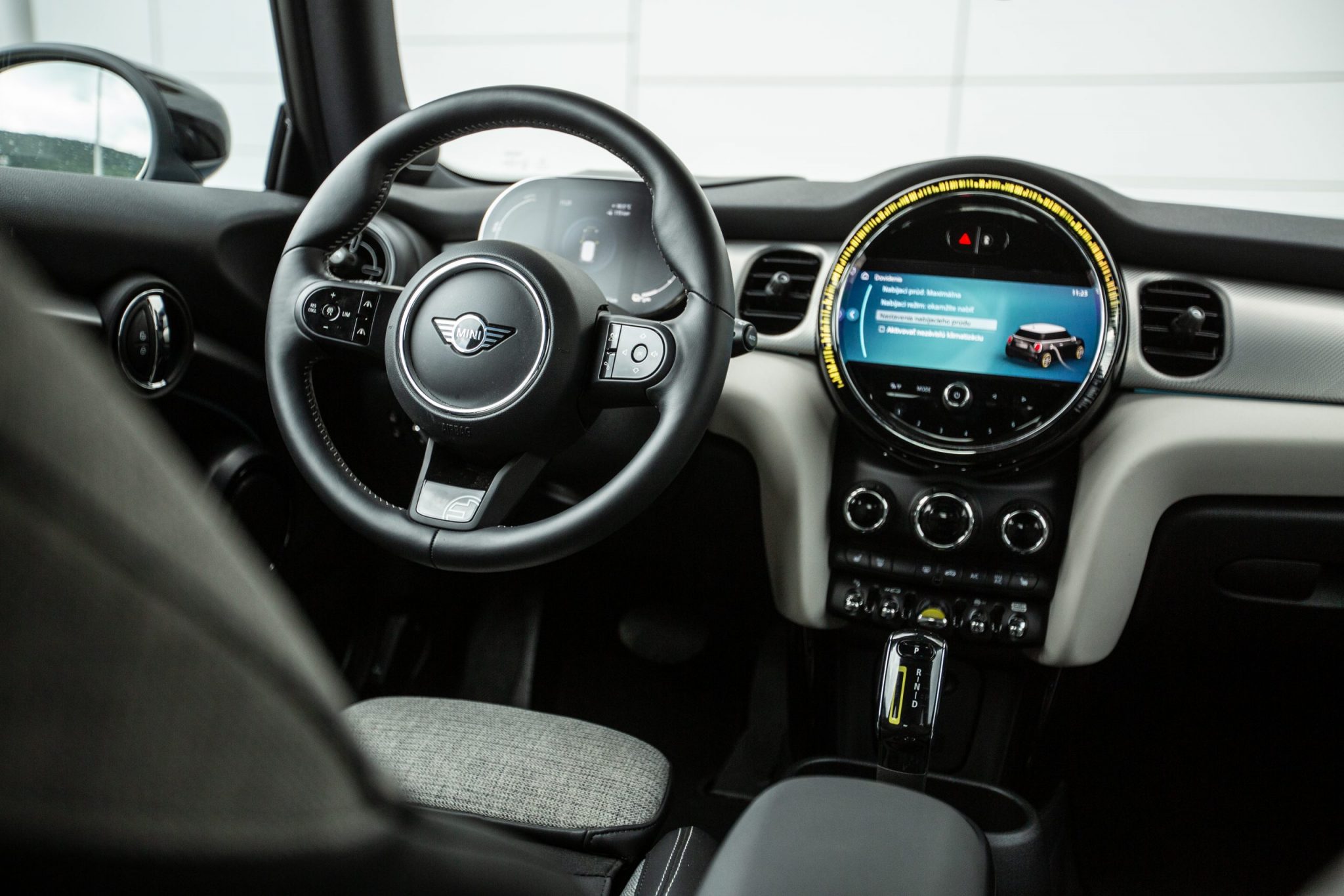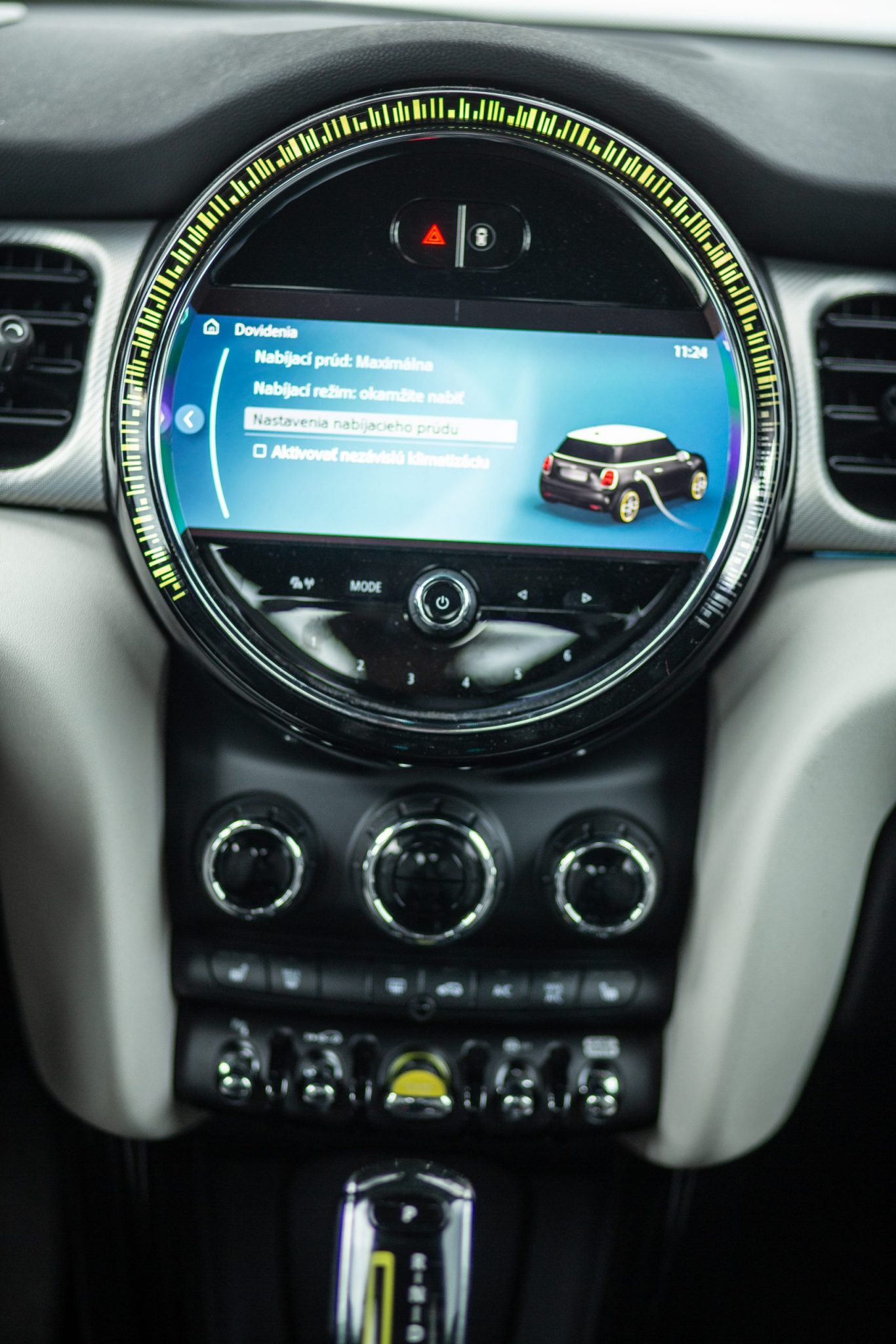 Okrúhla stredová konzola je pre MINI akousi modlou. Reálne ani ja sám si neviem predstaviť MINI bez tohto stredu. V strede je teda 8,8“ dotykový displej s navigáciou. Tá ukazuje aj čerpacie stanice, no počas cesty s nimi nevie rátať.. Je to škoda, lebo ukázať nejakú čerpaciu stanicu v okolí už nemusí byť tak zložite. Každému predsa ide o komfort a vodiči práve takúto maličkosť považujú za najideálnejšiu.