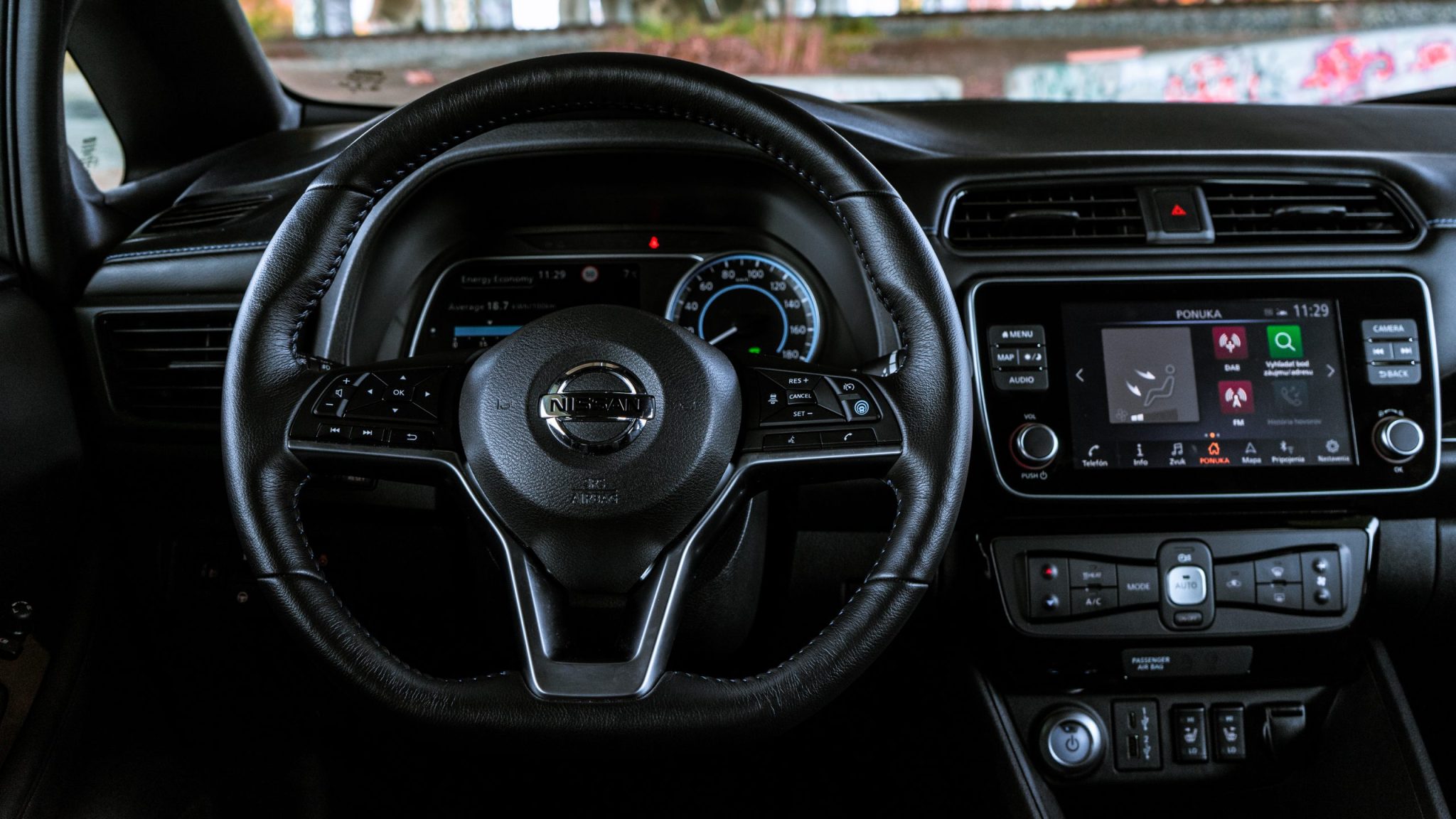 Leaf e+ je tak teda vďaka slušnému výkonu v podstate živé auto s dobrou akceleráciou. Ak teda porovnávame akceleráciu s ostatnými elektrickými vozidlami. Ak sa teda rozhodnete porážať na semaforoch iné konvenčné automobily, v Nissane Leaf máte dosť dobrého parťáka. Jeho riadenie je veľmi príjemné a jednoduché a aj keď sa volant má správne držať oboma rukami, zvládnete to aj jedným prstom. Pri pohľade na jazdné režimy nie je Nissan úplným štandardom. To znamená asi toľko, že v Leafe nenájdete žiaden režim Sport. Jediná možnosť je tlačidlom pod ľavým výduchom ventilácie prepínať mód ECO alebo Normal. Čo oceníte najmä v zimných mesiacoch, pri tlačidle ECO sa nachádza aj výhrev volantu.