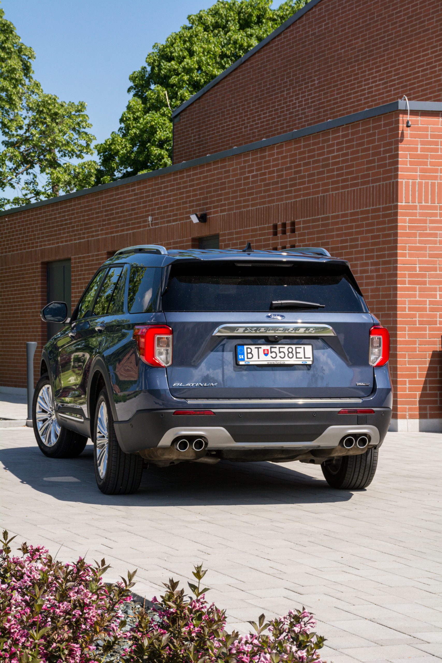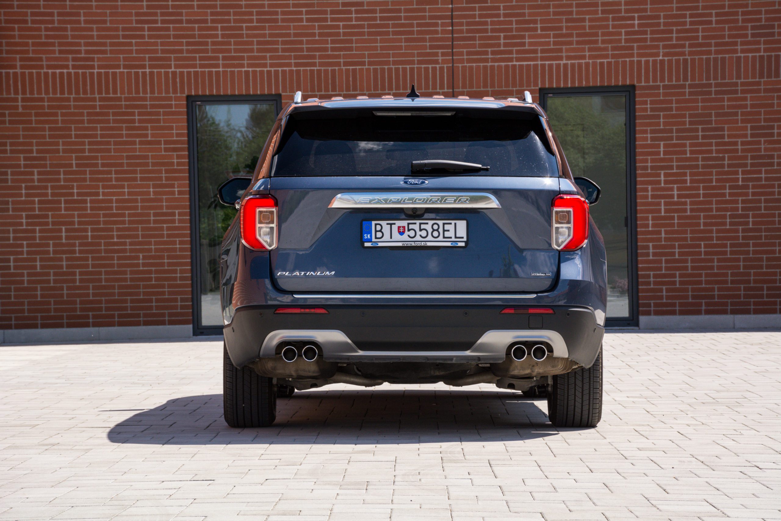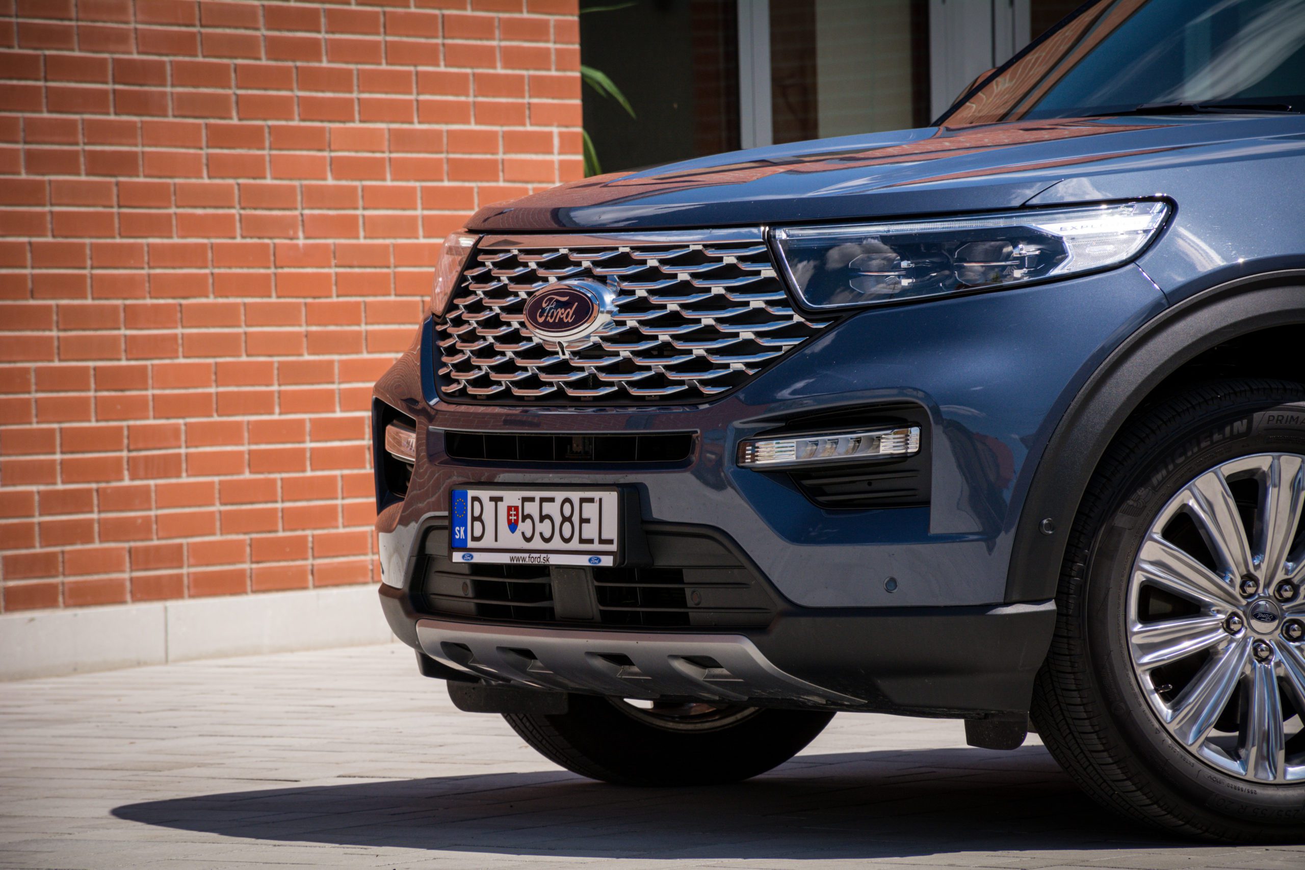 Prednej časti, v našej výbave Platinum, dominuje masívna chrómová maska, ktorá sa mi osobne nepozdáva a zvolil by som skôr čiernu z verzie ST-Line. Tieto dve verzie sú zároveň jedinými výbavovými stupňami u nás. Vďaka zaujímavo tvarovanej bočnej siluete stúpajúcej nahor a negatívnemu C stĺpiku pôsobí Explorer kratšie aj napriek obrovským rozmerom. Atletický výzor umocňuje aj široký postoj či samotná štvorica skutočných koncoviek výfukovej sústavy. Samotné svetlomety pôsobia akoby disponovali pokročilou Matrix funkciou, bohužiaľ sa jedná len o jednoduchší adaptívny parabolický LED systém.