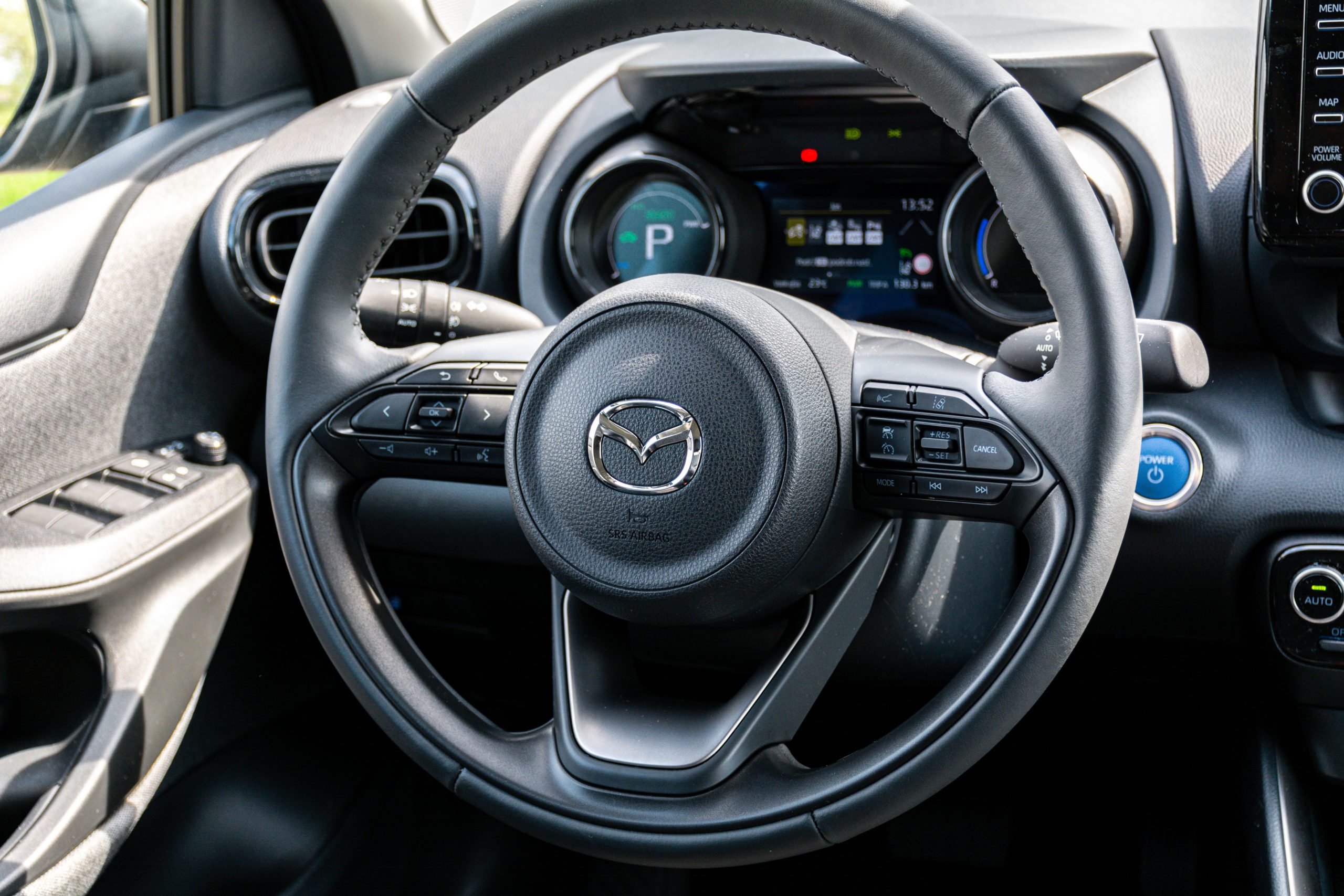 Dizajn Hybridnej verzie je pekný a vo svojom segmente patrí rozhodne k tým najlepším. Prečo ho teda meniť. V rovnakom duchu sa nesie aj interiér, ktorý je prakticky celý prevzatý z modelu Yaris. Výborná ergonómia a ideálne rozloženie ovládačov je pre Toyotu typické podobne ako pre Mazdu. Aj keď v tomto prípade si viem predstaviť aspoň odlišné spracovanie palubnej dosky, respektíve prístrojového štítu. Mazda robí svoje autá predsalen sofistikovanejšie a na hranici s prémiou, to isté platí aj pre systém ovládania infotainmentu. Bohužiaľ Mazda 2 Hybrid sa v tomto duchu nenesie.