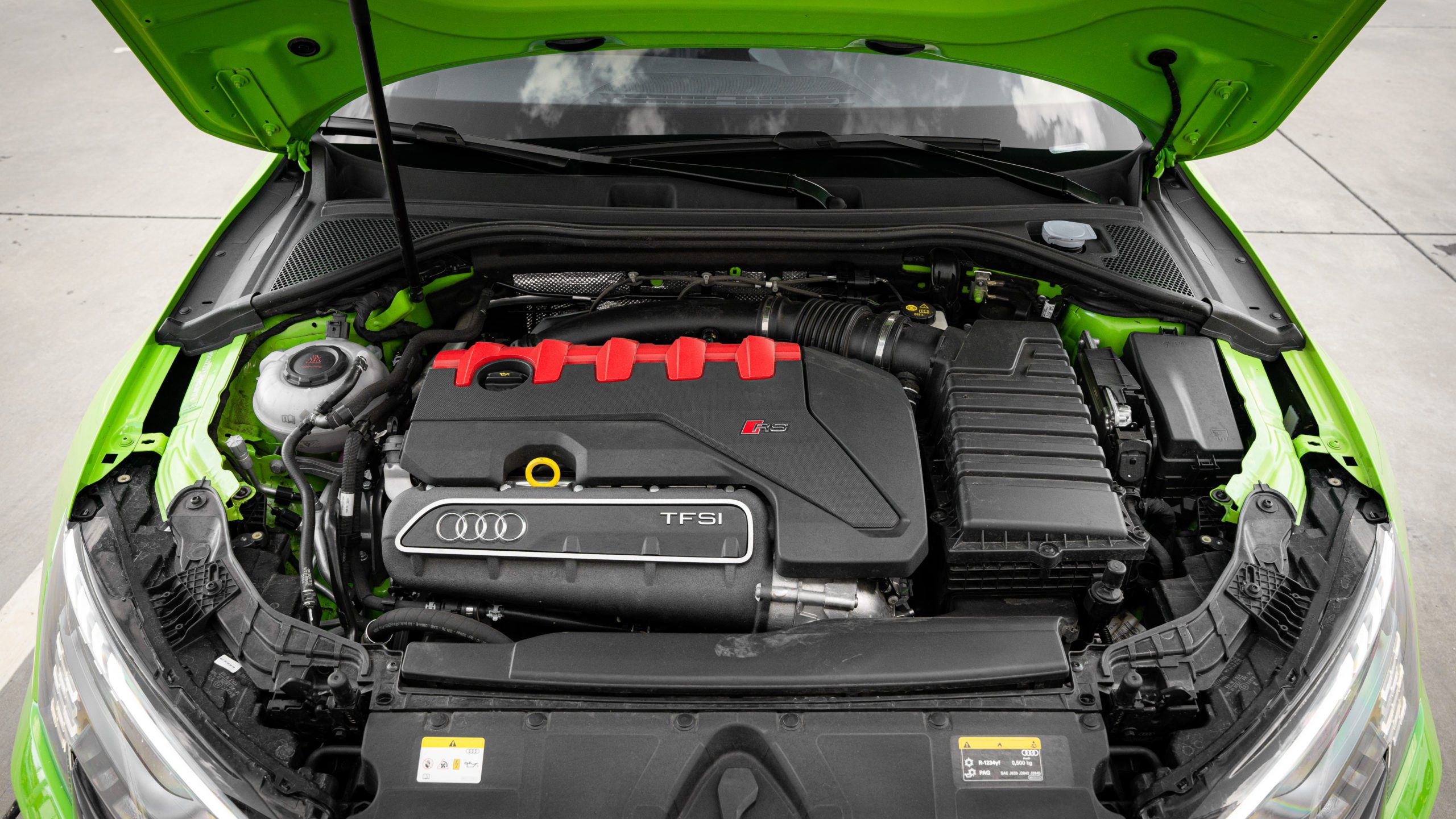 Omnoho zásadnejšie sú však jazdné vlastnosti. Radový päťvalec produkuje 294 kW a krútiaci moment dosahuje rovných 500 Nm. S hmotnosťou zhruba 1650 kg dokáže tento malý Aventador vystreliť na stovku za 3,8 sekundy. V porovnaní s Audi S3 je podvozok nižší, zmenil sa aj rozchod kolies a prepracovaný bol pohon Quattro. Ten dostal vôbec po prvýkrát namiesto zadného diferenciálu dvojicu viaclamelových spojok. Vďaka tejto inovácii je tak možné regulovať krútiaci moment medzi jednotlivými kolesami zadnej nápravy individuálne, a to až v pomere 100:1.