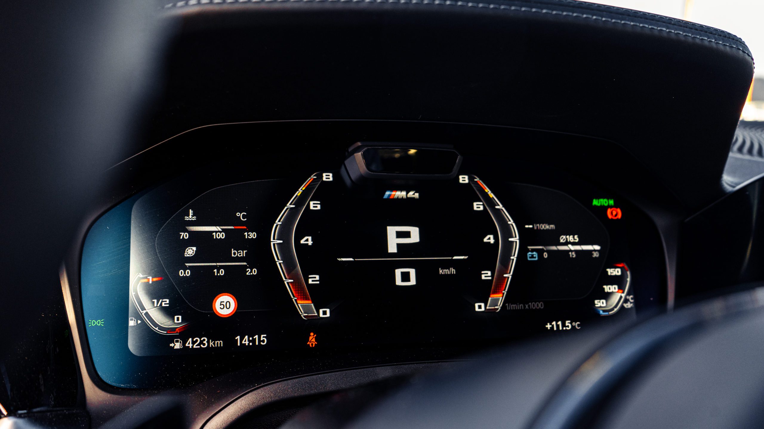 Súčasťou balíka sú tiež karbón-keramické brzdy. Brzdový pedál dovoľuje citlivo dávkovať brzdnú silu a brzdy majú ohromný účinok. Opakovane. Stále. Keď uvážim, že medzigeneračne sa pohotovostná hmotnosť M4 zvýšila o viac ako 200 kg, sú nevyhnutné. Obzvlášť, ak chcete pravidelne chodiť jazdiť na okruhy. Čo s takým autom určite chcete. Chcete ďalší dôvod? Ak na 3-4 sekundy podržíte pedál plynu na podlahe, na head-up displeji zrazu naskakujú také rýchlosti, ktoré by vás bez problémov dostali na facebookovú stránku polície. Kotúče s priemerom 400 mm vpredu a 380 mm vzadu sú istotou, na ktorú sa dá pri nájazde do zákruty vždy spoľahnúť. Kované disky majú v vpredu priemer 19 palcov, vzadu 20-palcov. Táto disharmónia je urobená schválne, v prospech lepších jazdných vlastností. Karbónové lišty v interiéri, karbónové panely na volante a karbónové pádla pod volantom sú už potom len takou povestnou čerešničkou na torte.