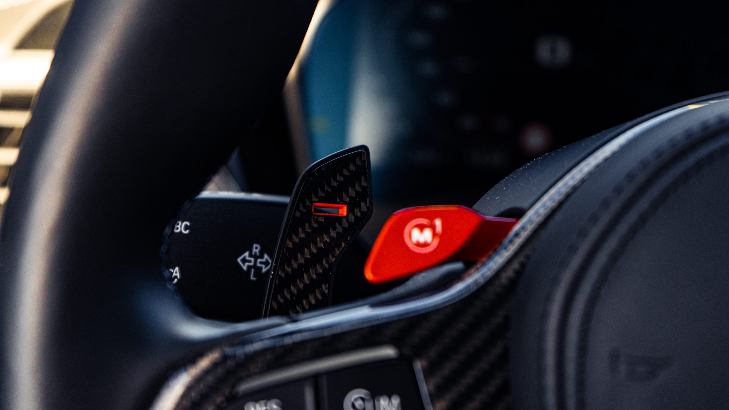 Súčasťou balíka sú tiež karbón-keramické brzdy. Brzdový pedál dovoľuje citlivo dávkovať brzdnú silu a brzdy majú ohromný účinok. Opakovane. Stále. Keď uvážim, že medzigeneračne sa pohotovostná hmotnosť M4 zvýšila o viac ako 200 kg, sú nevyhnutné. Obzvlášť, ak chcete pravidelne chodiť jazdiť na okruhy. Čo s takým autom určite chcete. Chcete ďalší dôvod? Ak na 3-4 sekundy podržíte pedál plynu na podlahe, na head-up displeji zrazu naskakujú také rýchlosti, ktoré by vás bez problémov dostali na facebookovú stránku polície. Kotúče s priemerom 400 mm vpredu a 380 mm vzadu sú istotou, na ktorú sa dá pri nájazde do zákruty vždy spoľahnúť. Kované disky majú v vpredu priemer 19 palcov, vzadu 20-palcov. Táto disharmónia je urobená schválne, v prospech lepších jazdných vlastností. Karbónové lišty v interiéri, karbónové panely na volante a karbónové pádla pod volantom sú už potom len takou povestnou čerešničkou na torte.