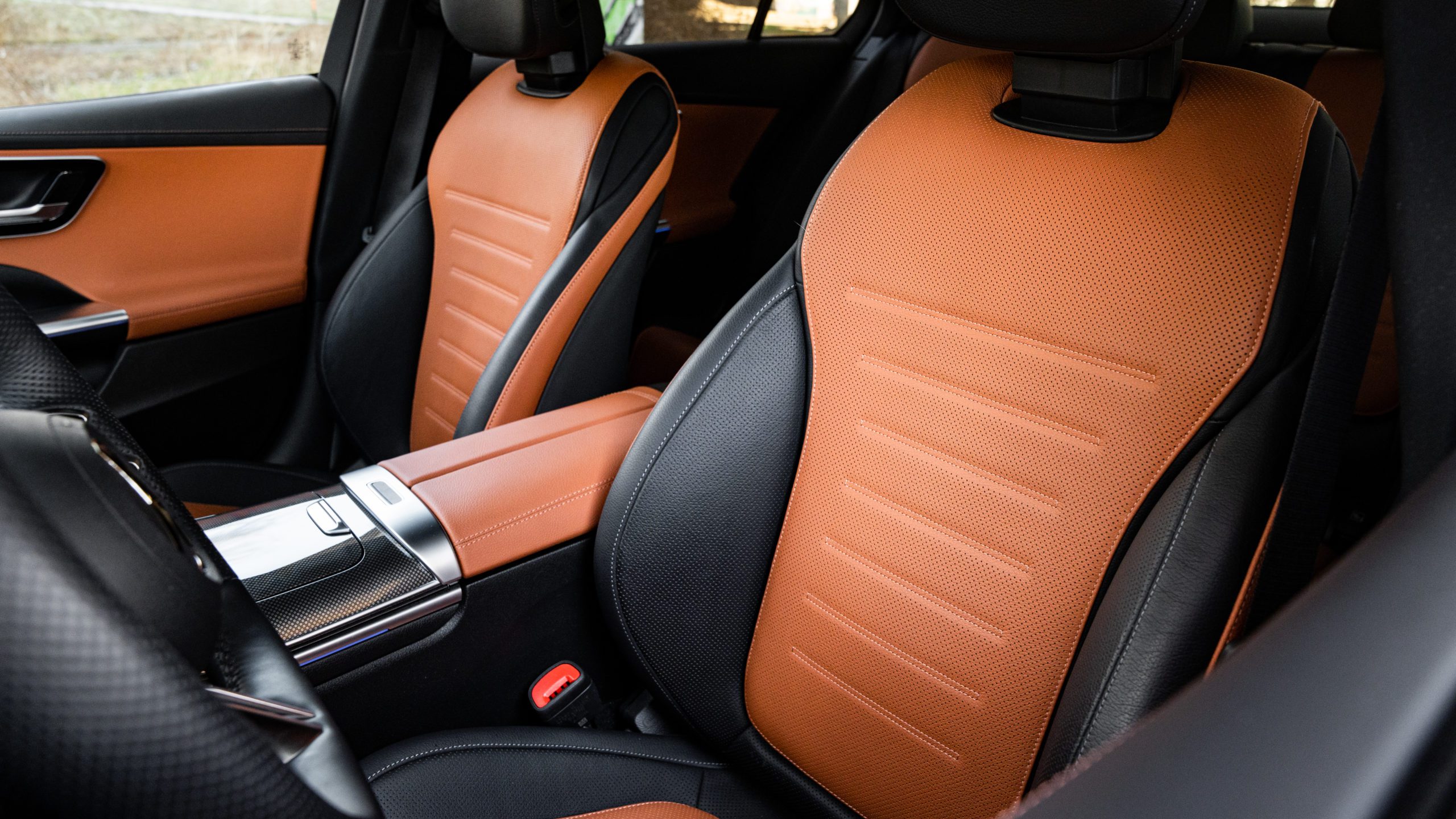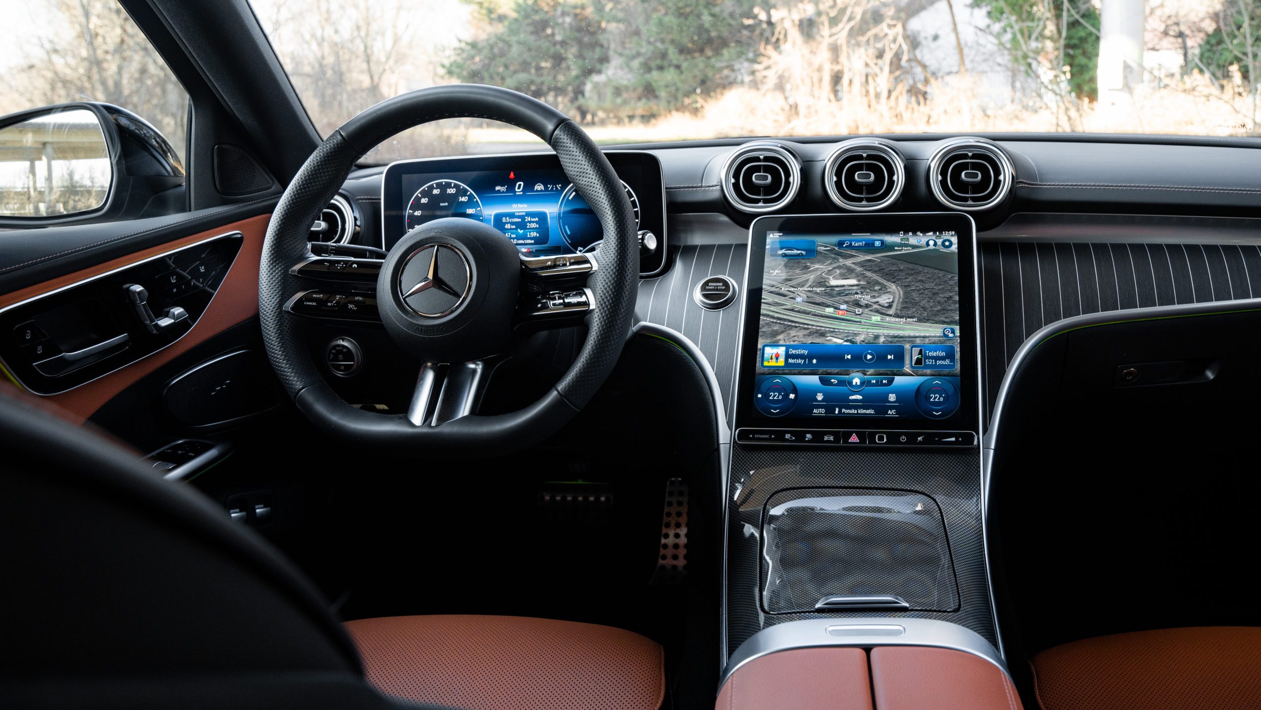Mercedes-Benz C400e je doslova posiaty kamerami. Kým jedna je v nárazníku, v oblasti čelného okna sú až tri. Vozidlo je preto nielen bezpečné, ale do určitej miery aj autonómne. V prípade sedanu sú svietidlá po prvýkrát dvojdielne. Funkcie osvetlenia sú rozdelené na svietidlá na boku a na veku batožinového priestoru. Prednú časť zdobí maska chladiča typická pre značku. Všetky modely disponujú centrálnou hviezdou. Vyhotovenie a charakter masky chladiča sa líši v detailoch.