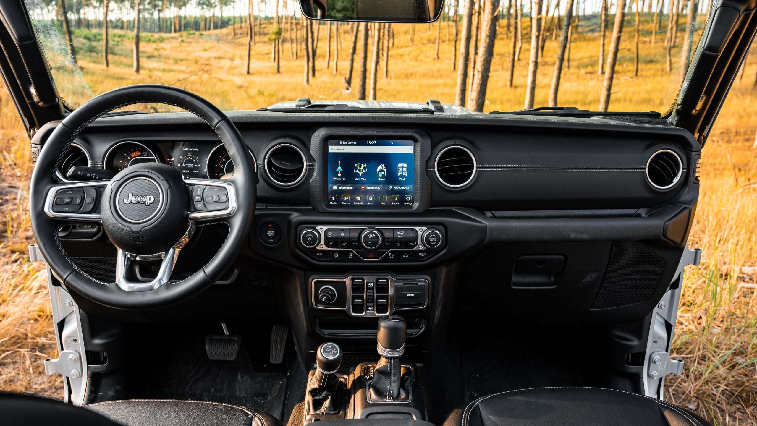Bláznivé sú aj nájazdové uhly. Nájazdový je 41 stupňov, prechodový 18,5 a odjazdový 25 stupňov. Ale poďme aj k pohonu. Trojlitrová naftová “vé-šestka” ponúkne 264 koní a 600 Nm, ktoré na kolesá putujú cez 8-stupňovú prevodovku od firmy ZF. Táto sila zabezpečuje zrýchlenie z nuly na stovku za 8,6 sekundy a ťažnú kapacitu 2722 kg. Poviete si, že to musí žrať aj trávu pri ceste. Opak je pravdou, na diaľnici sme sa dokázali držať aj pod siedmymi litrami, čo je na túto masu extrémne číslo. Gladiator dokonca ponúka každodennú využiteľnosť. Korba má na dĺžku 1,5 metra. Za aj pod zadnými sedadlami sa nachádza úložný priestor a keď sa niečo zašpiní, všetko je navrhnuté tak, aby ste to jednoducho umyli. Všetky dôležité ovládacie prvky môžete ovládať aj v rukaviciach.
